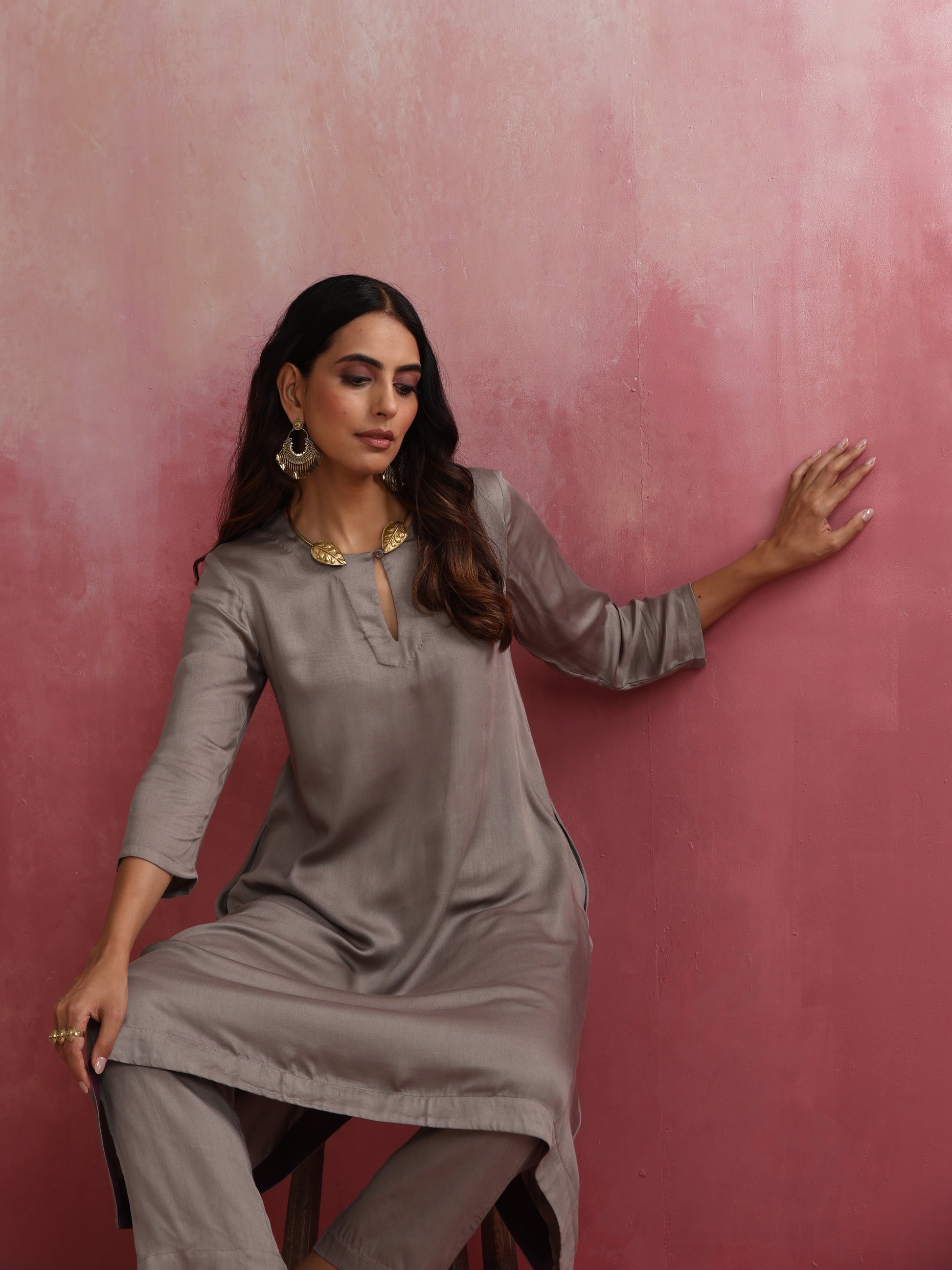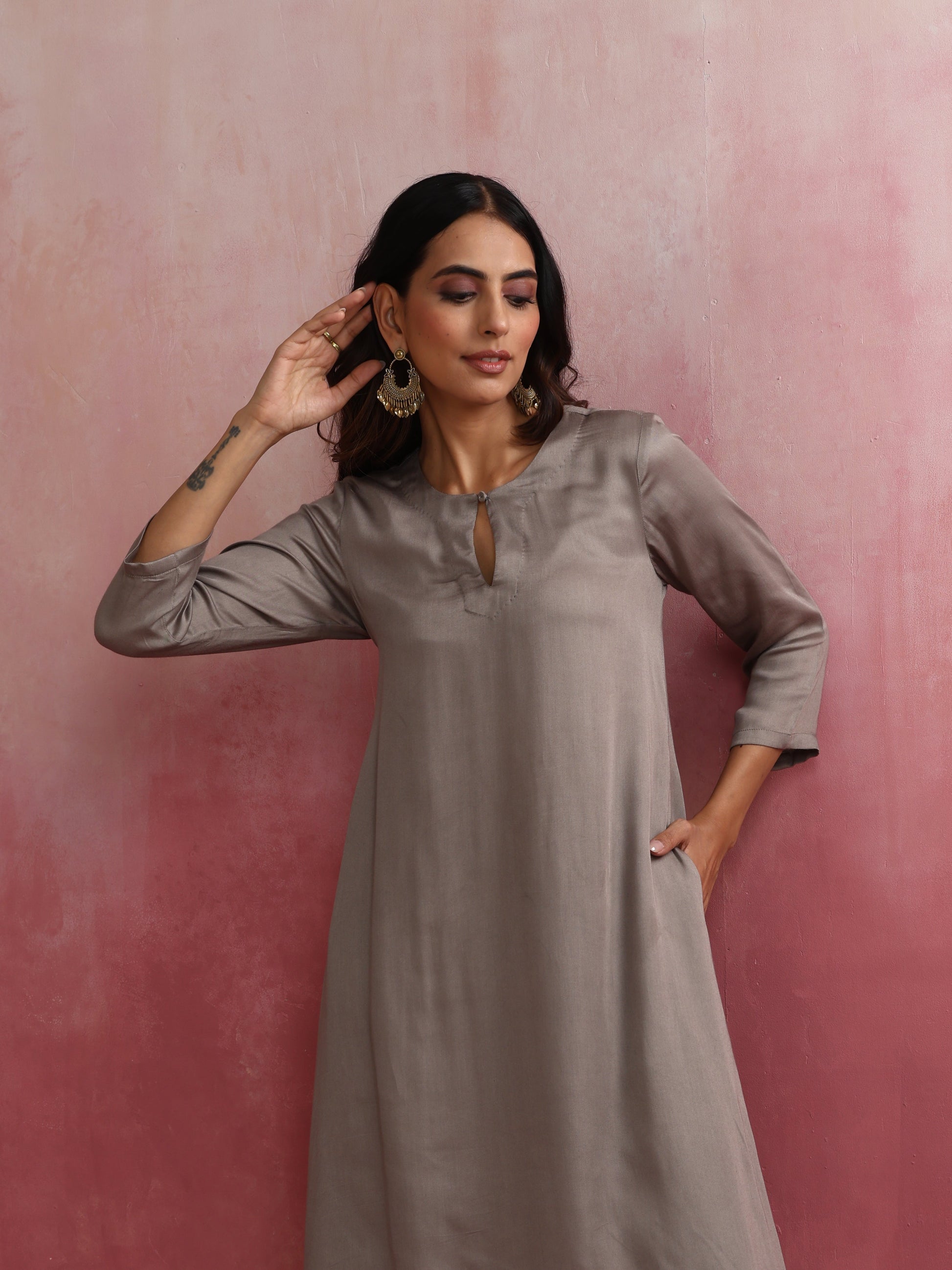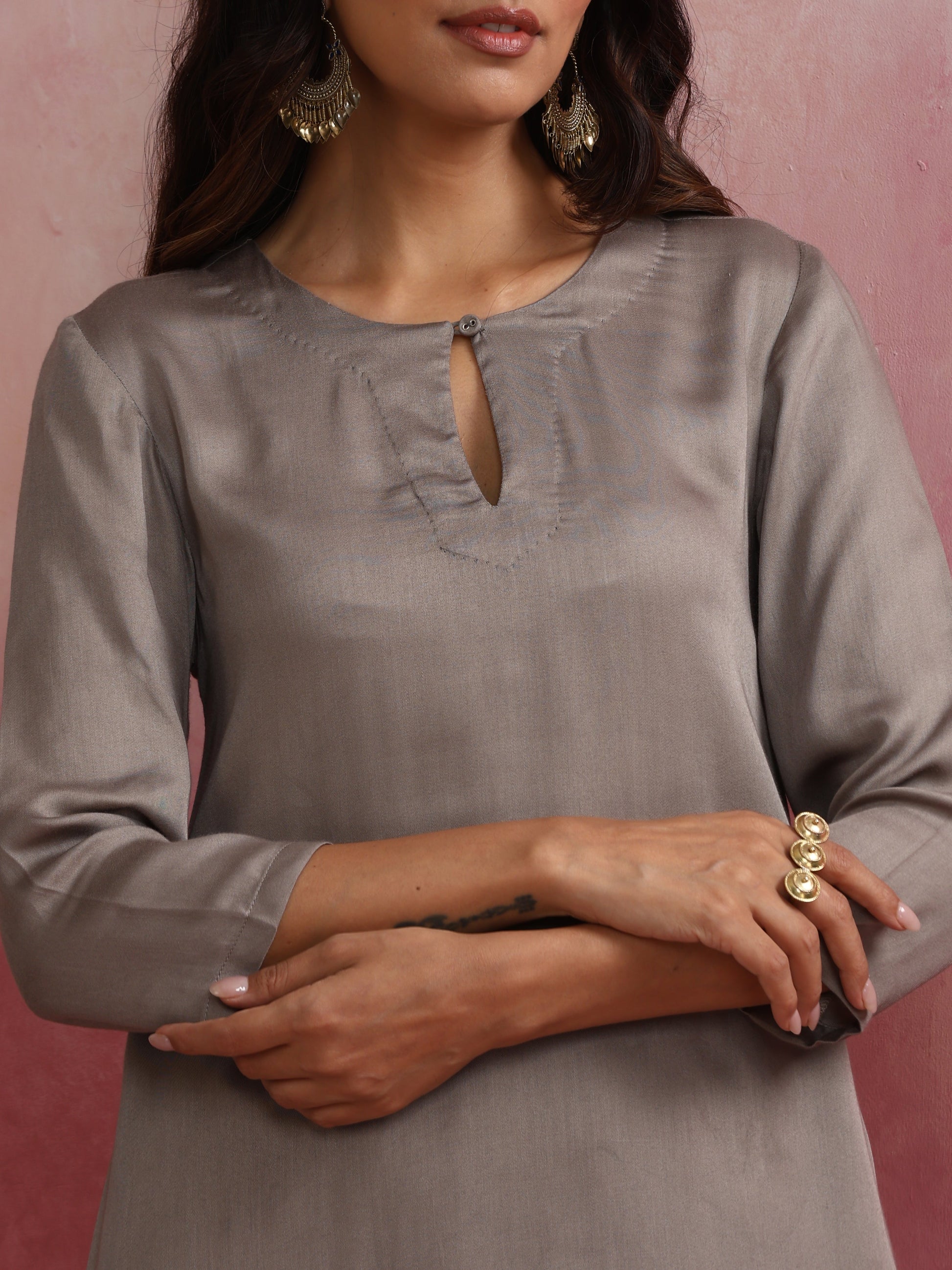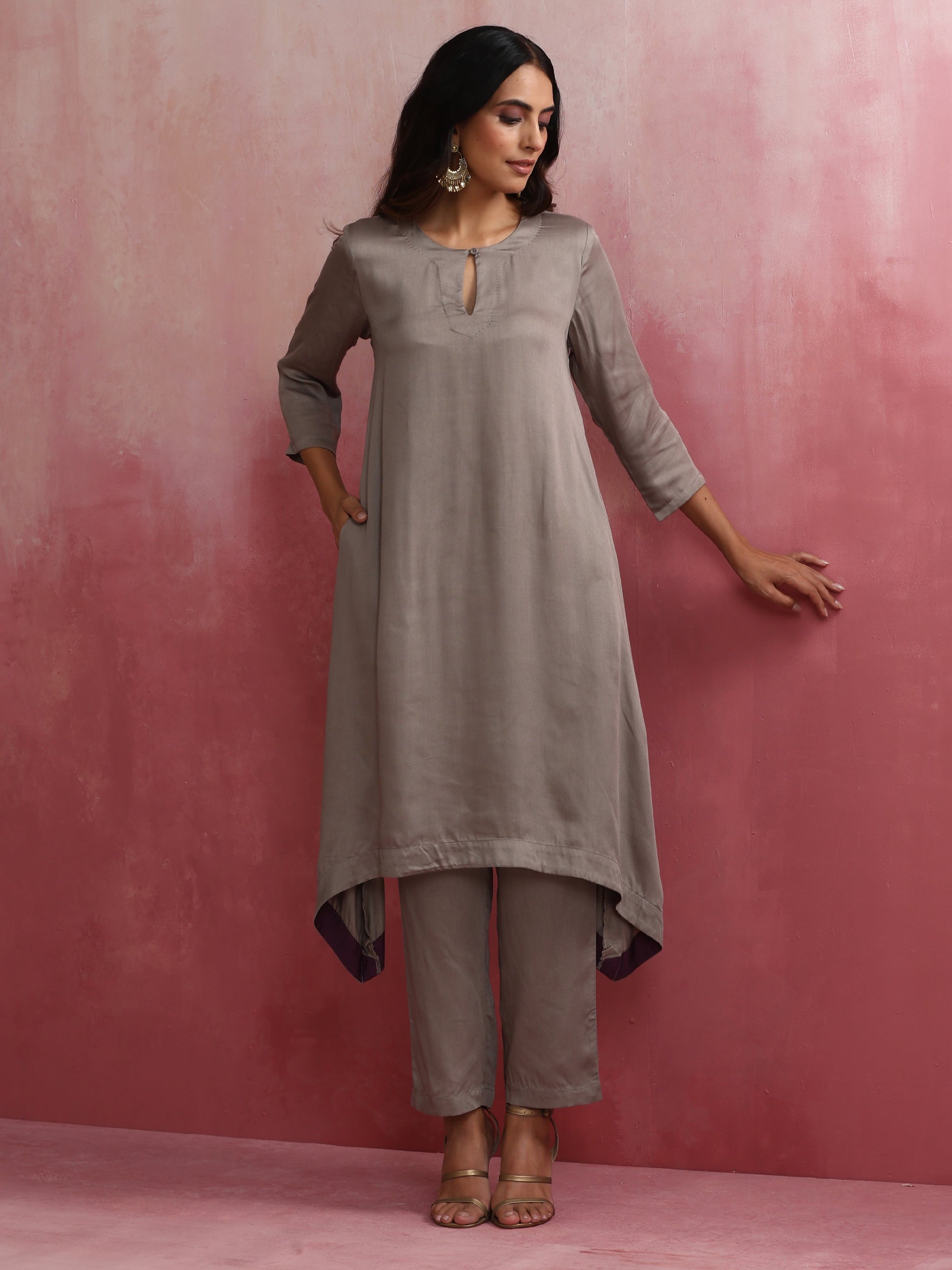 - Elevate your style with this grey modal high low kurta featuring round neck with keyhole.