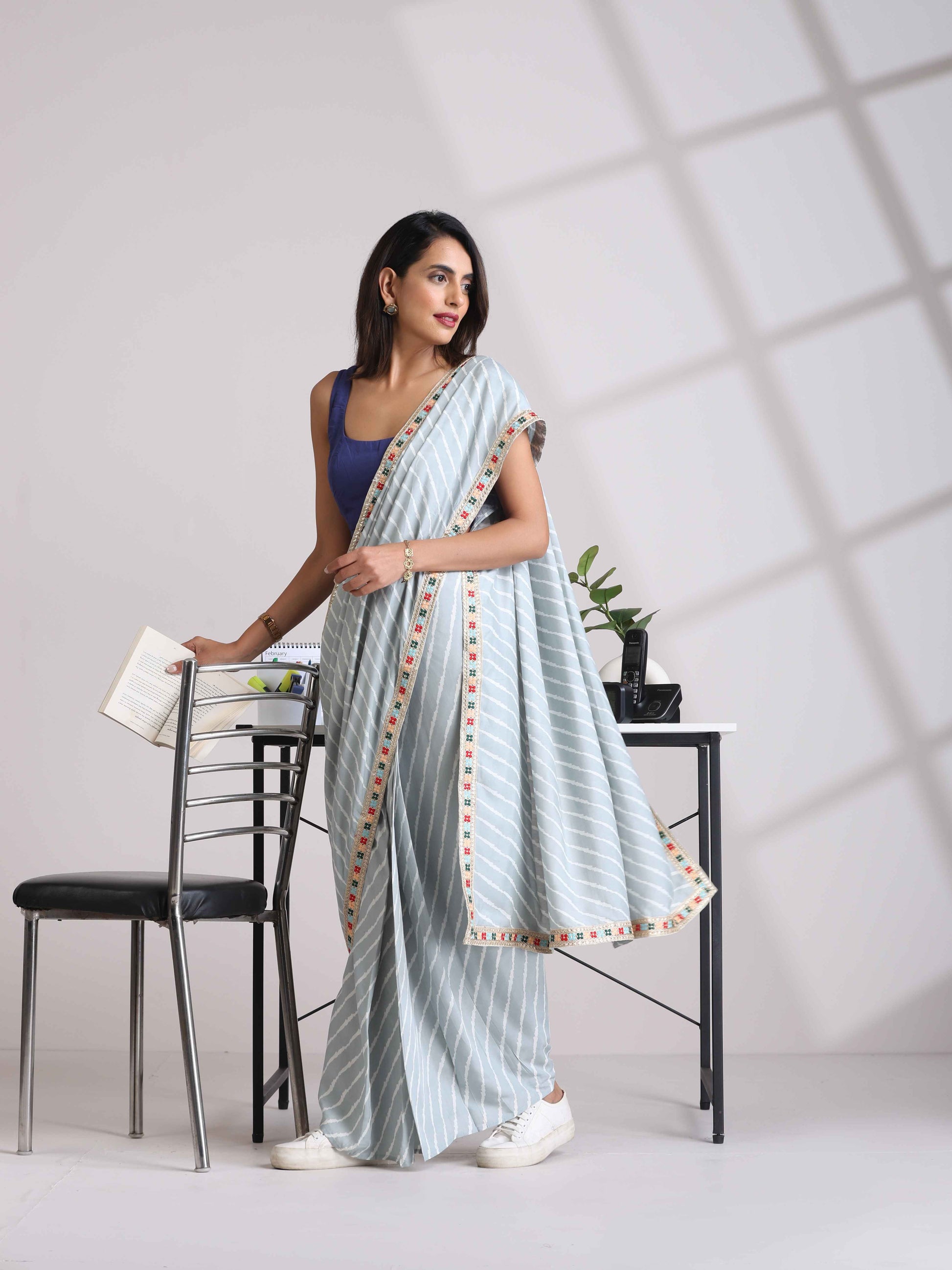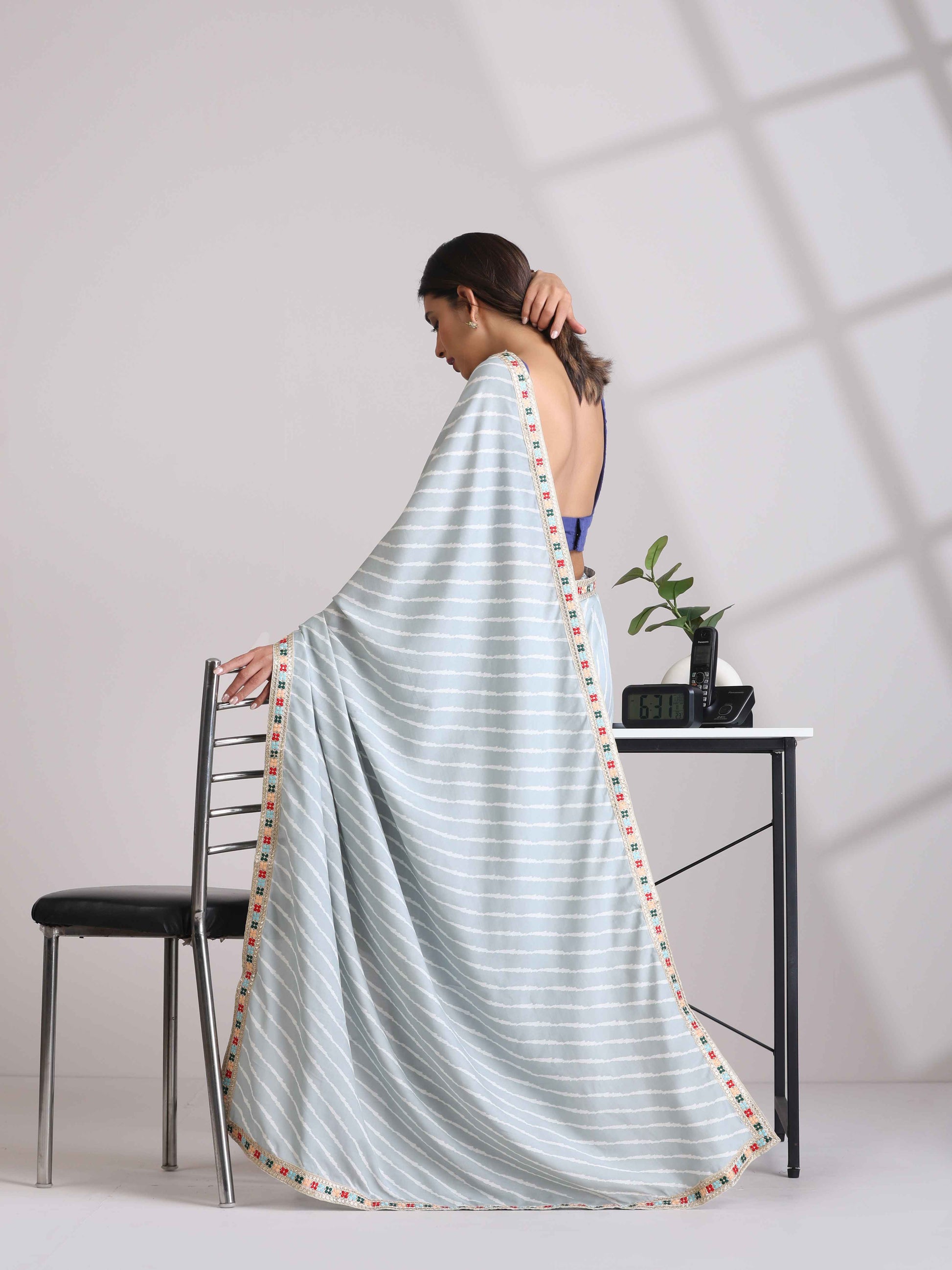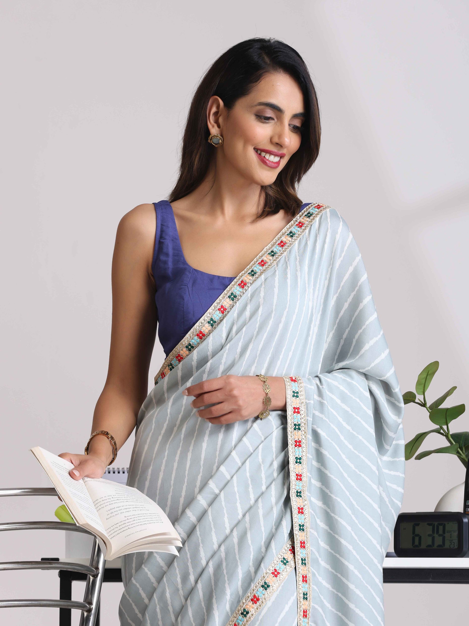 - Elevate your style with this grey leheriya print muslin silk saree.