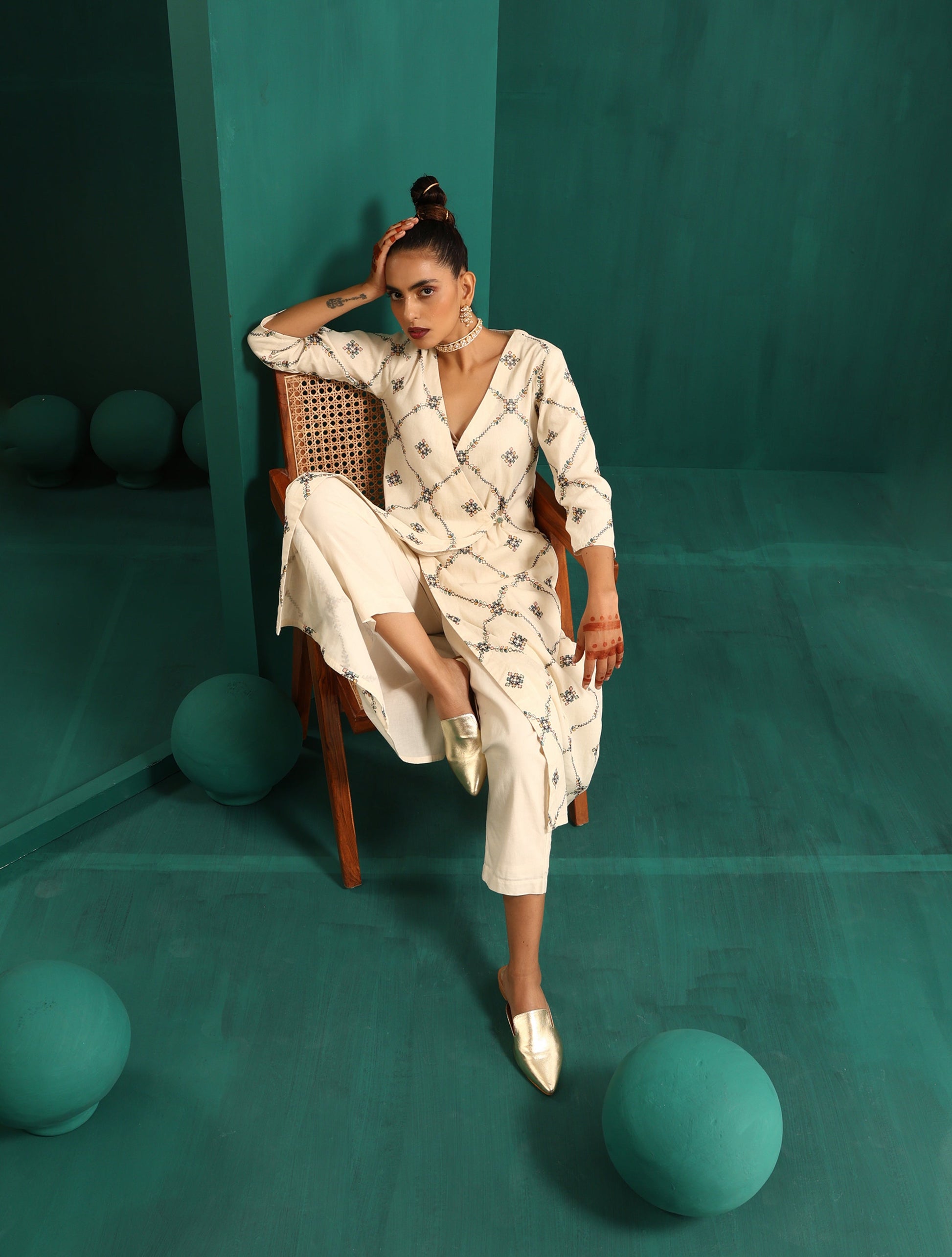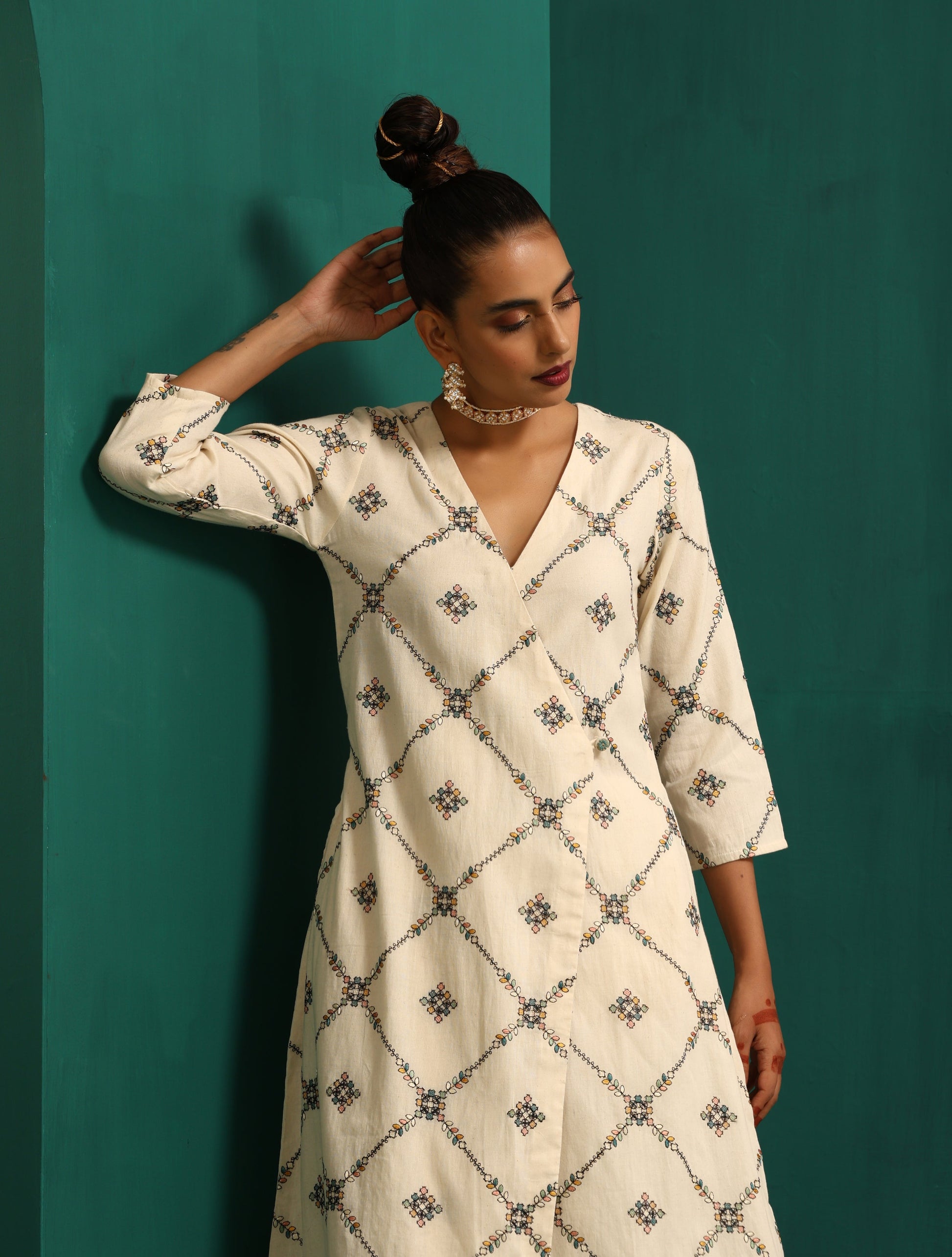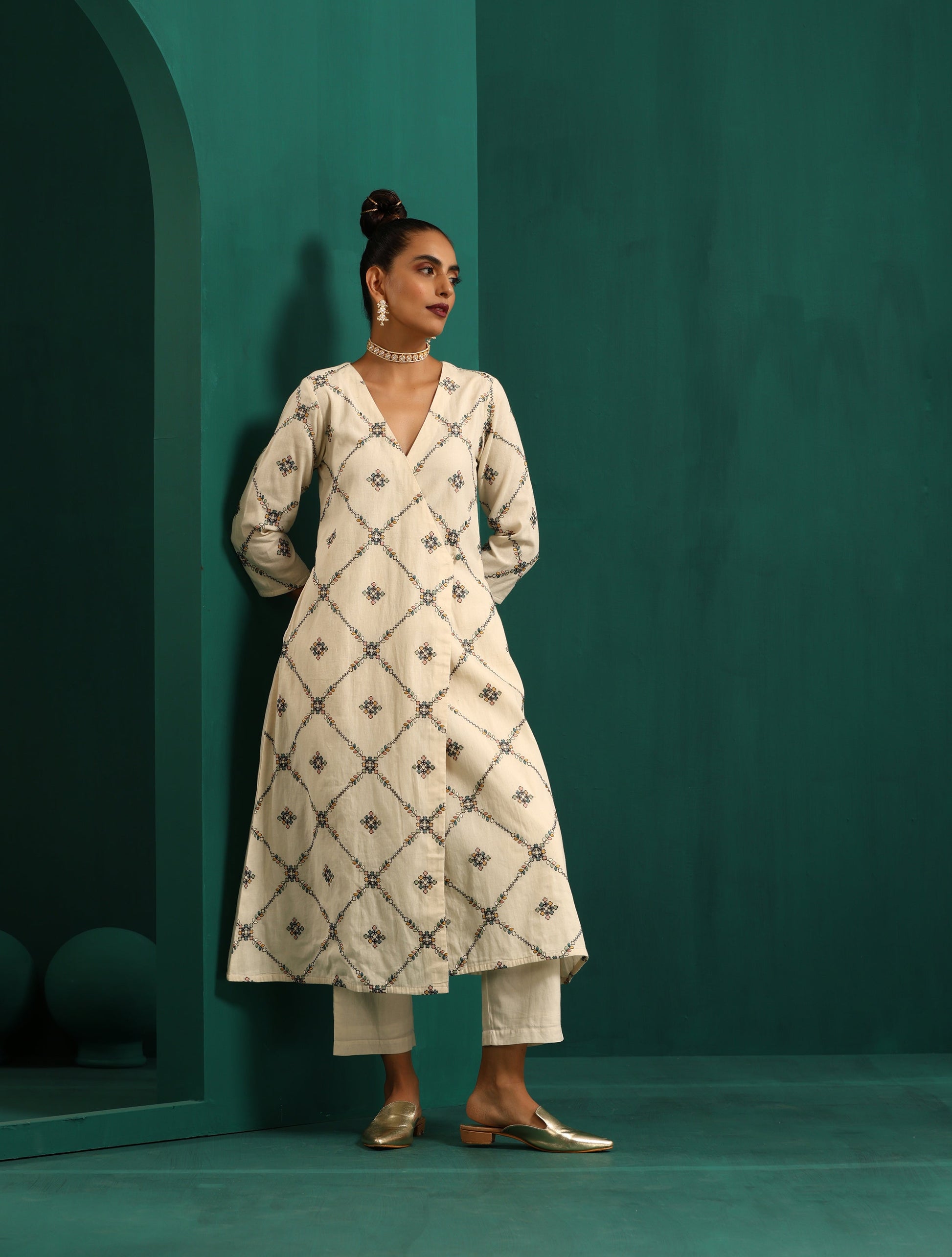 trueBrowns Ivory Rhombus Cotton Angrakha Kurta Pant Set