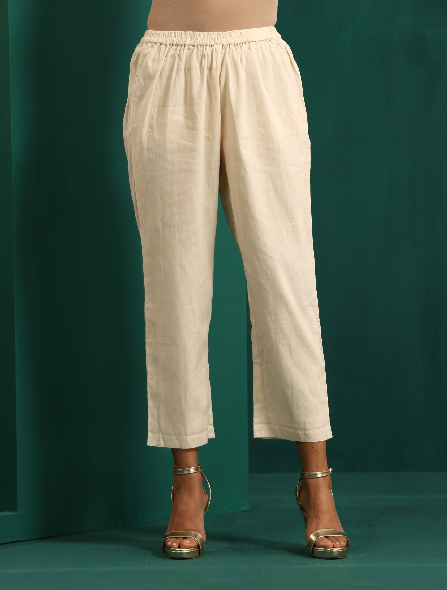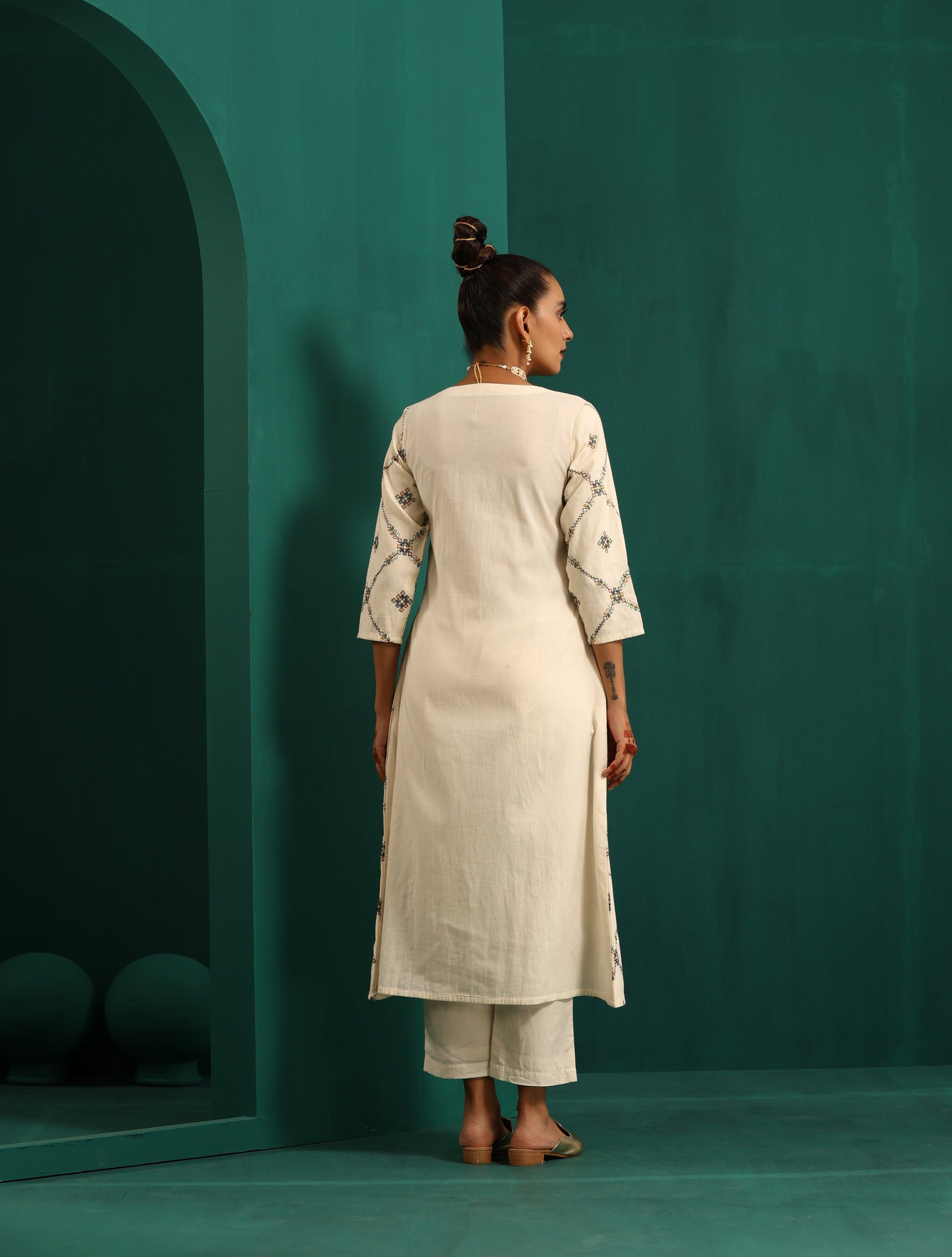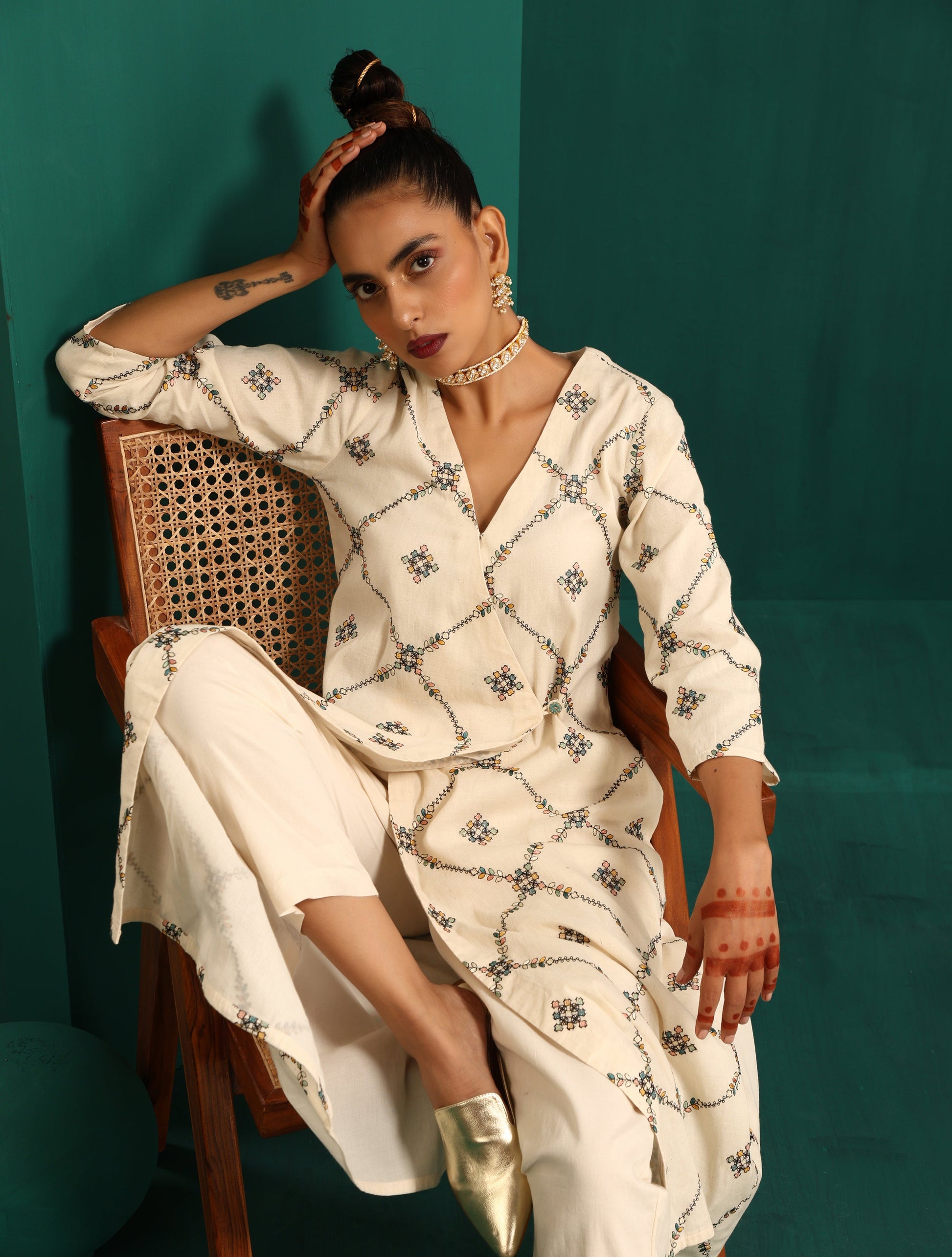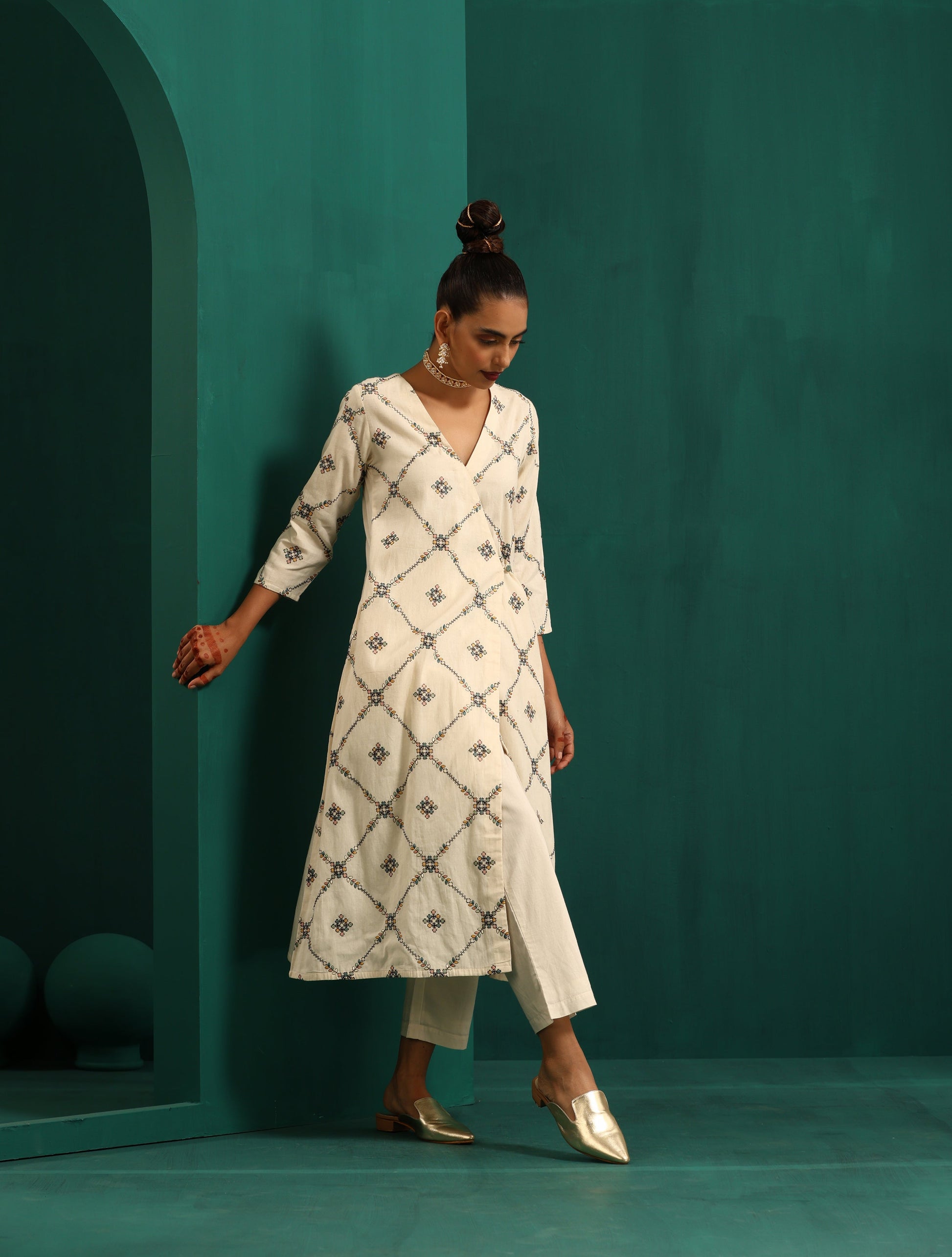 trueBrowns Ivory Rhombus Cotton Angrakha Kurta Pant Set