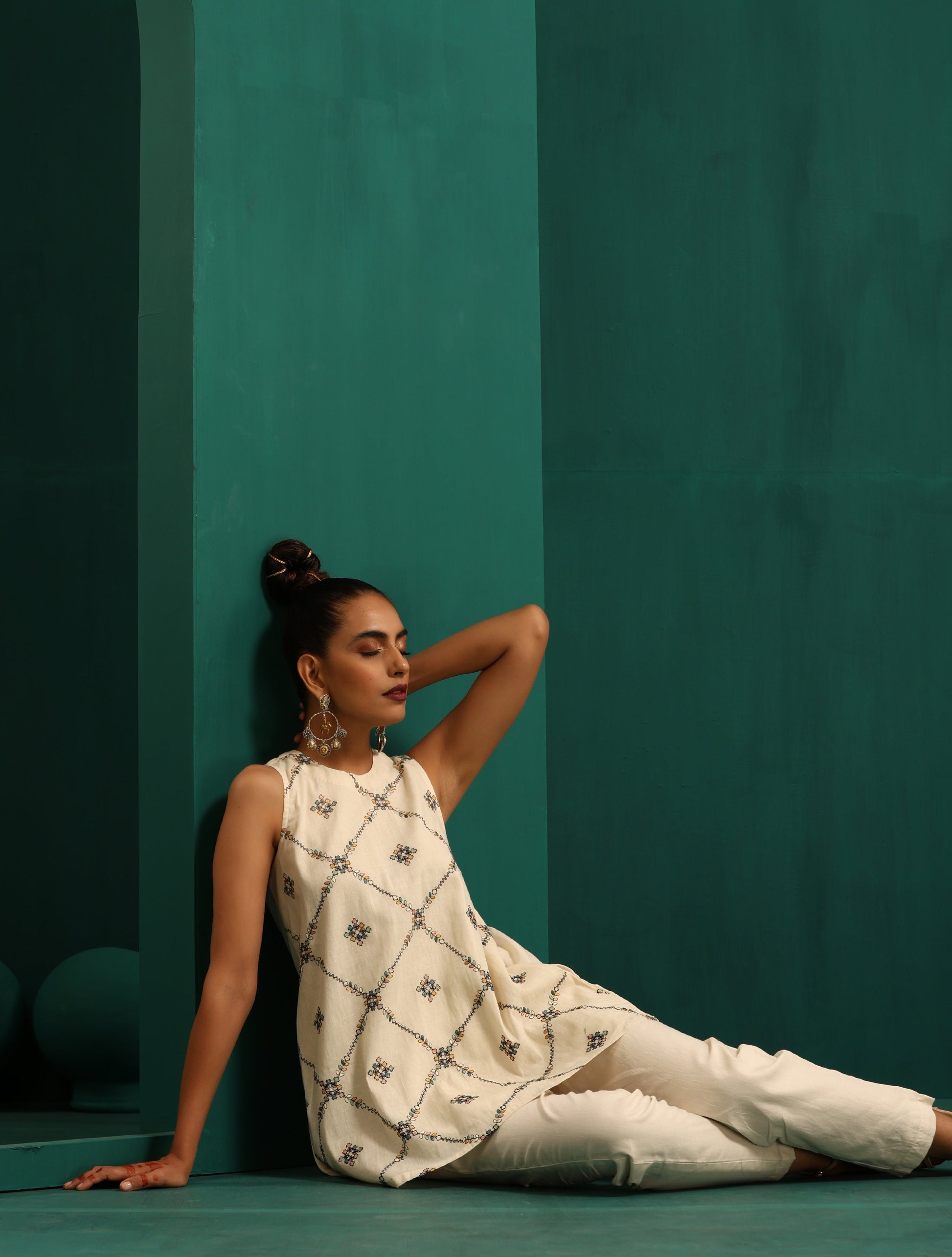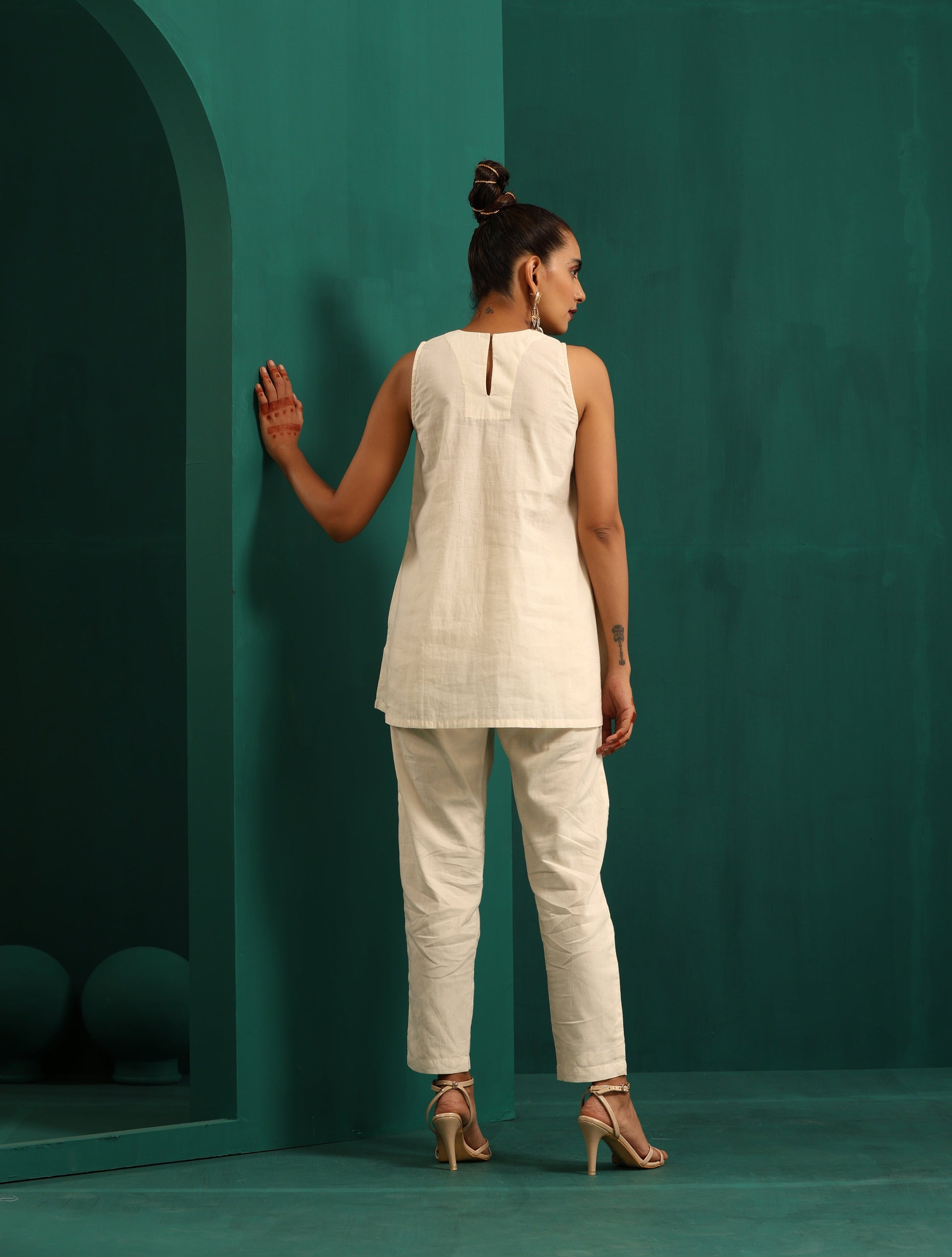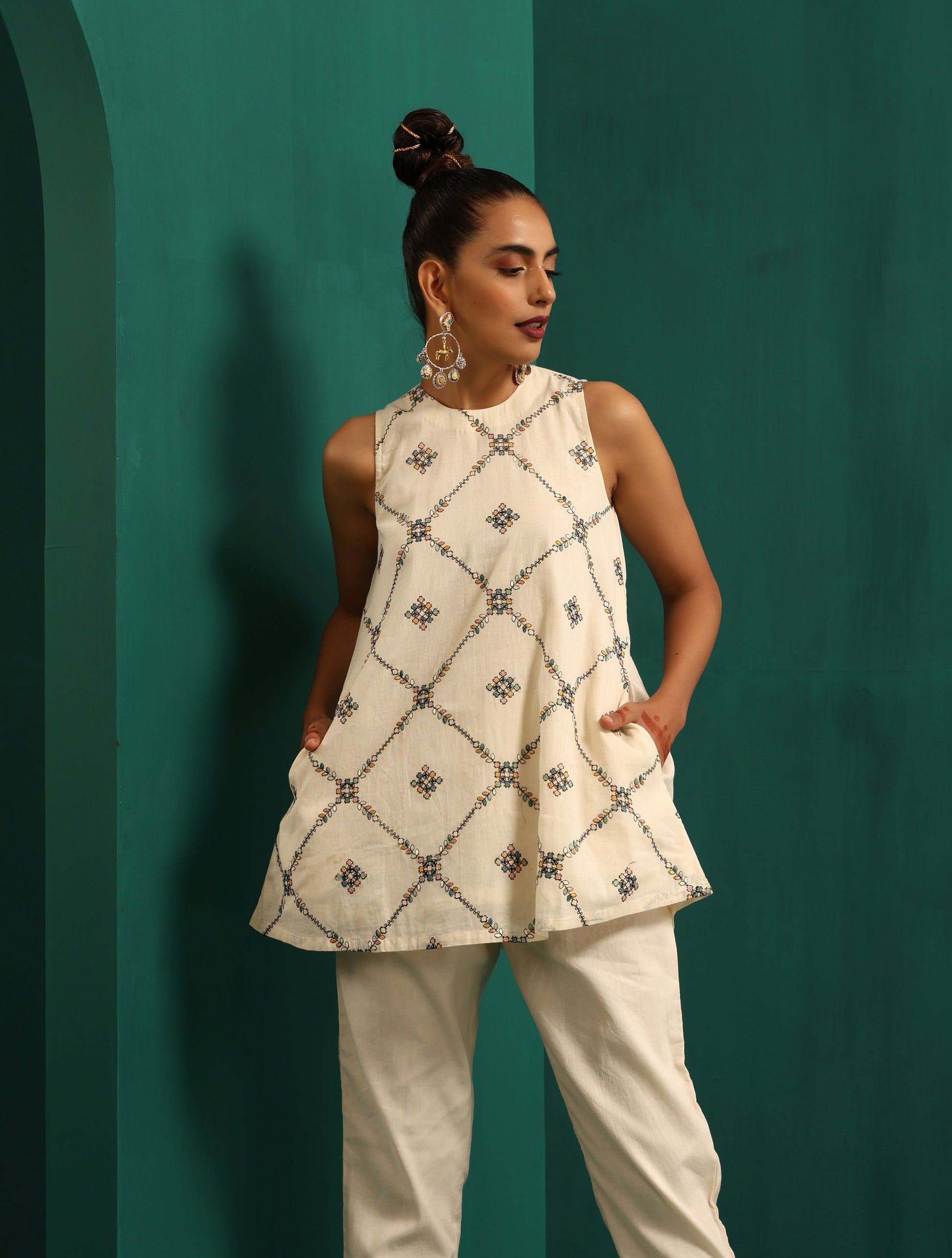 - Cotton embroidered Sleeveless Round Neck Co-Ord Set. Paired with elasticated waist pant.