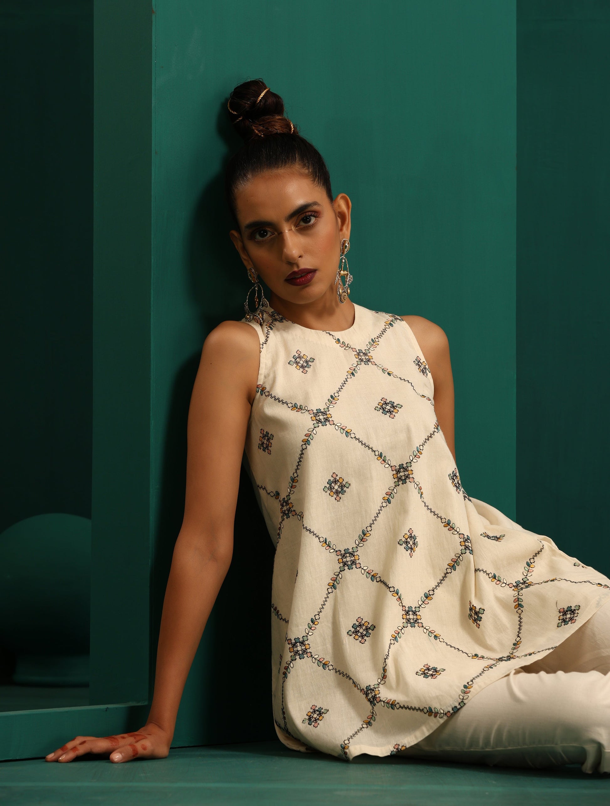 trueBrowns Ivory Rhombus Cotton Sleeveless Co-Ord Set