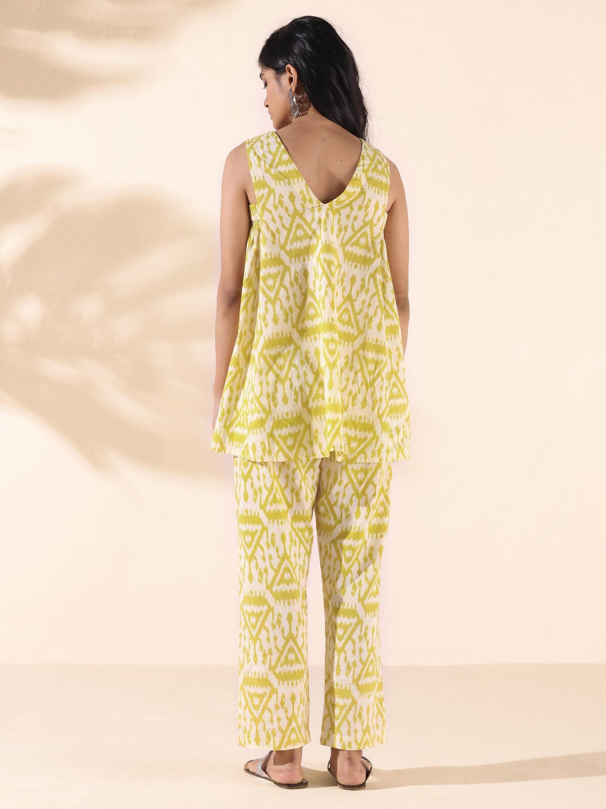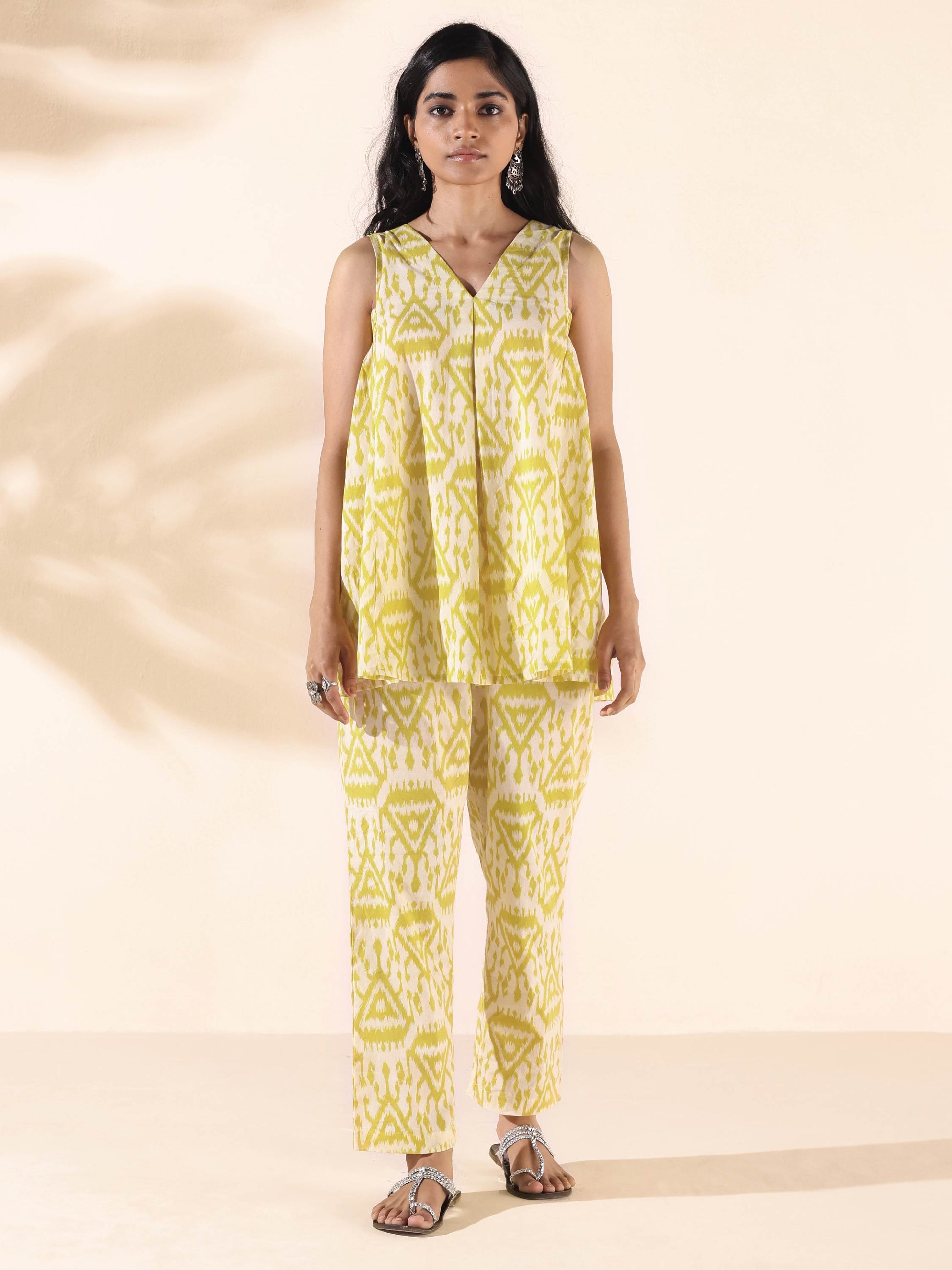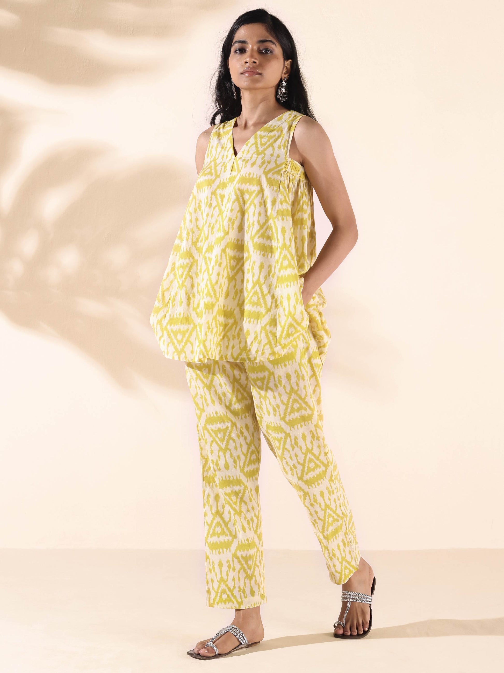- Cotton Ikat Triangle Printed Sleeveless Co-ord Set with front neck pleat overlap, side armhole gathers and V-neck. Paired with elasticated waist pant.
