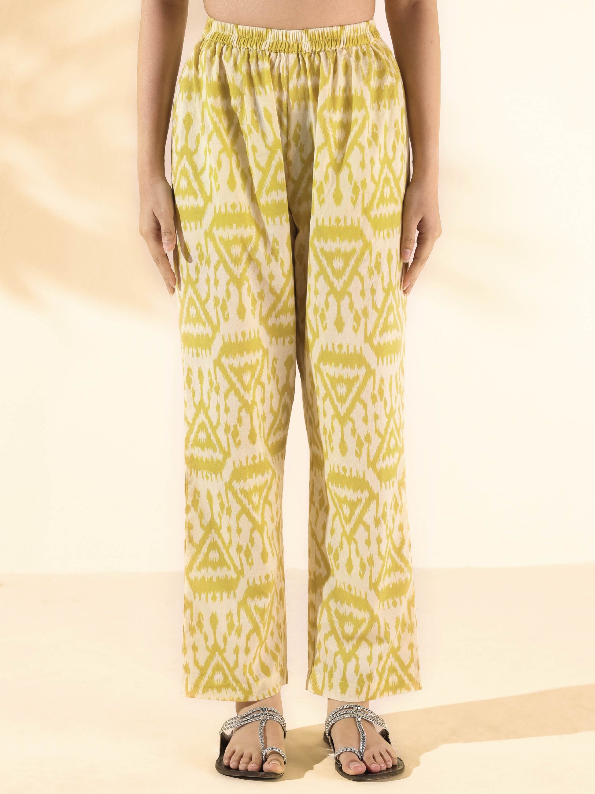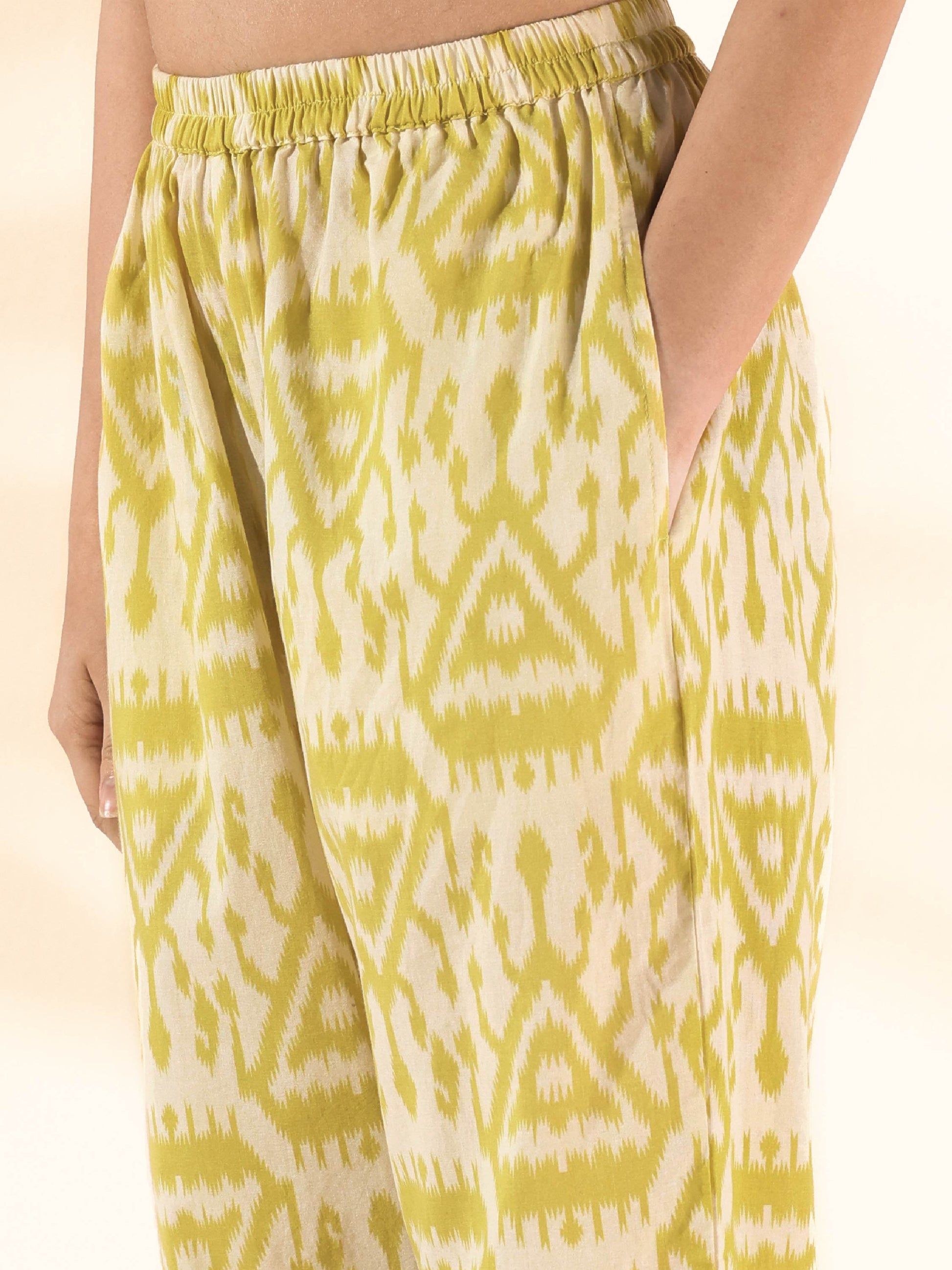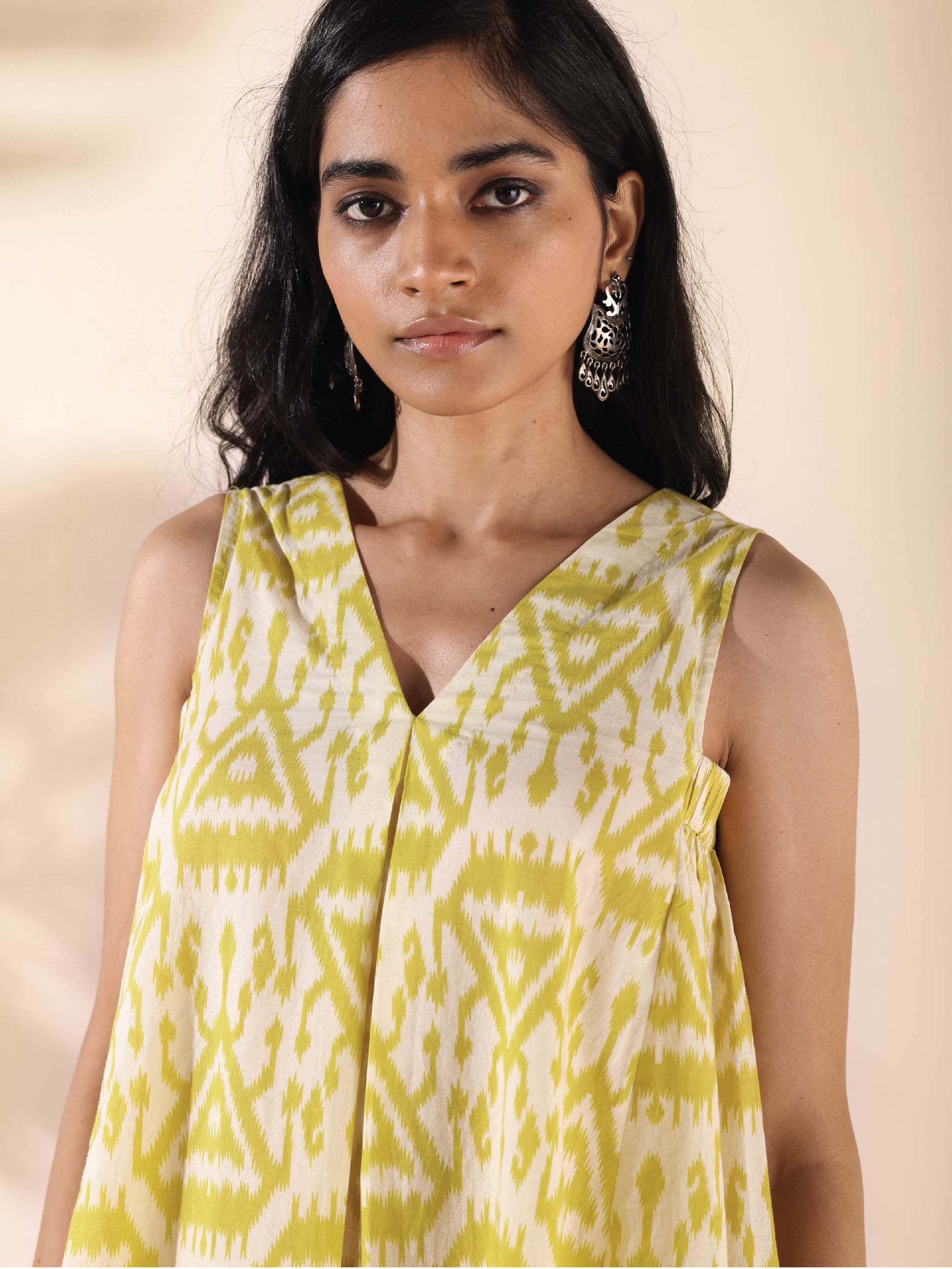 - Cotton Ikat Triangle Printed Sleeveless Co-ord Set with front neck pleat overlap, side armhole gathers and V-neck. Paired with elasticated waist pant.