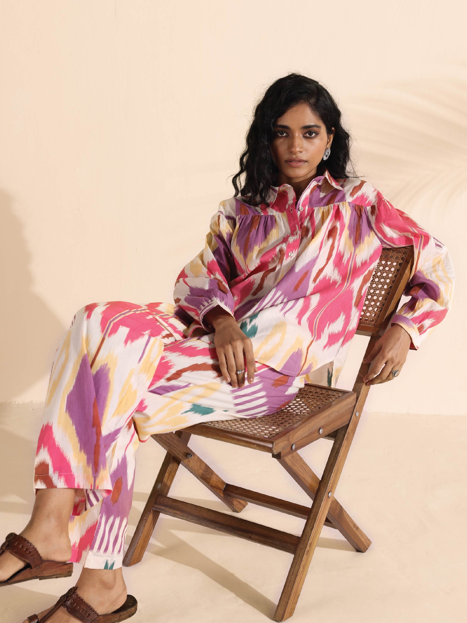 trueBrowns Pink Cotton Ikat Shirt Co-ord Set