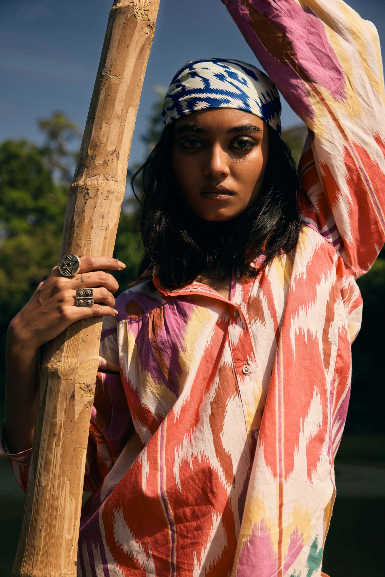 - Cotton Ikat Geometric Printed Co-ord Set with gathered yoke, collar and full front placket. It has gathered sleeve with cuff. Paired with half elasticated waist pant.