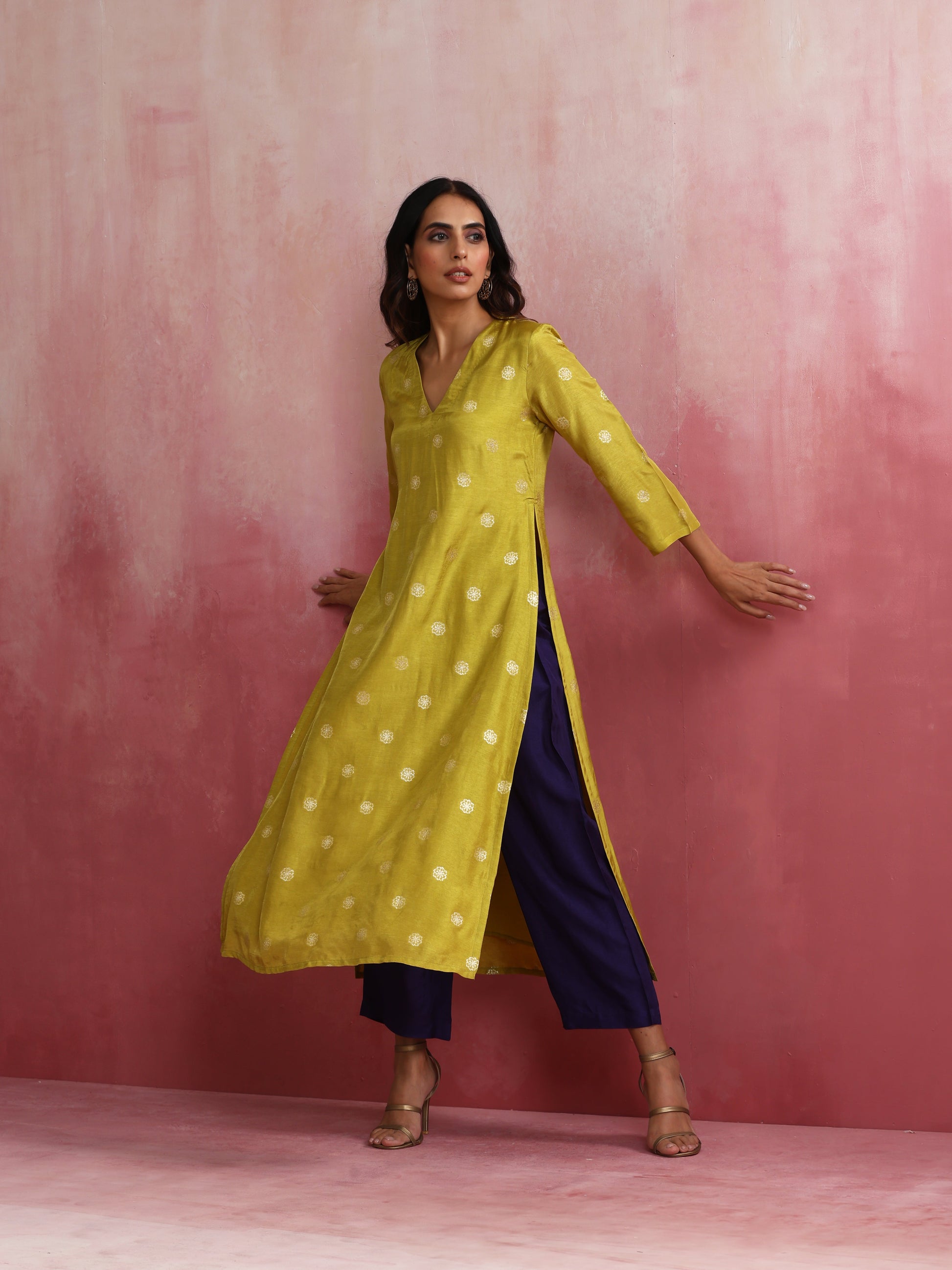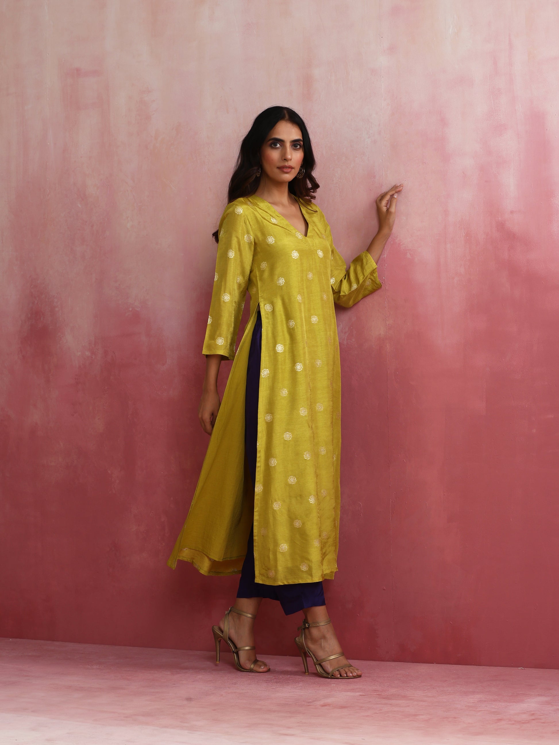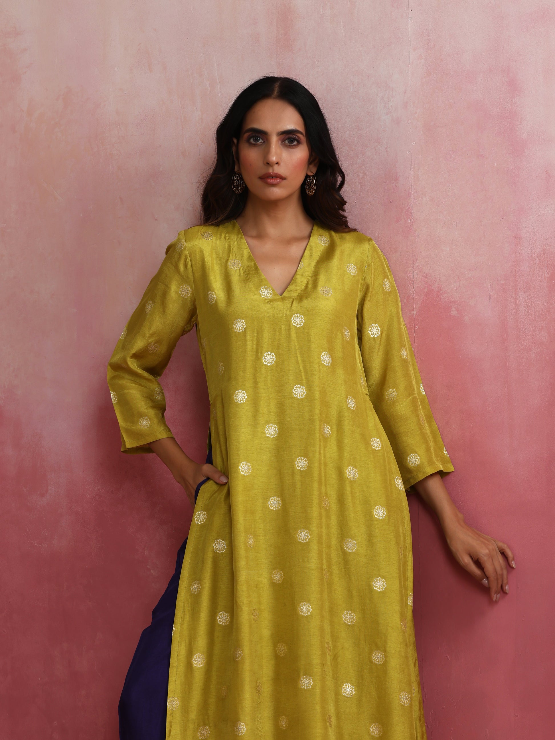 - Elevate your style with this lime viscose silk kurta with 3/4th sleeves.