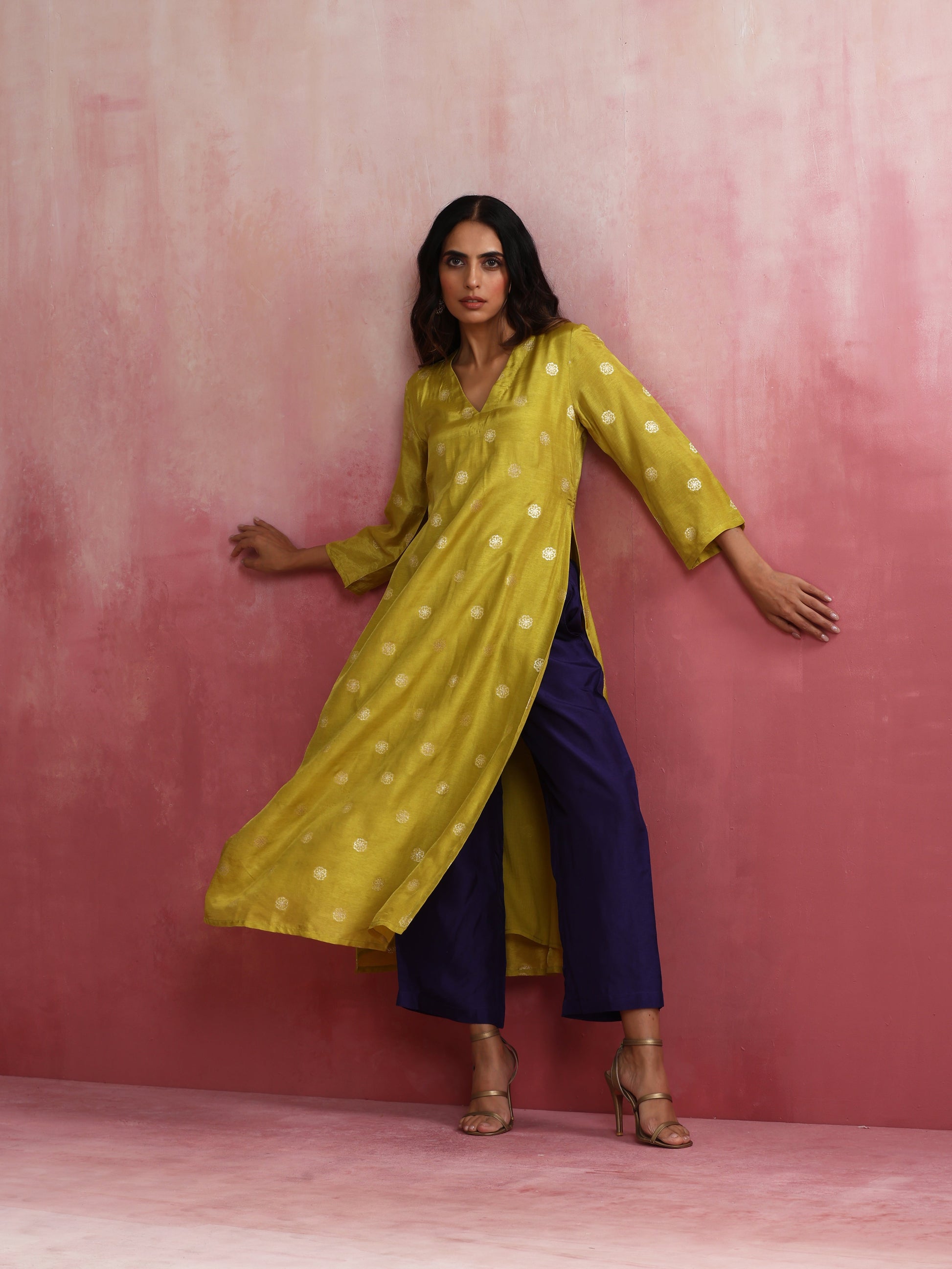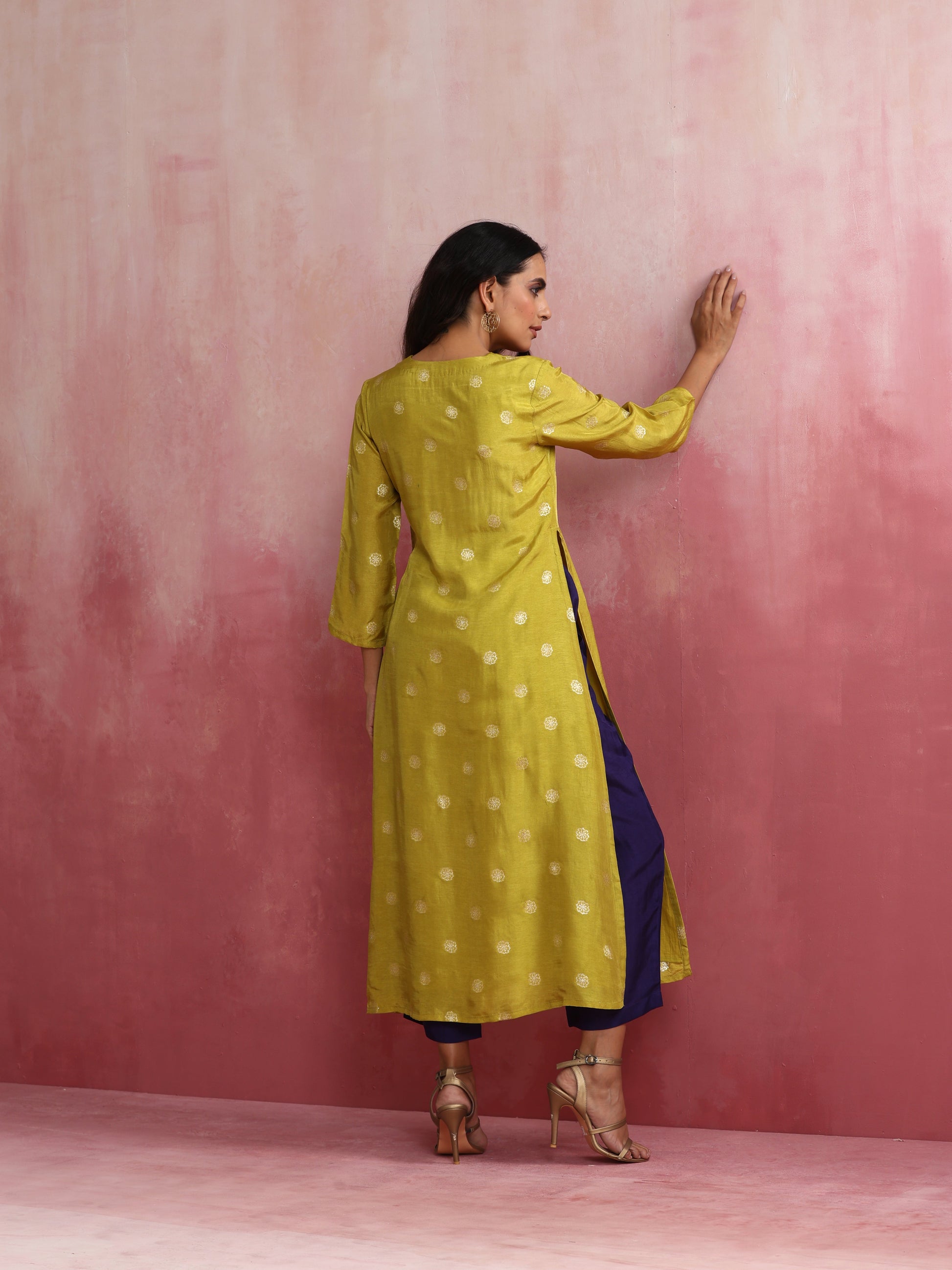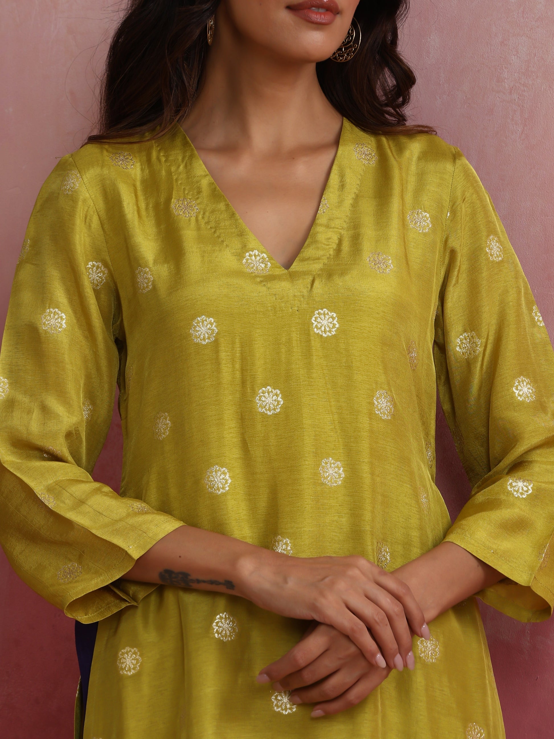 - Elevate your style with this lime viscose silk kurta with 3/4th sleeves.