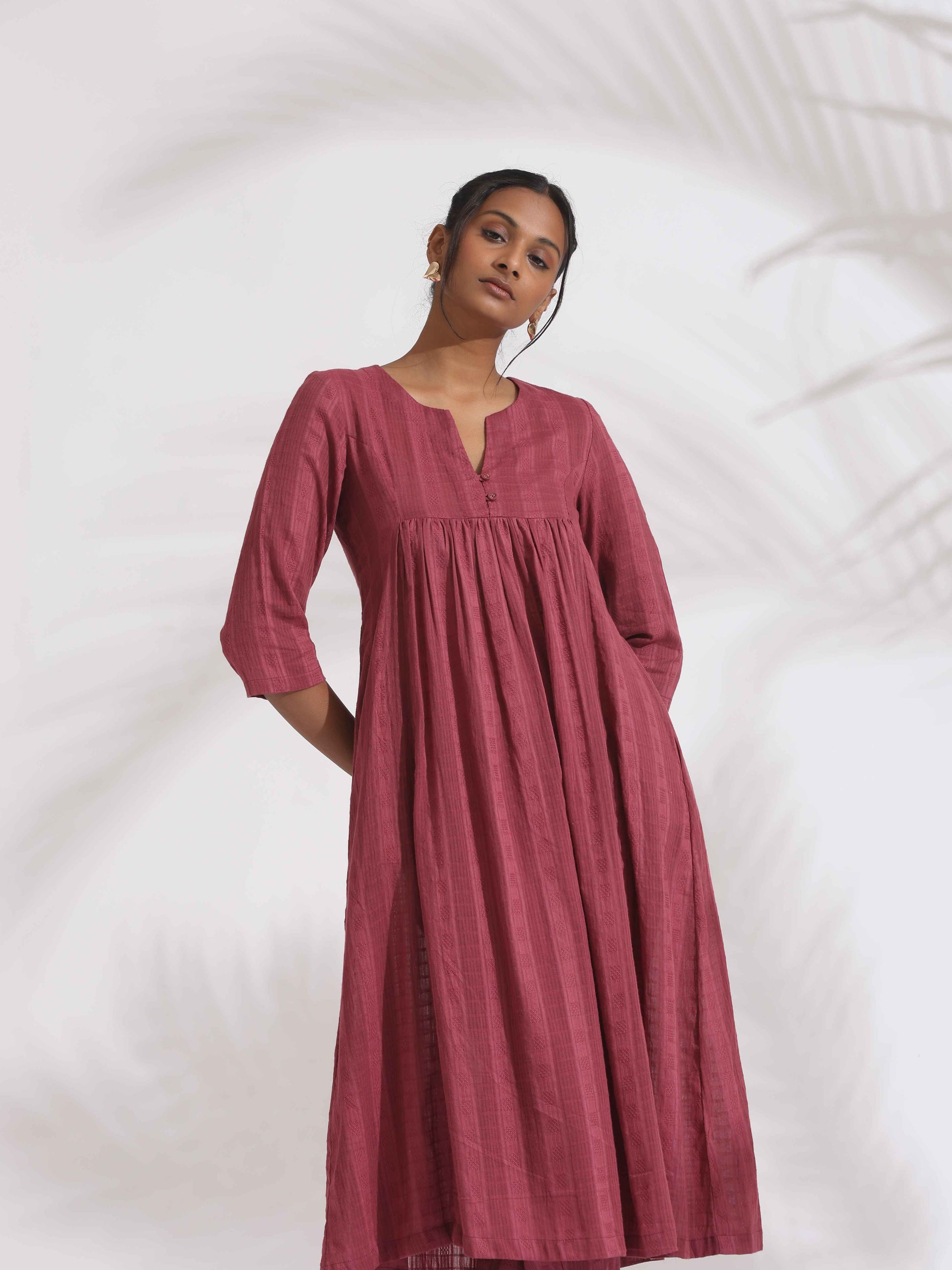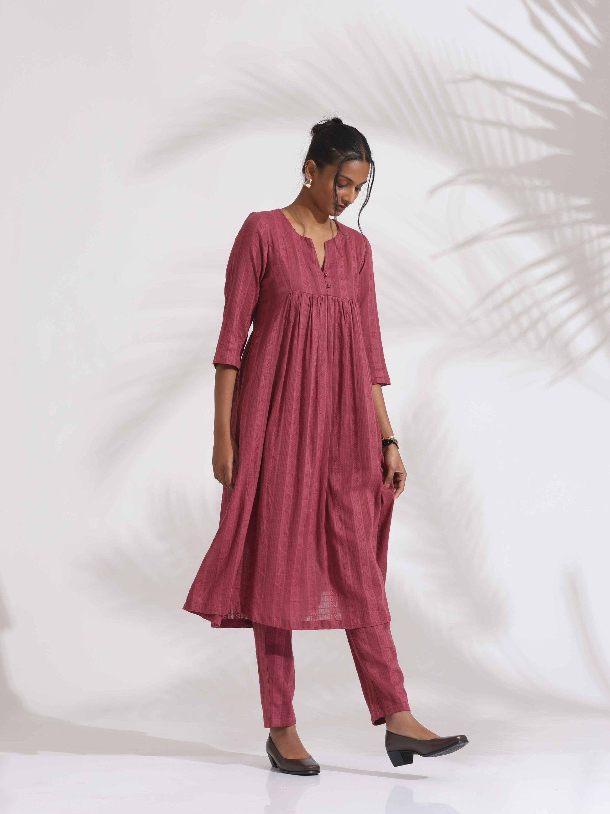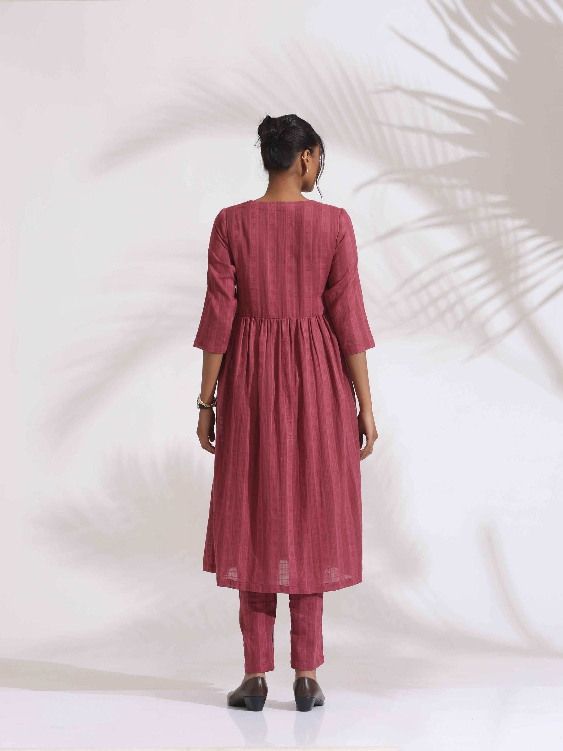 - Elevate your style with this maroon cotton flared kurta set, featuring light gathers along with paneling at the front and back for added flare.