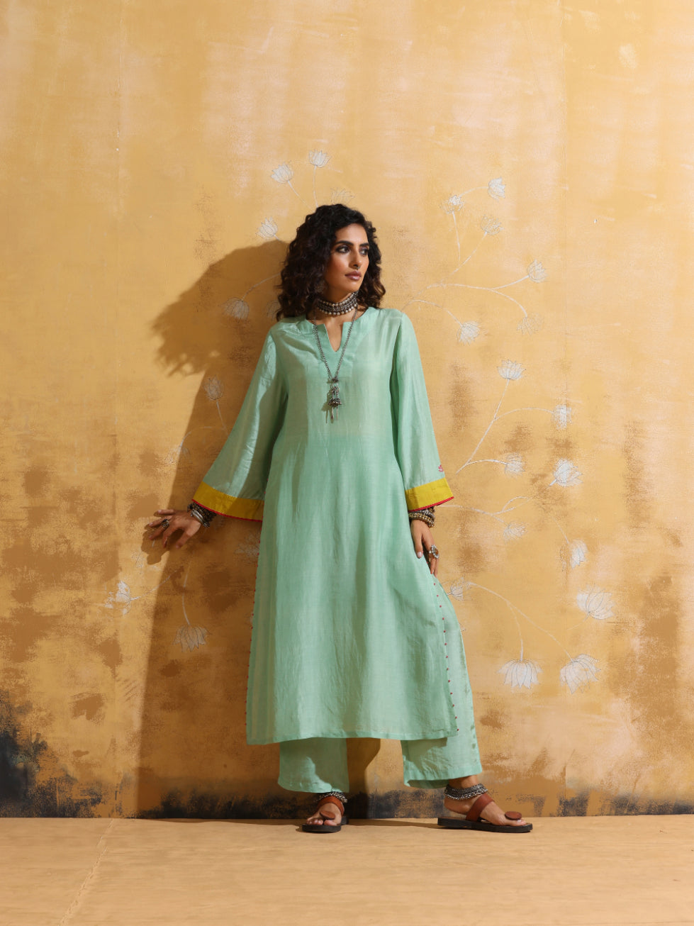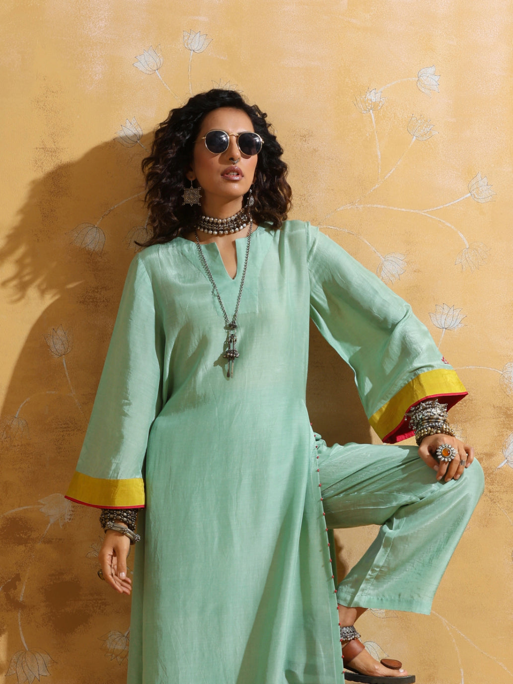- Elevate your style and step into effortless elegance with this mint green high-slit kurta featuring contrast-color trim details, paired with mint green pants. Designed for modern style and comfort, it’s perfect for occasions and gatherings.