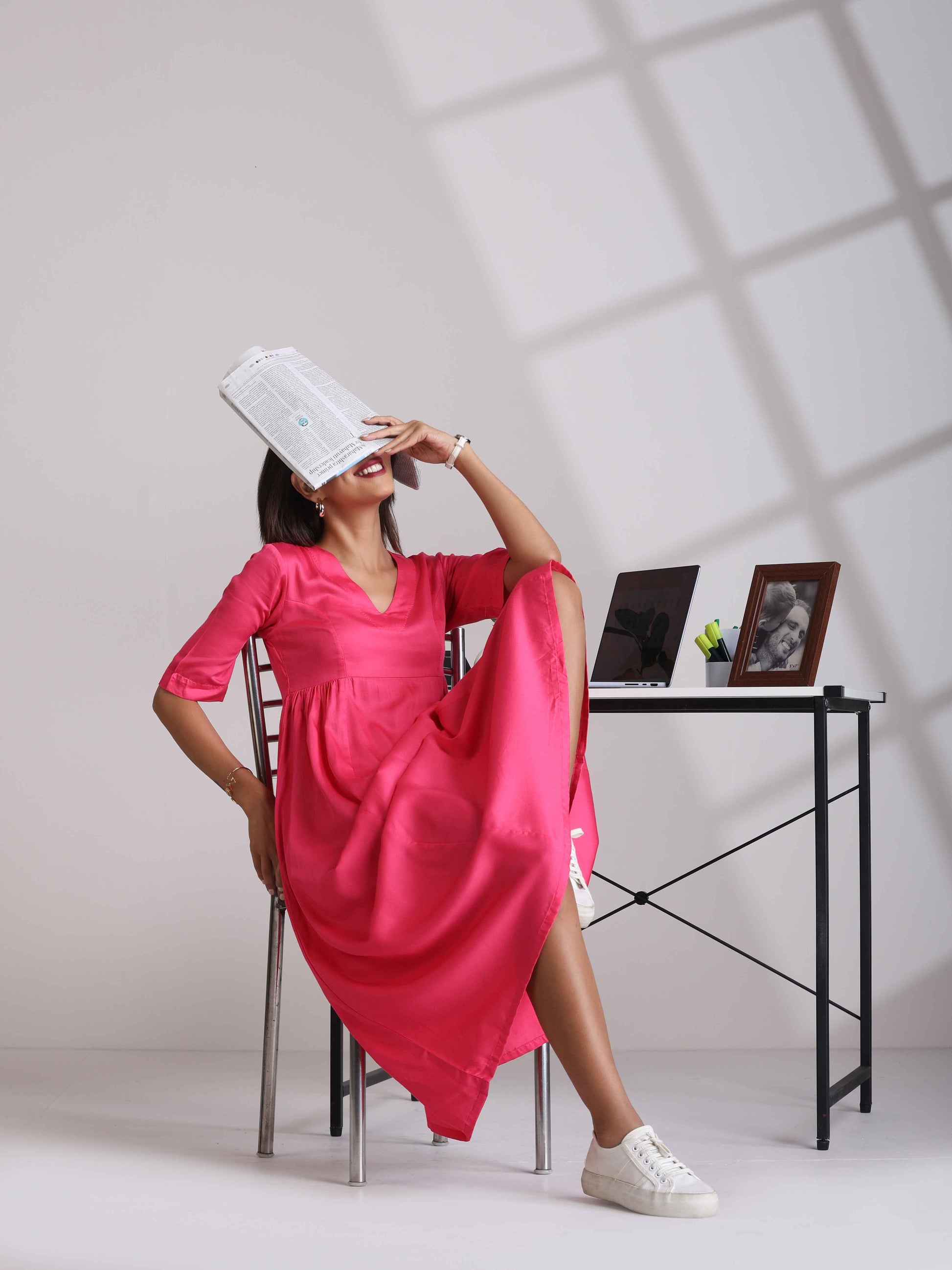 Elevate your style with this pink modal dress with side gathers and V neckline, it's an ideal blend of elegance and comfort.
