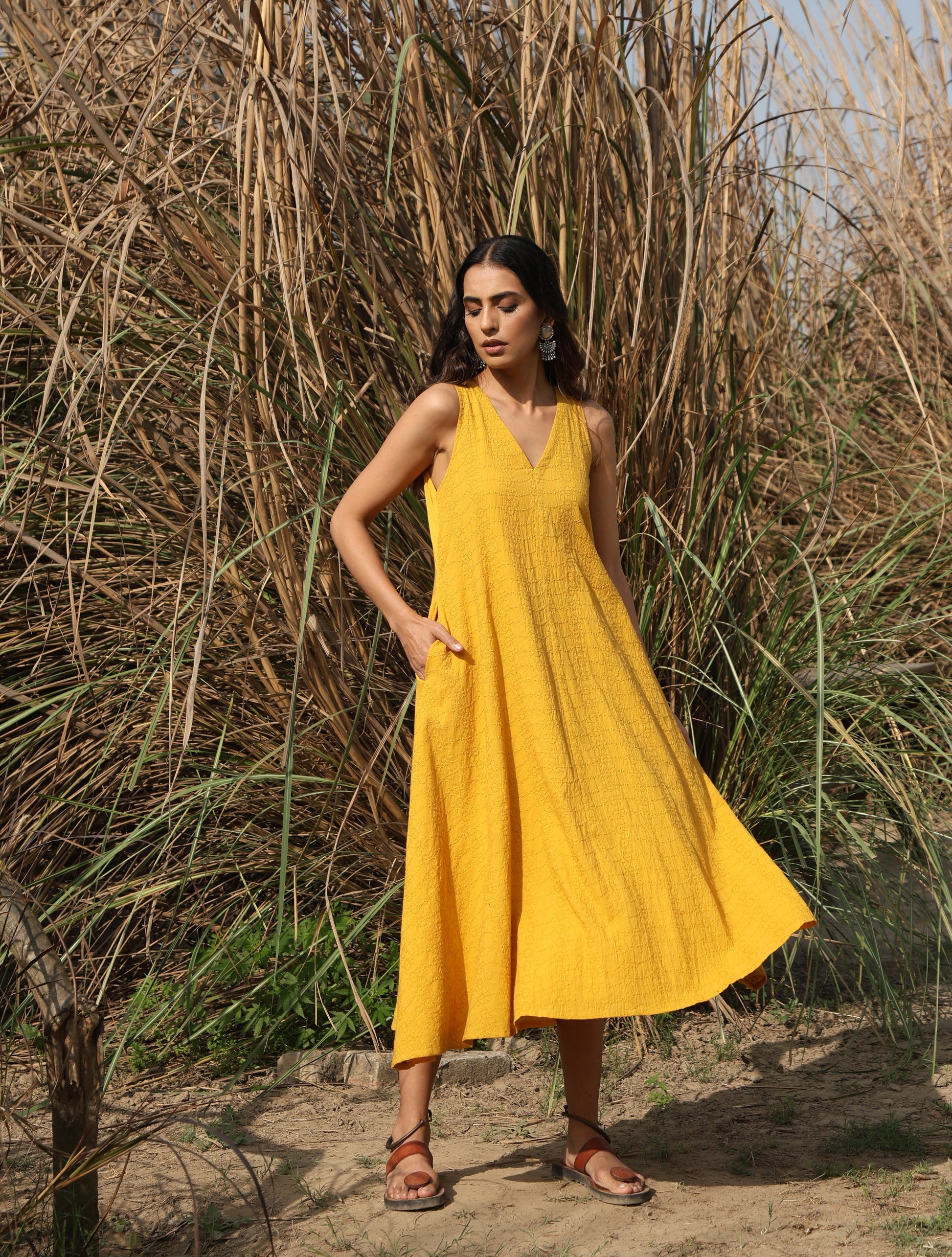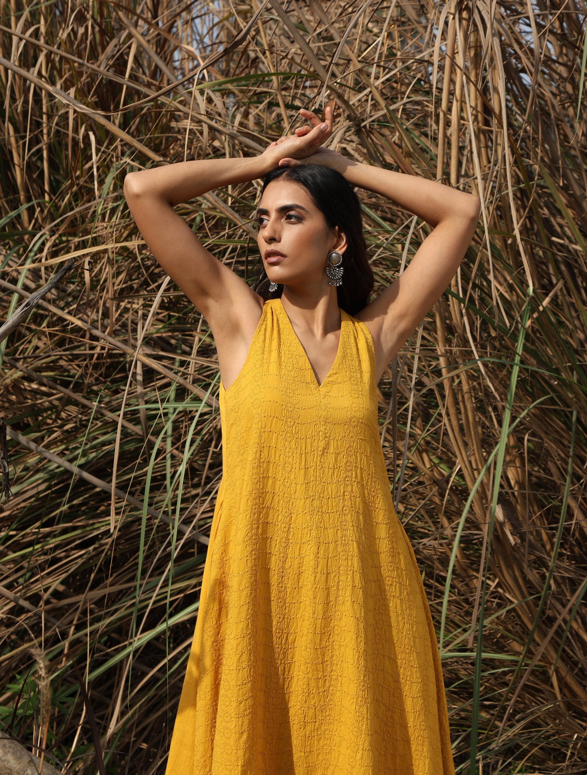 trueBrowns Mustard Cotton Embroidered Flared Dress