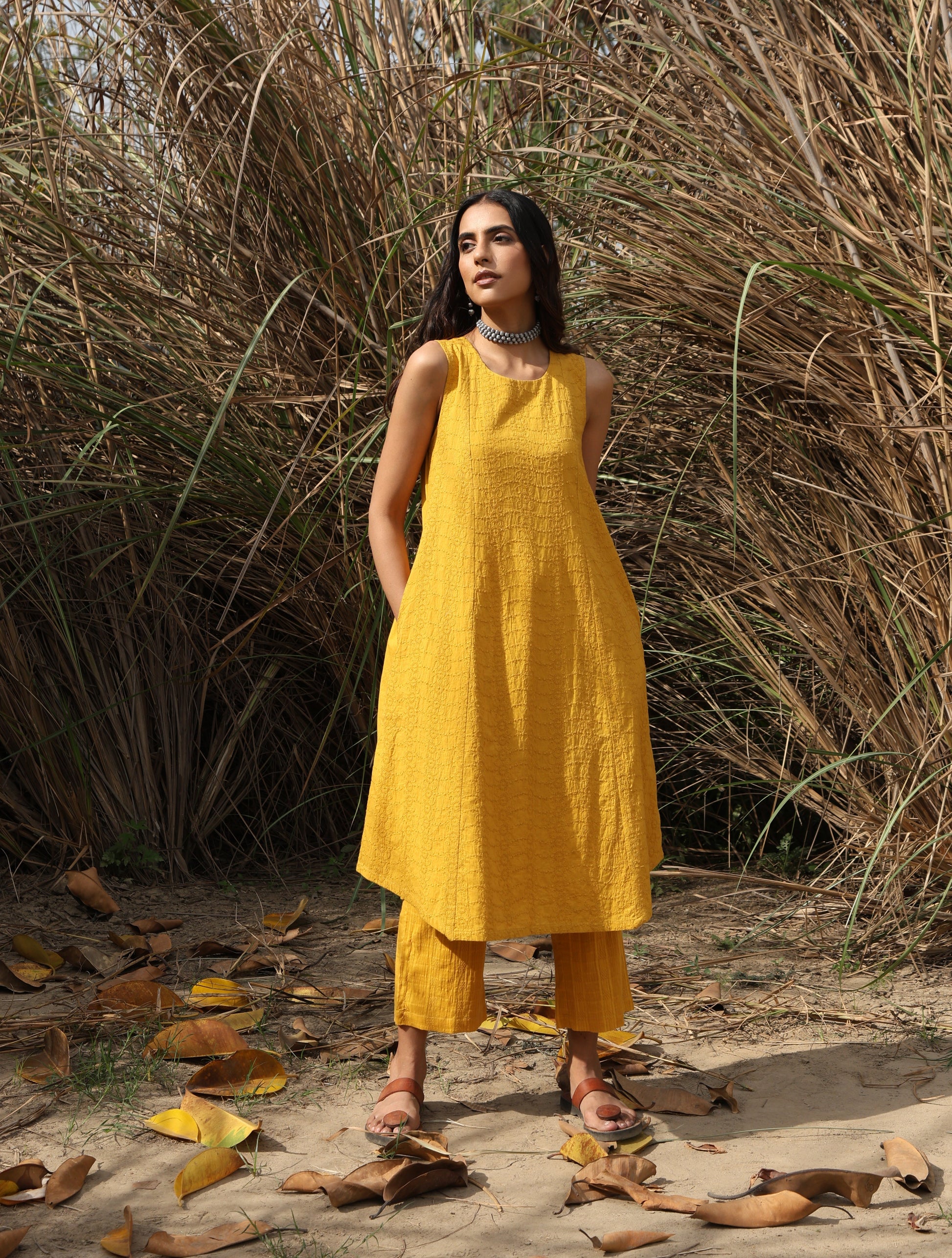 trueBrowns Mustard Cotton Embroidered Sleeveless Kurta Set