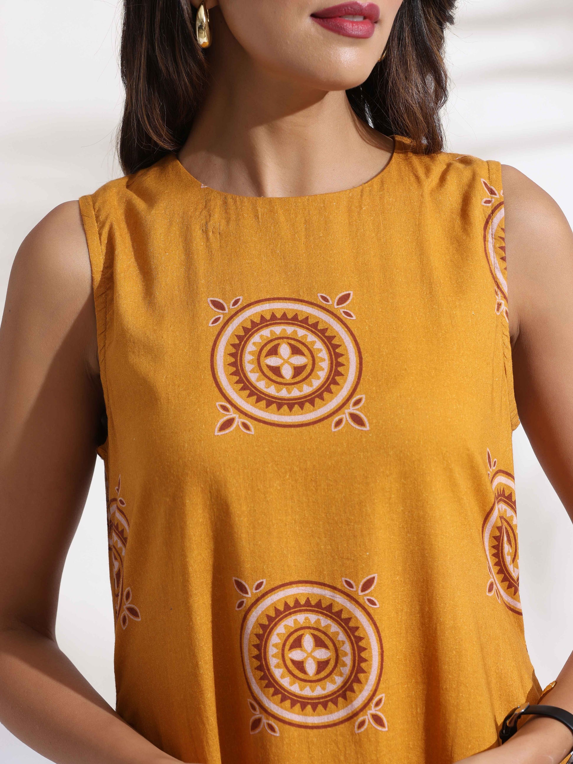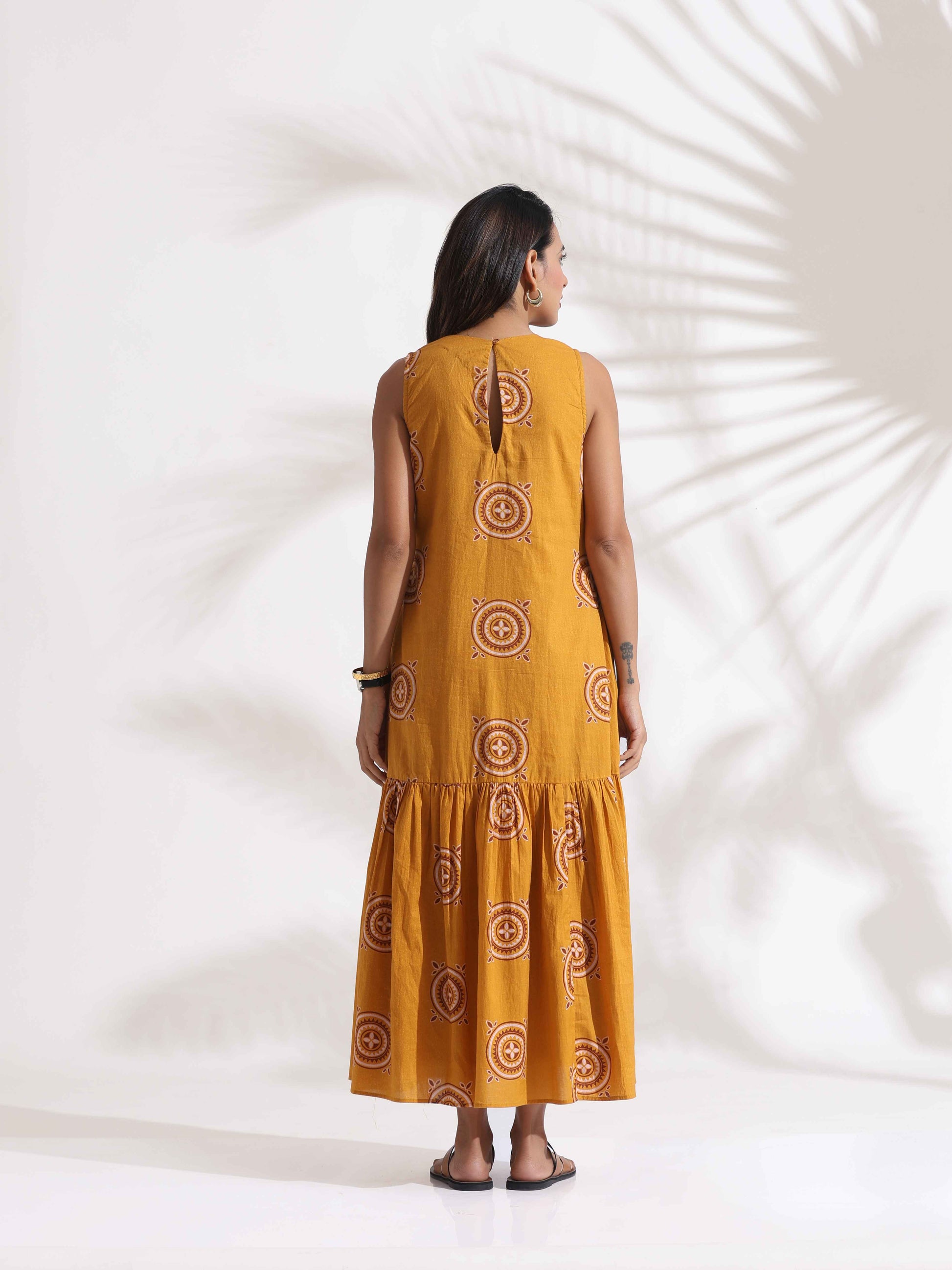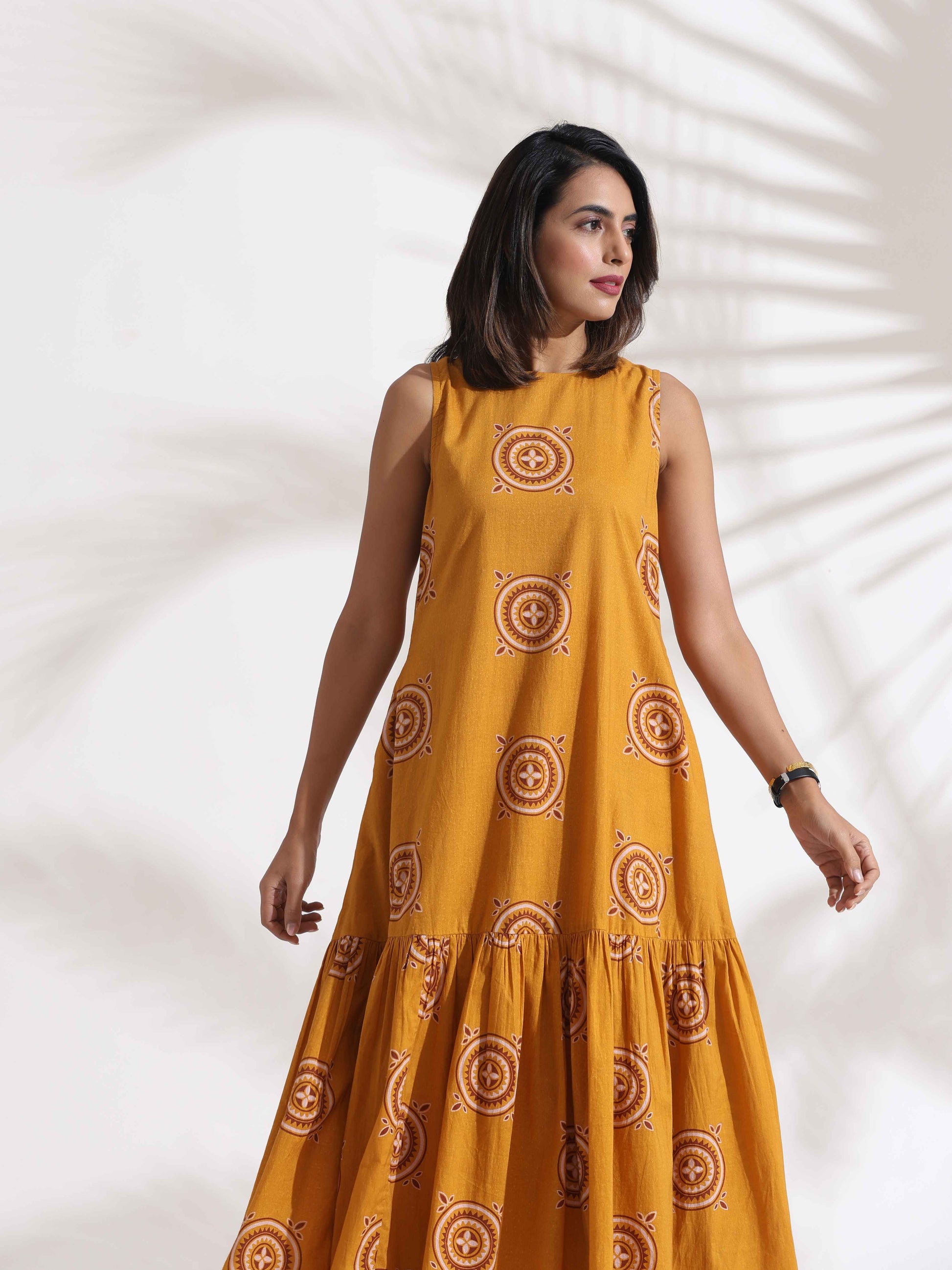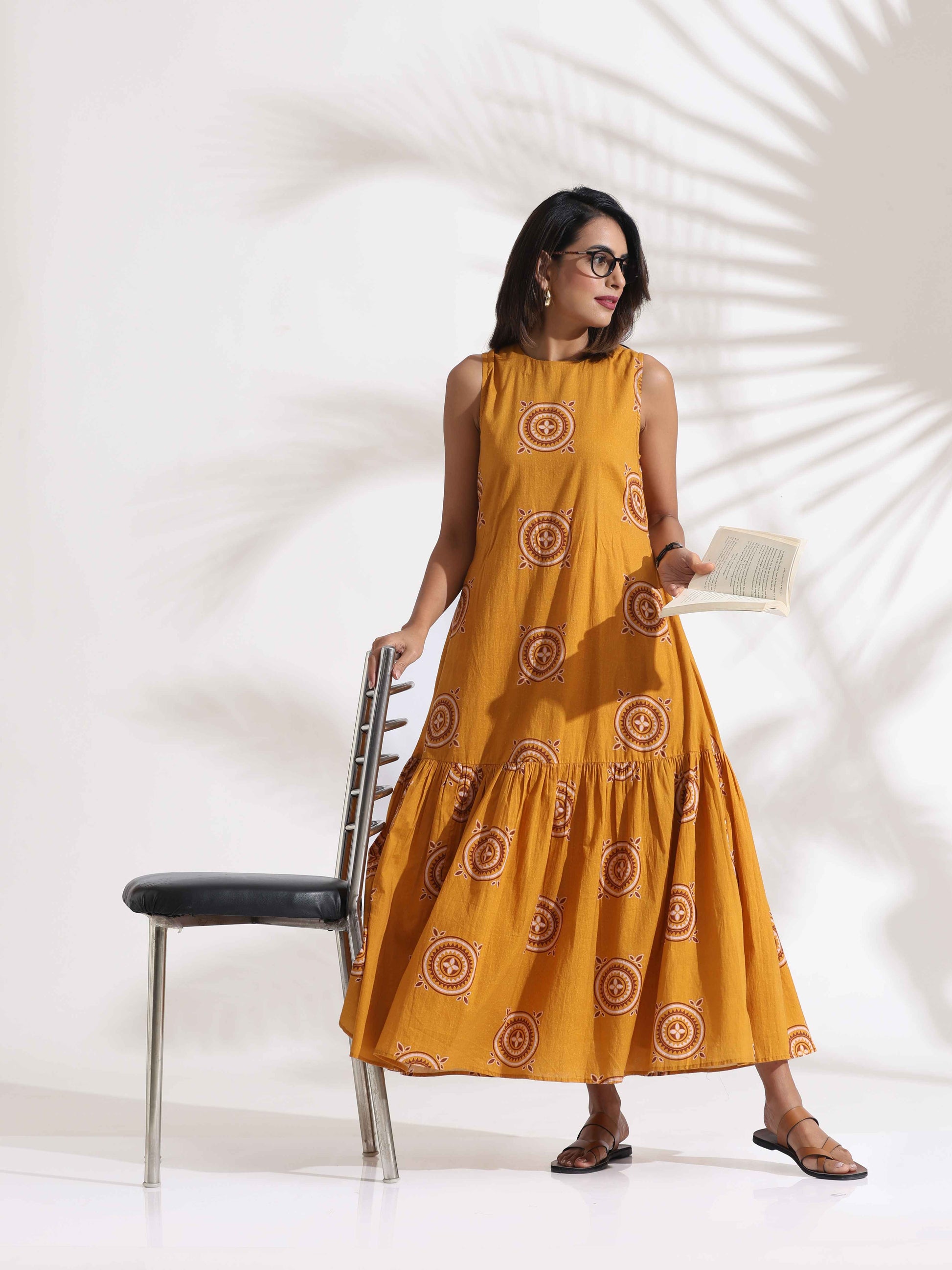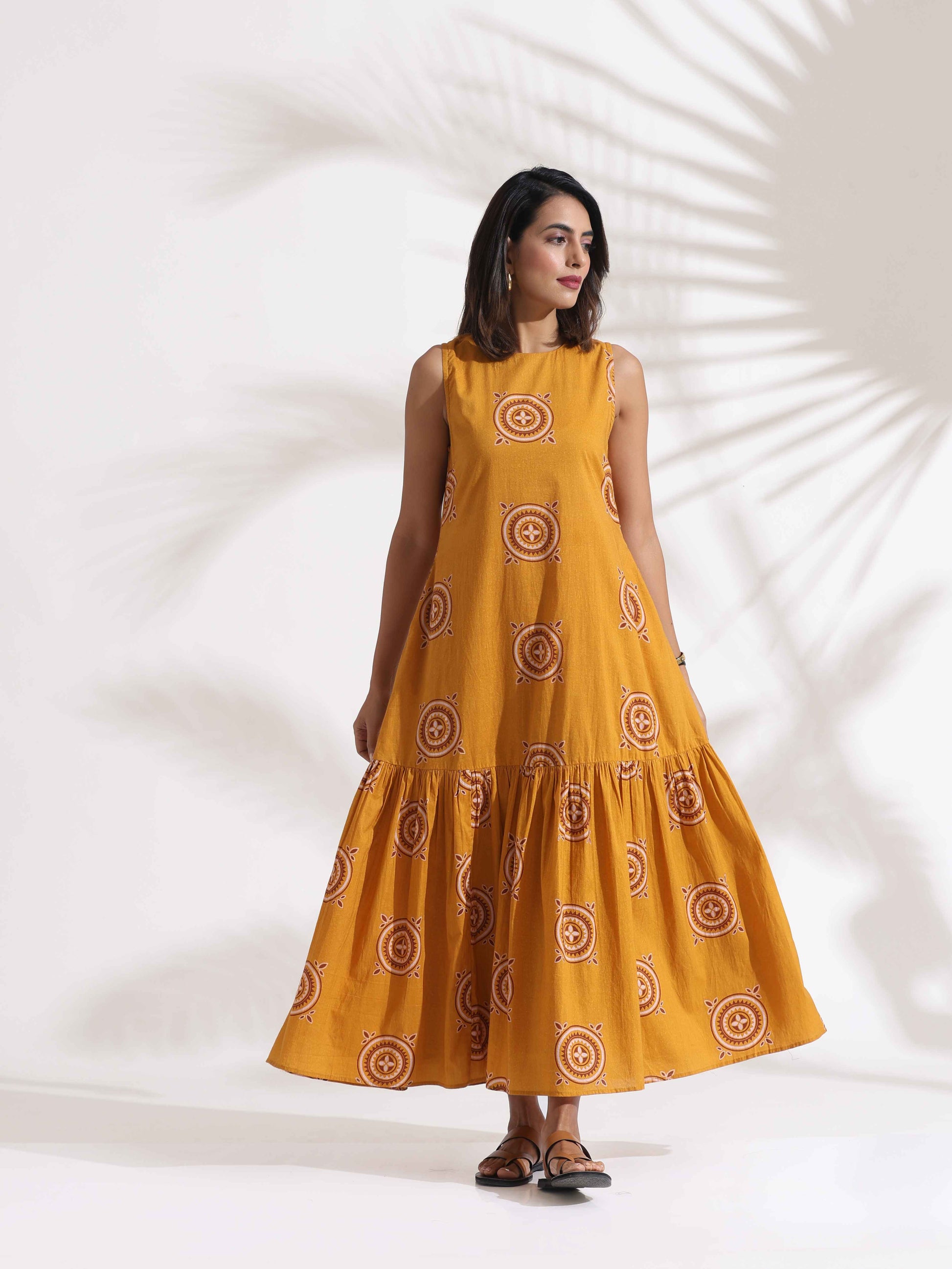- Elevate your style with this yellow cotton printed drop waist dress, it's an ideal blend of elegance and comfort.