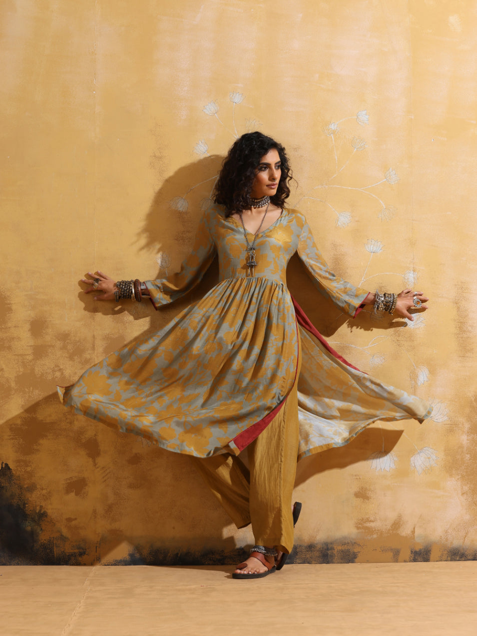 trueBrowns Mustard Jaal Print Muslin Silk High-Slit Fit and Flared Kurta Set