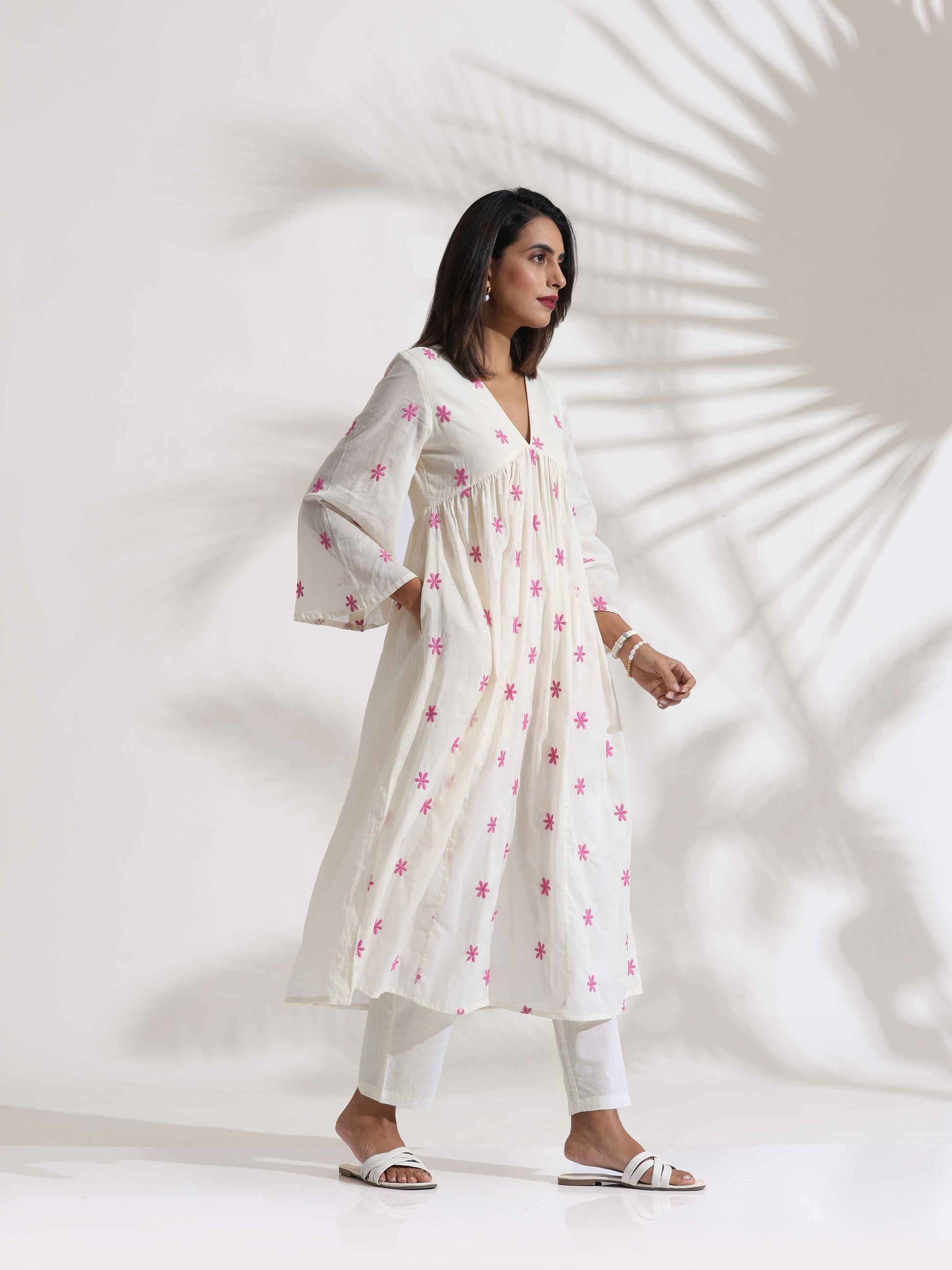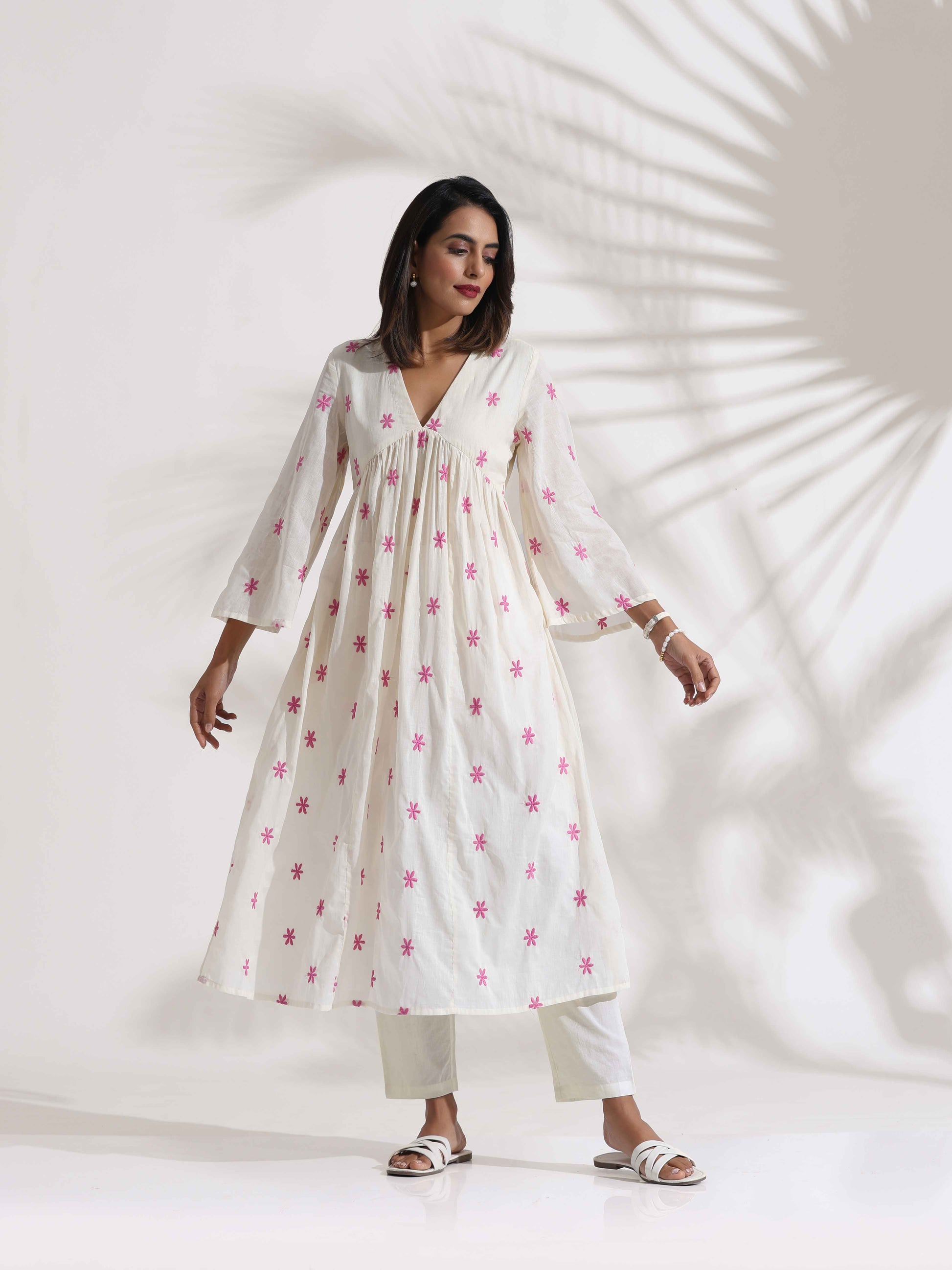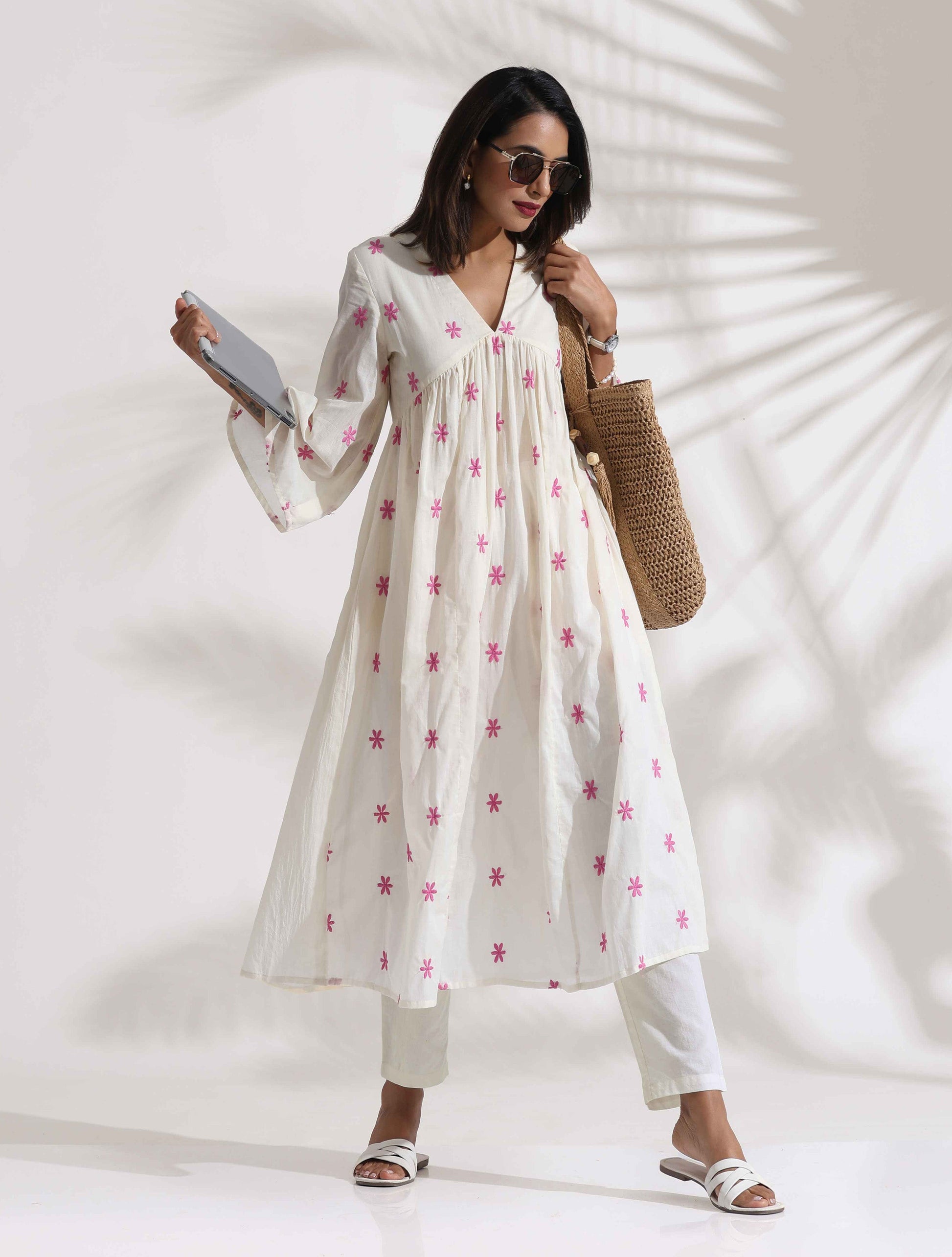 - Elevate your style with this off-white cotton floral embroidered flared kurta with off-white pants, it's an ideal blend of elegance and comfort.