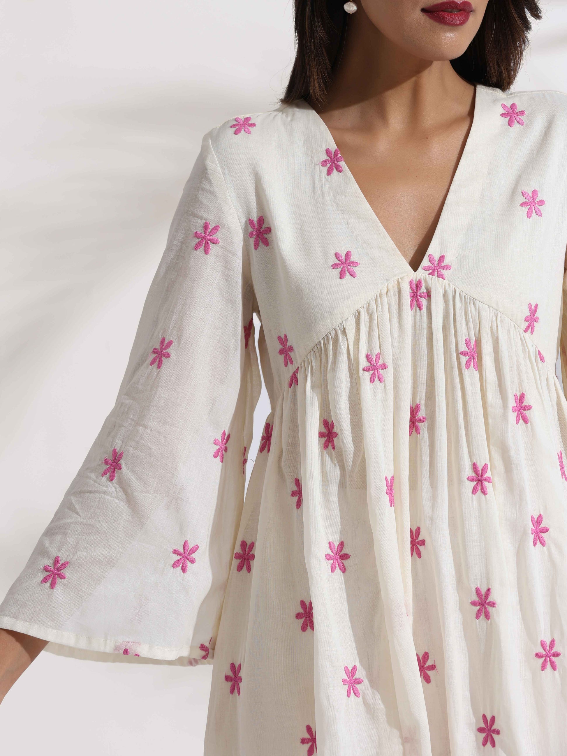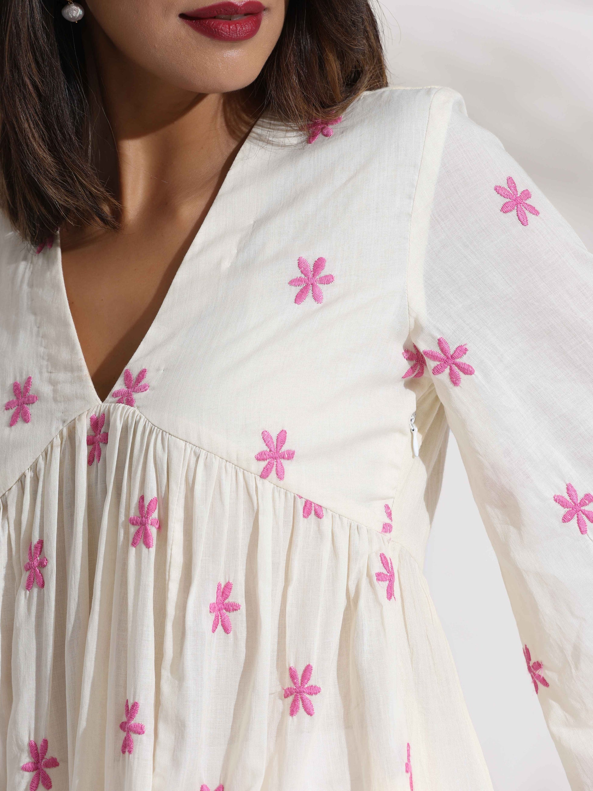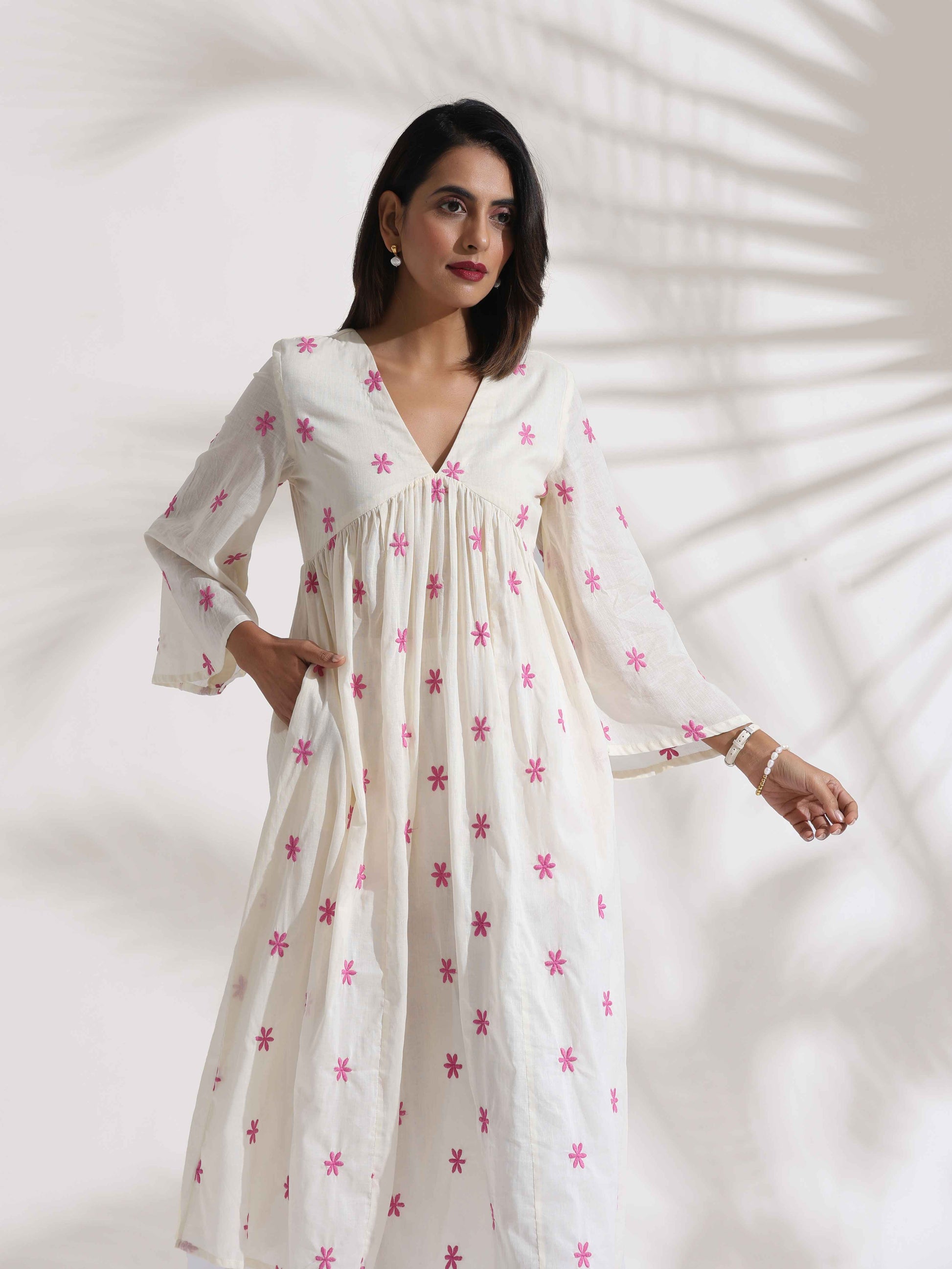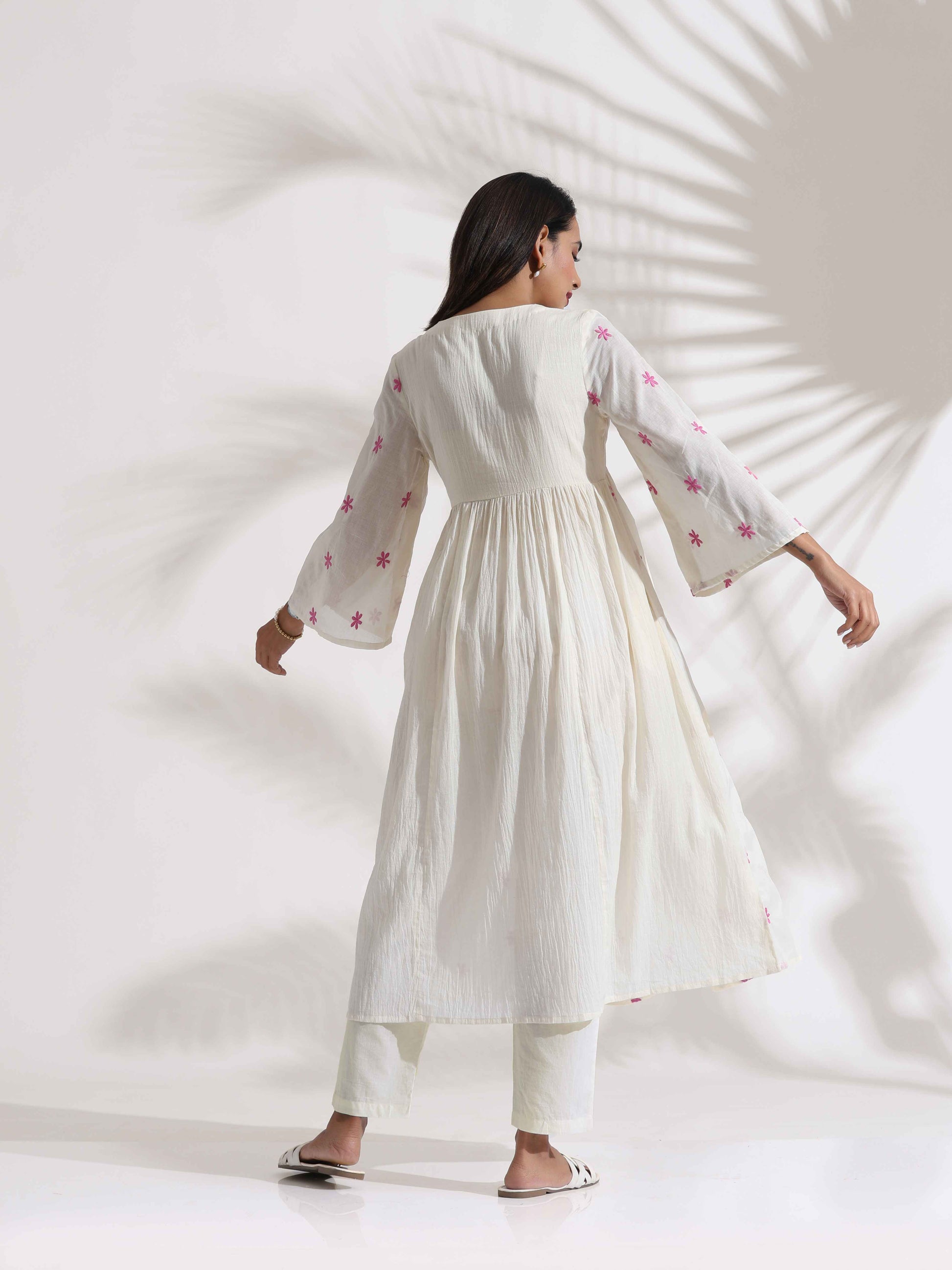 trueBrowns Off-White Cotton Floral Embroidered Flared Kurta Set
