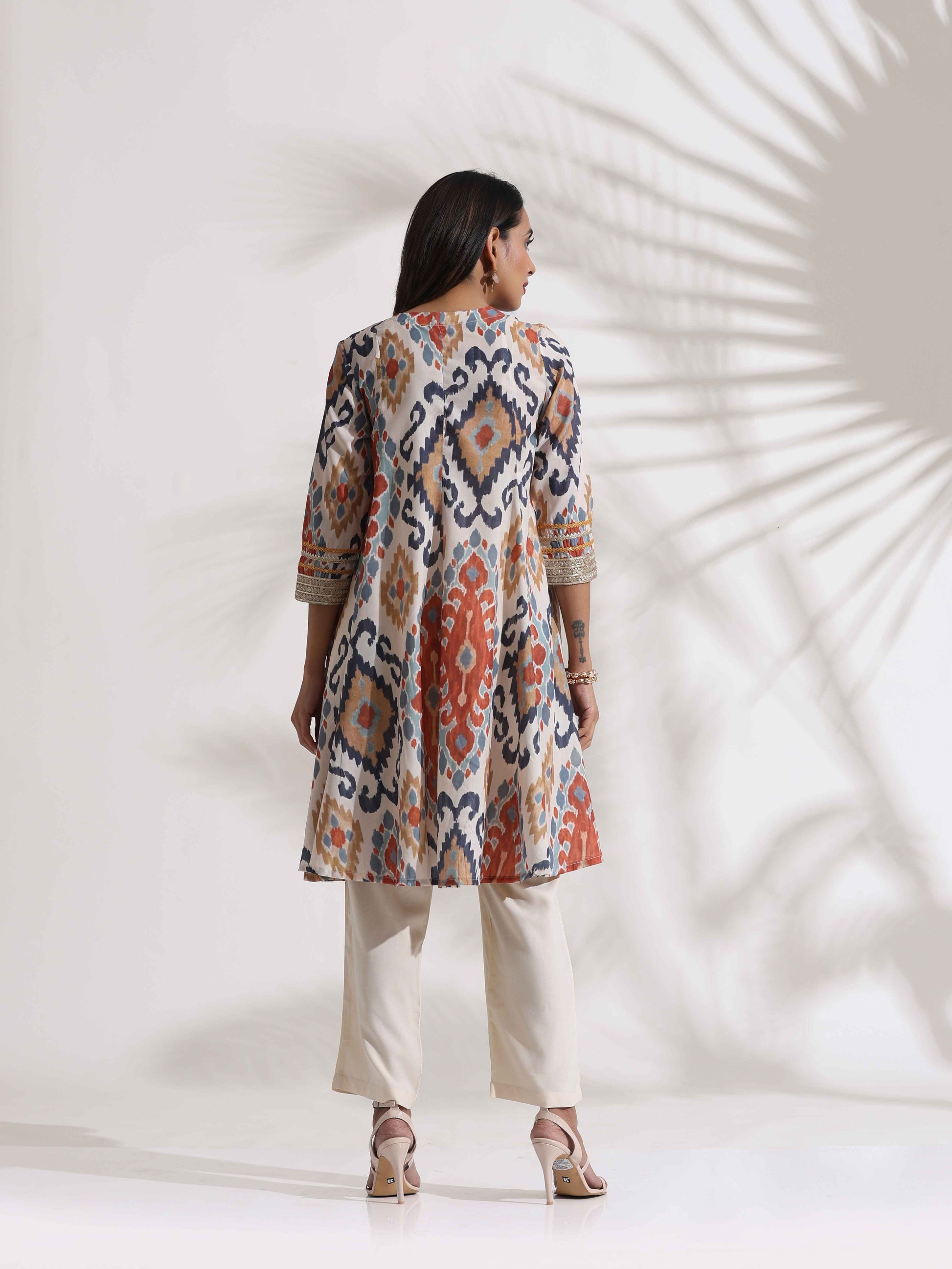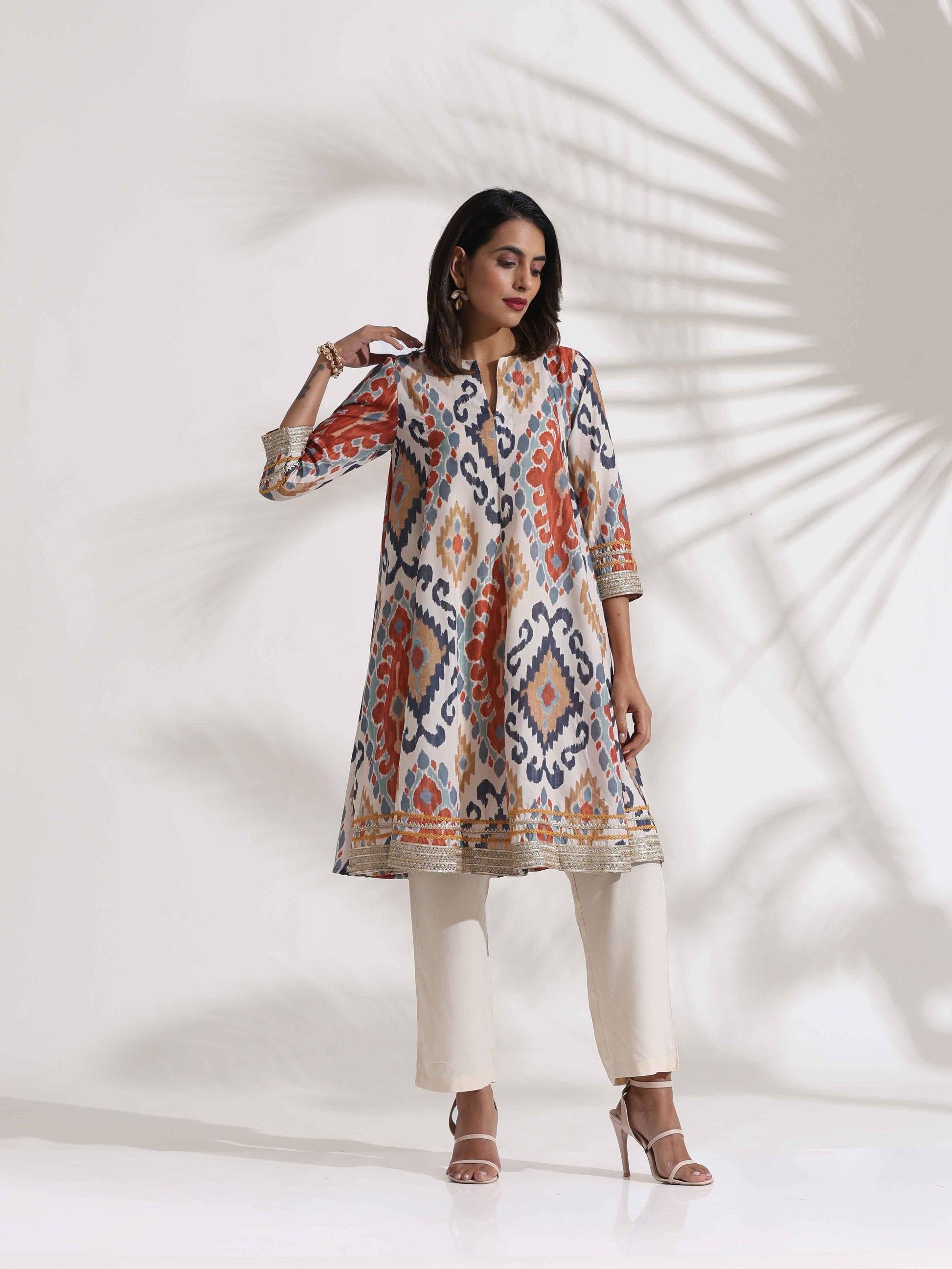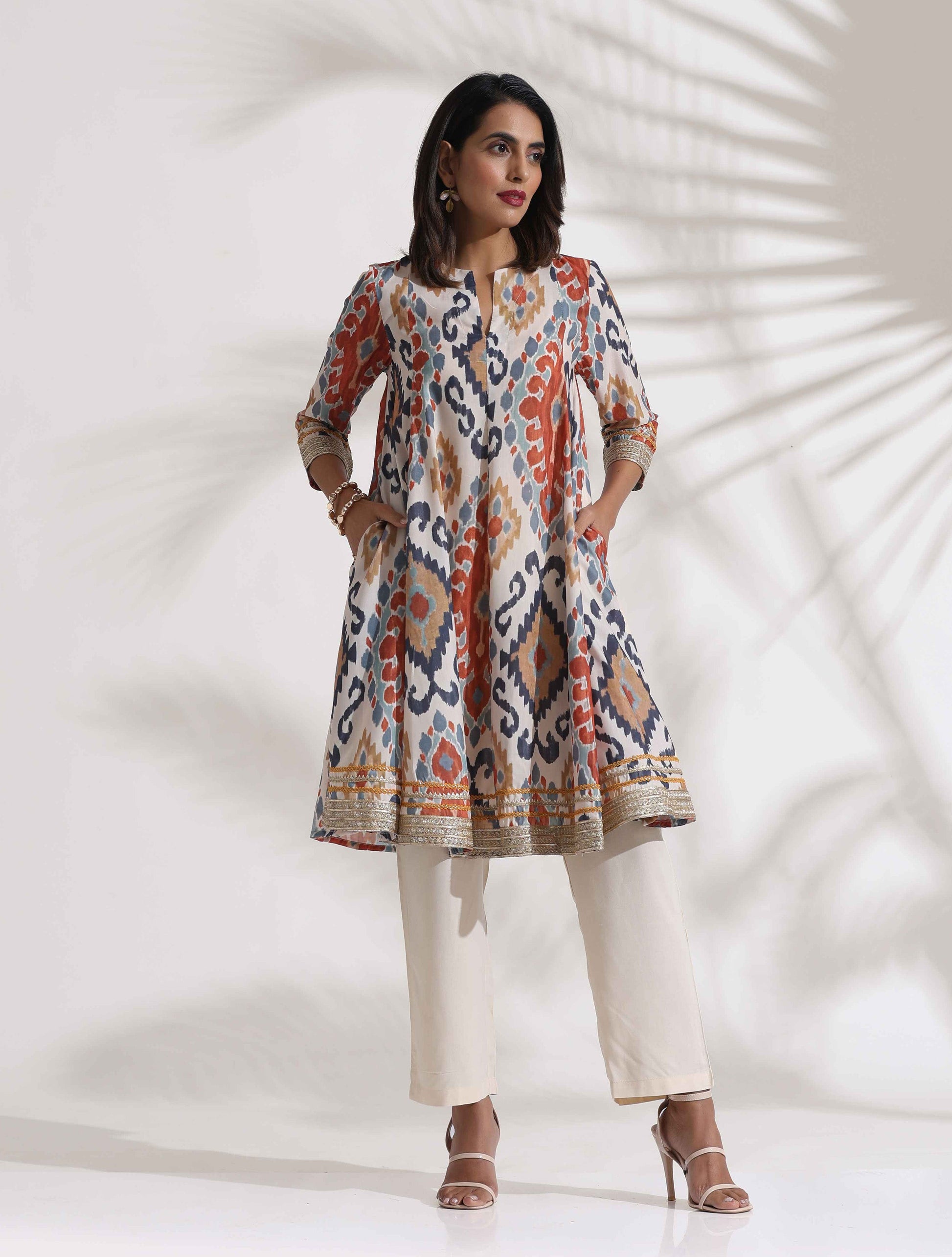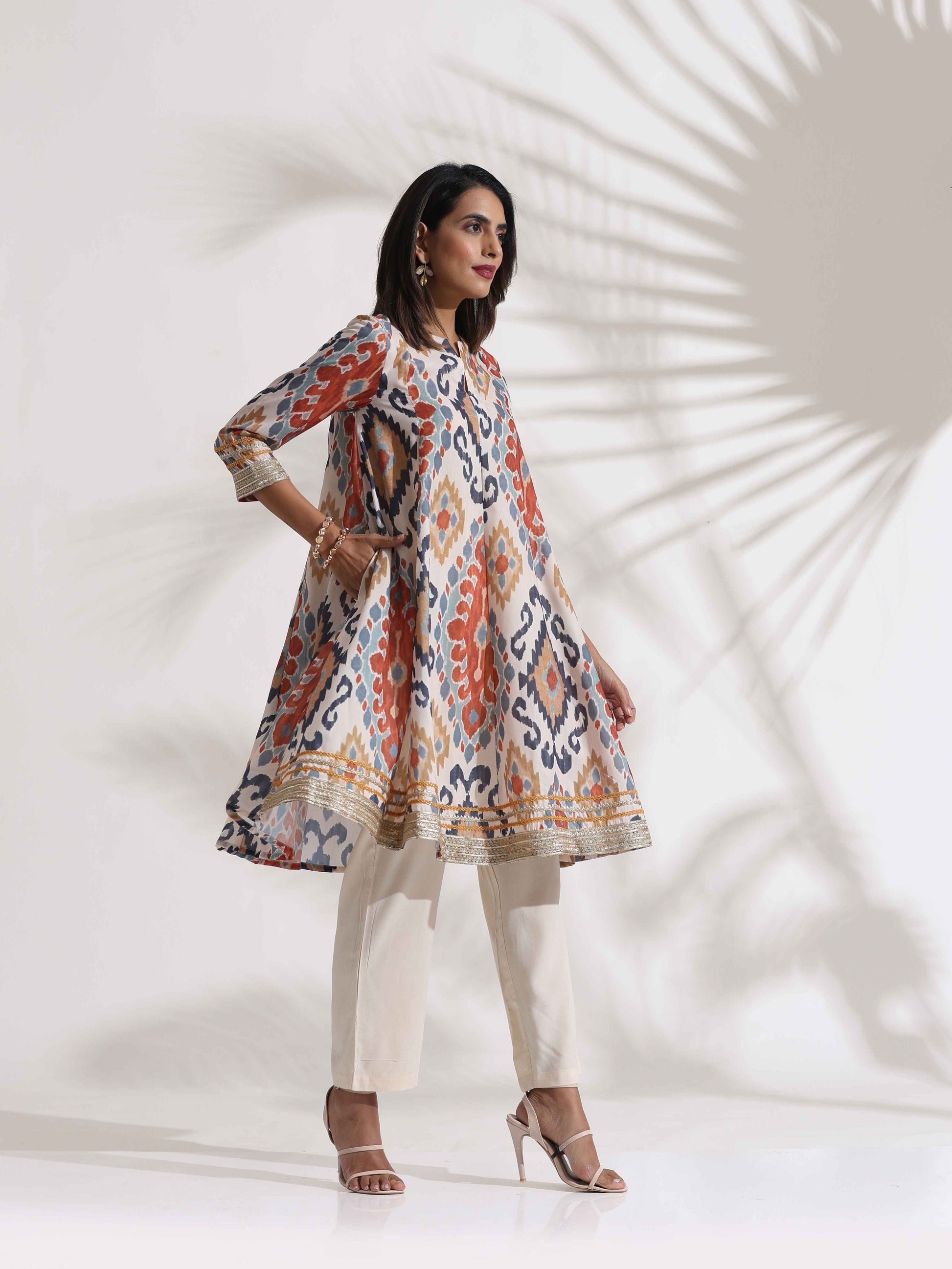 - Elevate your style with this ikat printed kalidar kurta, adorned with zari lace on the sleeves and hem.