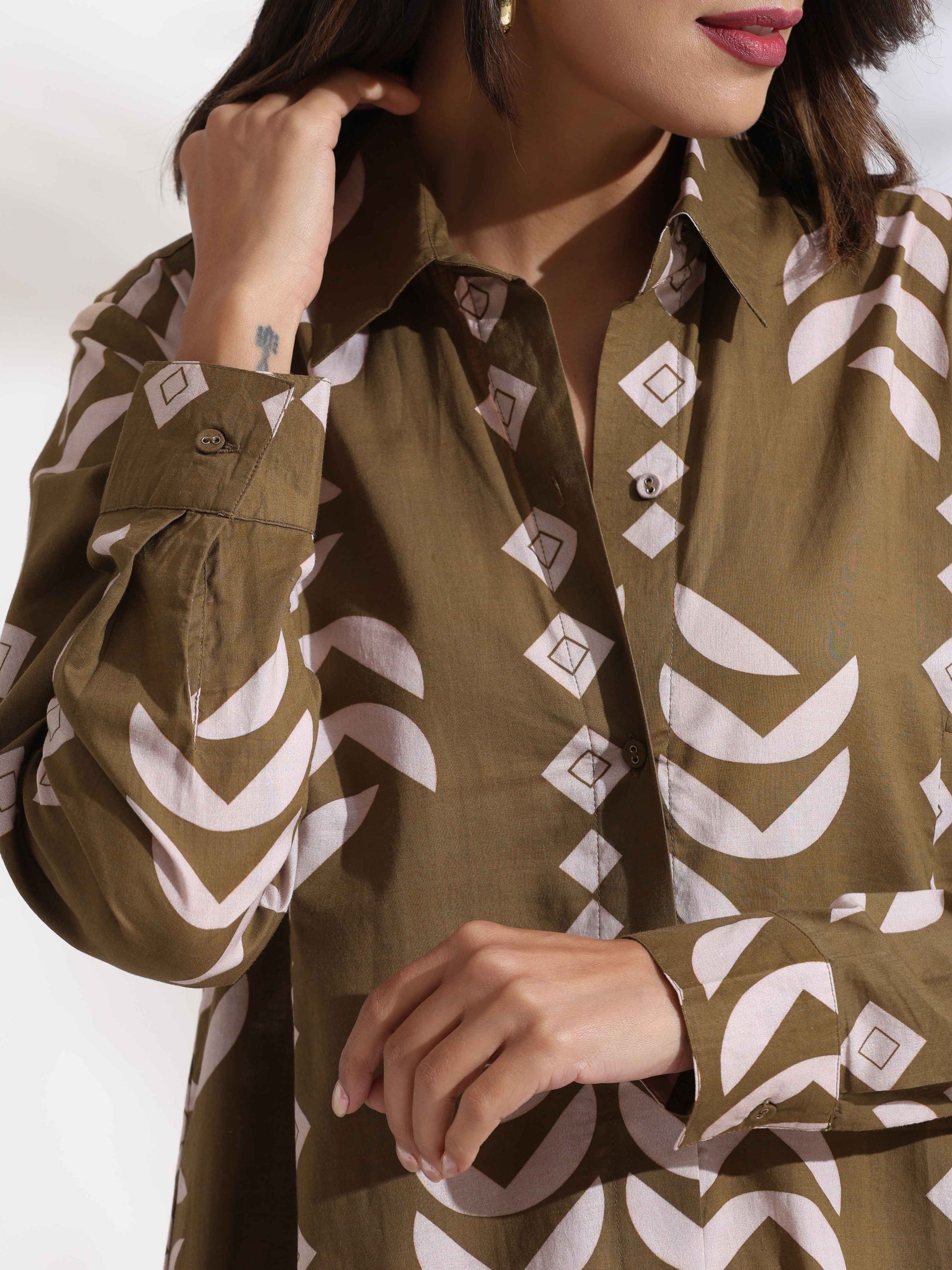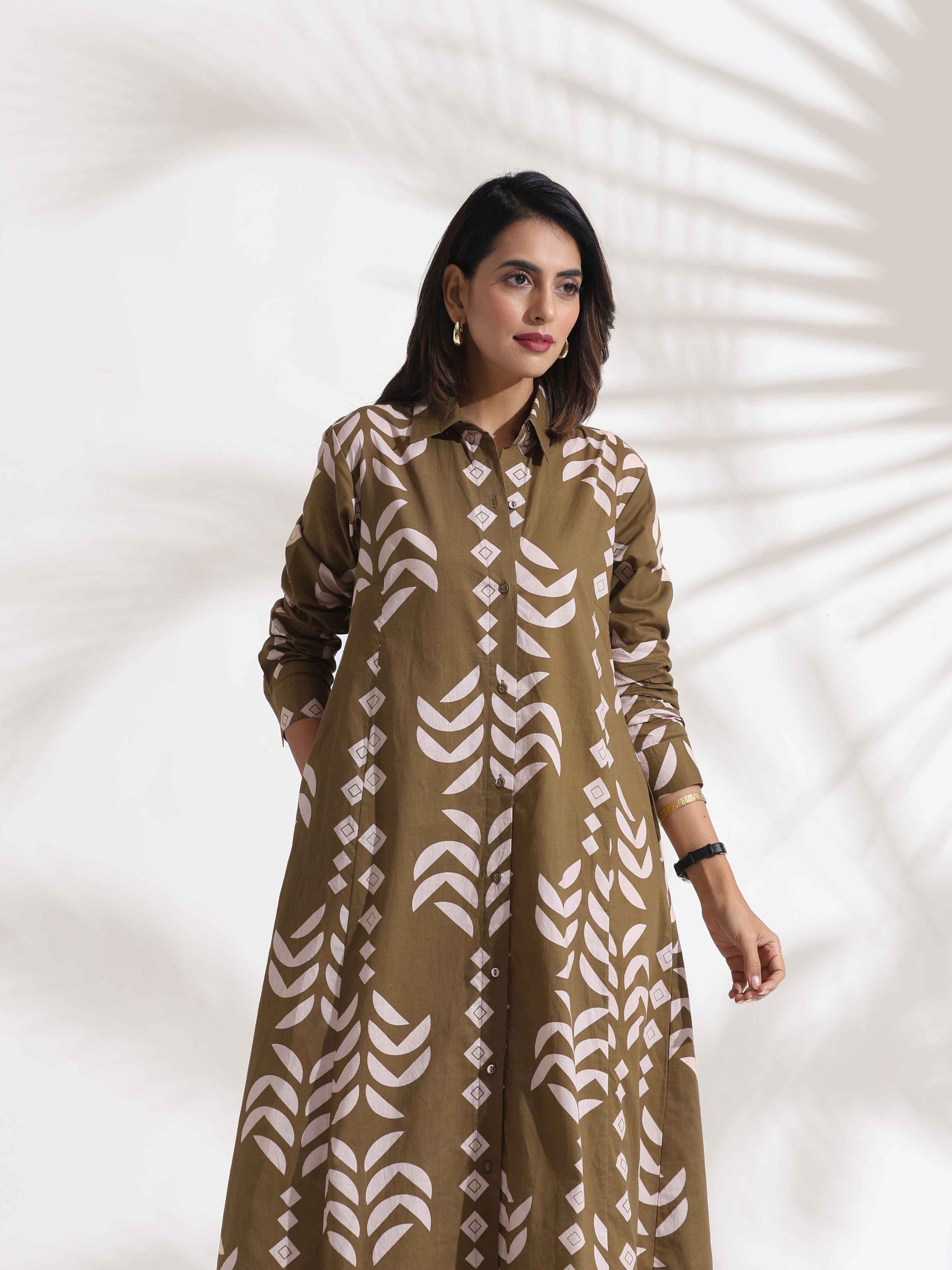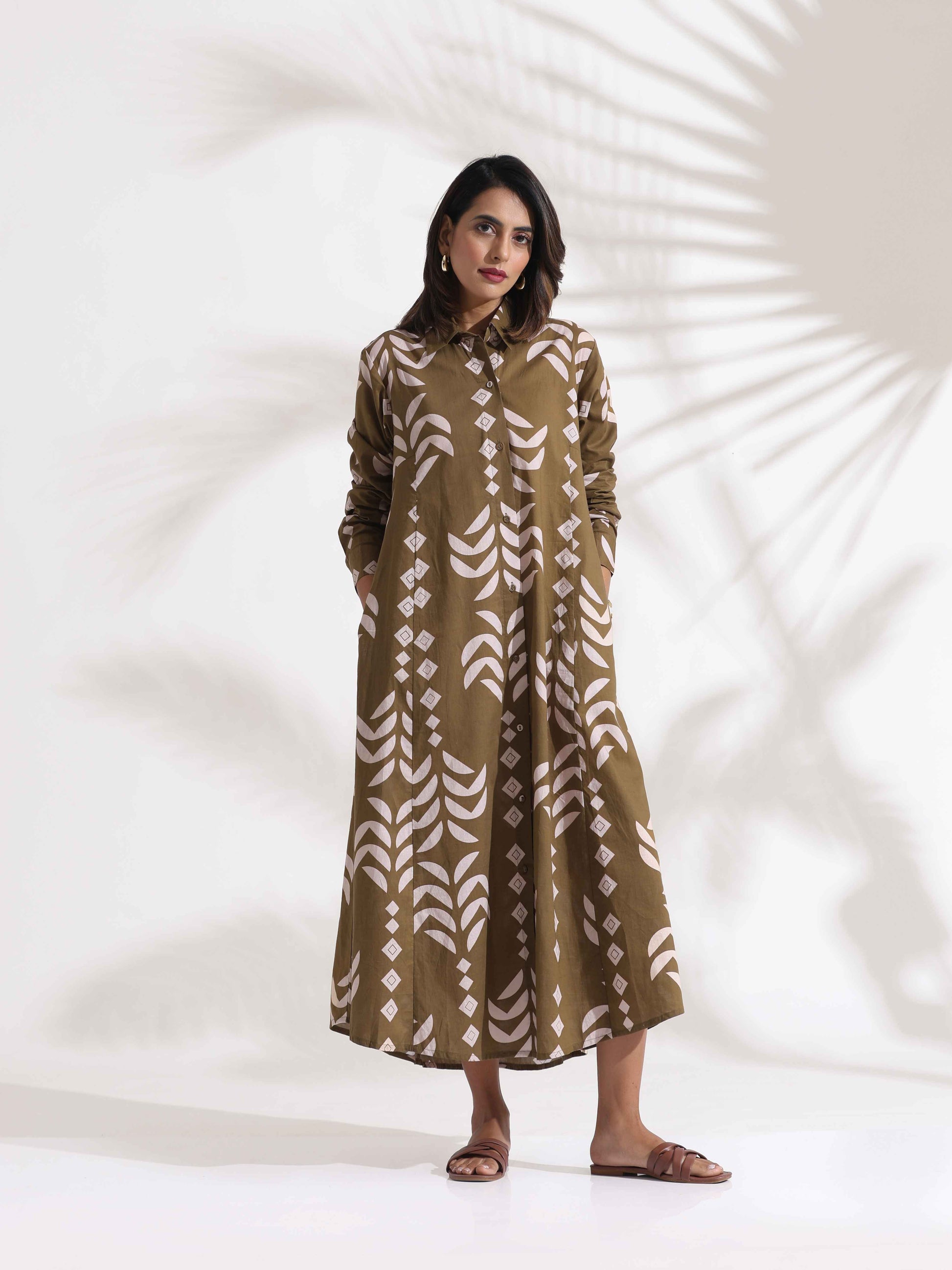 trueBrowns Olive Green Cotton Print Shirt Dress