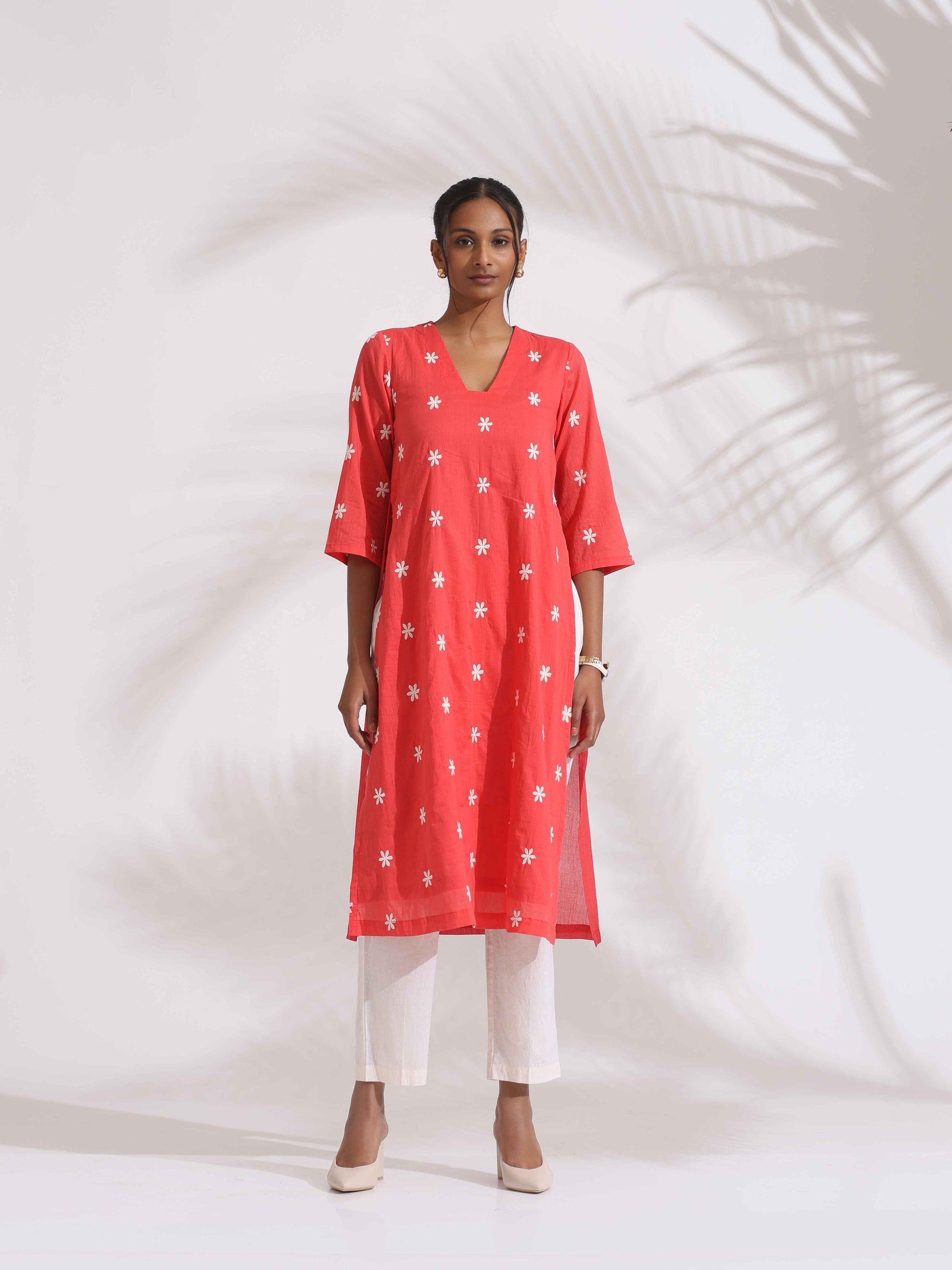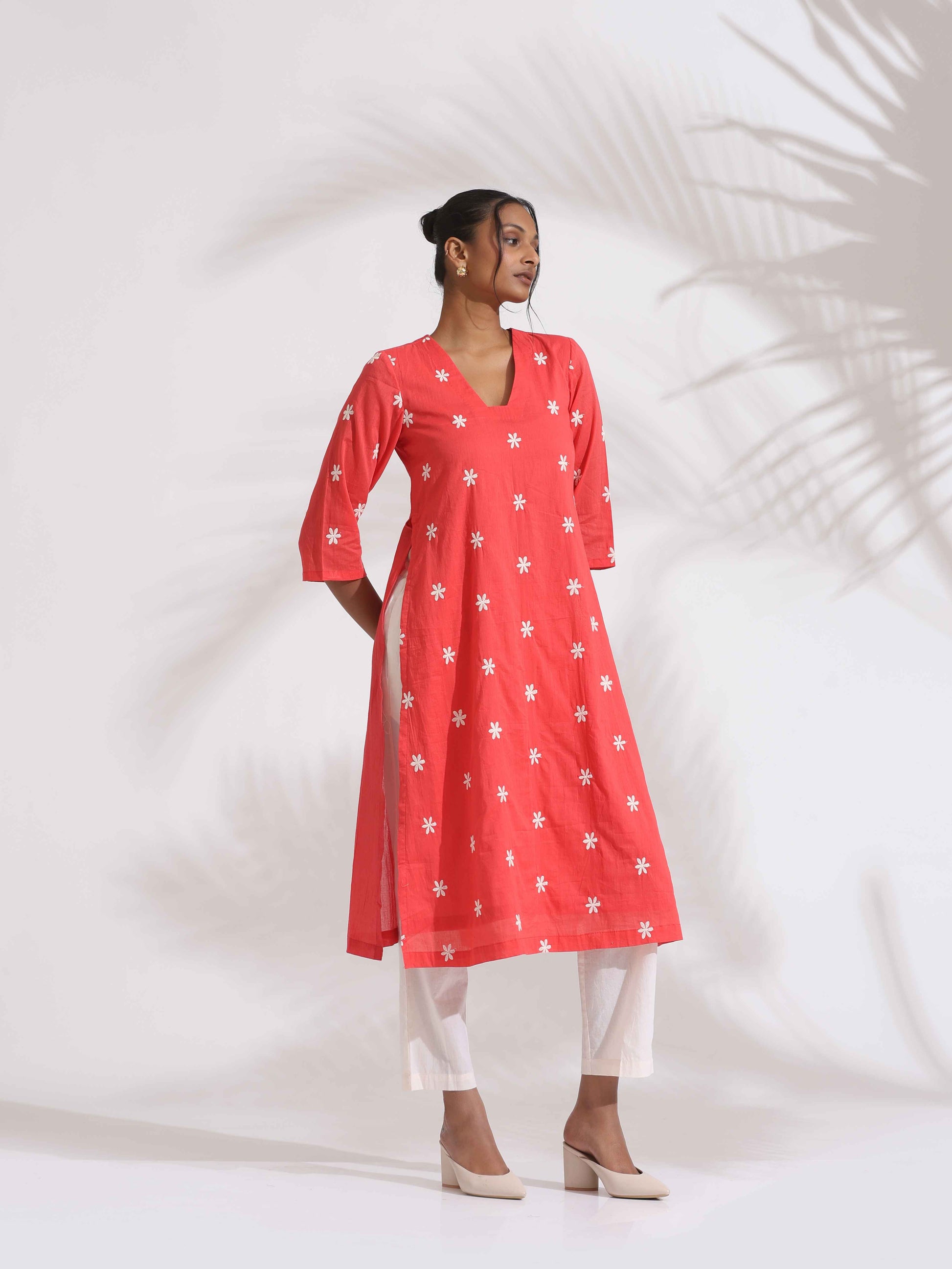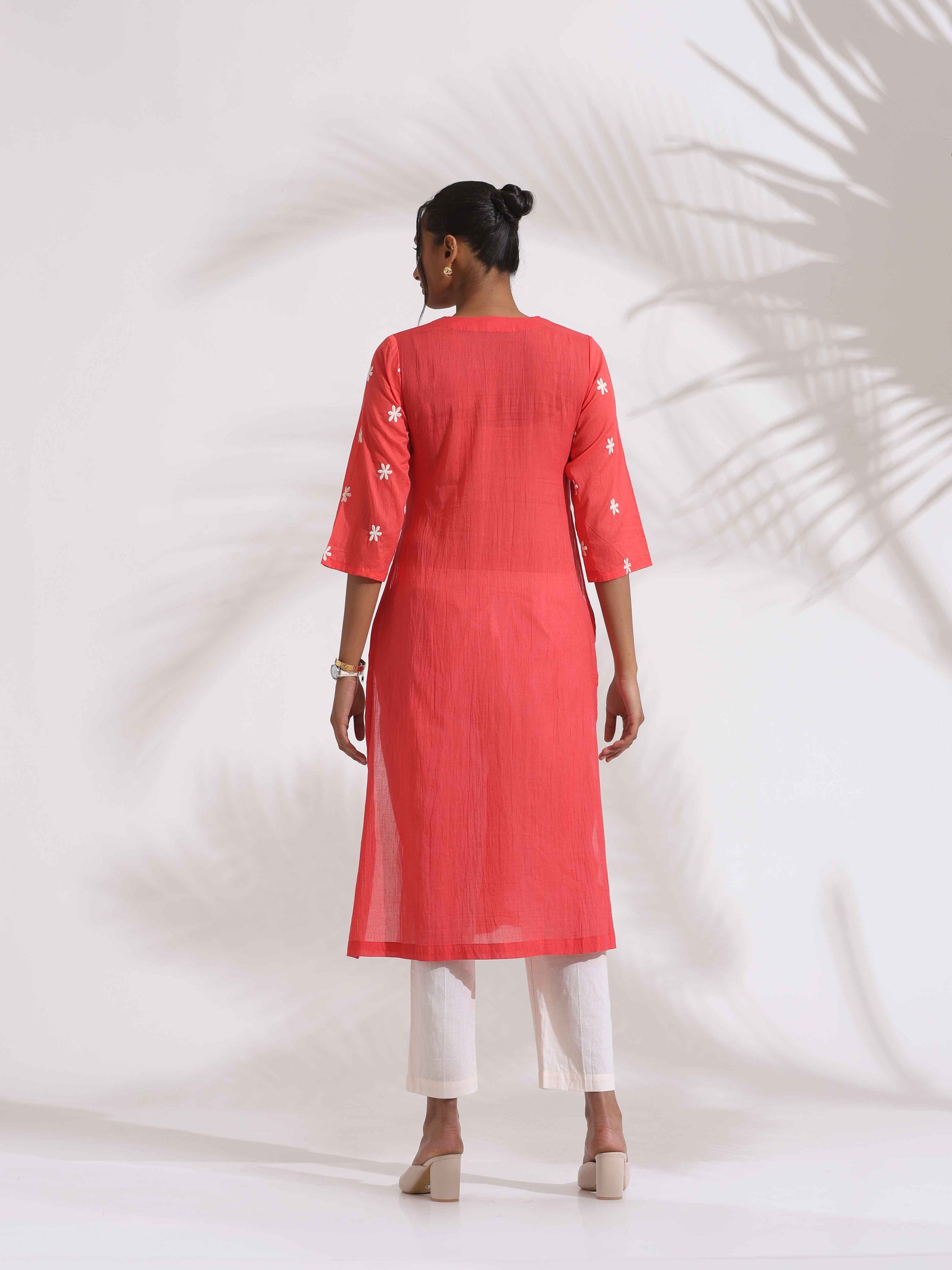 trueBrowns Orange Cotton Floral Embroidered Kurta Set