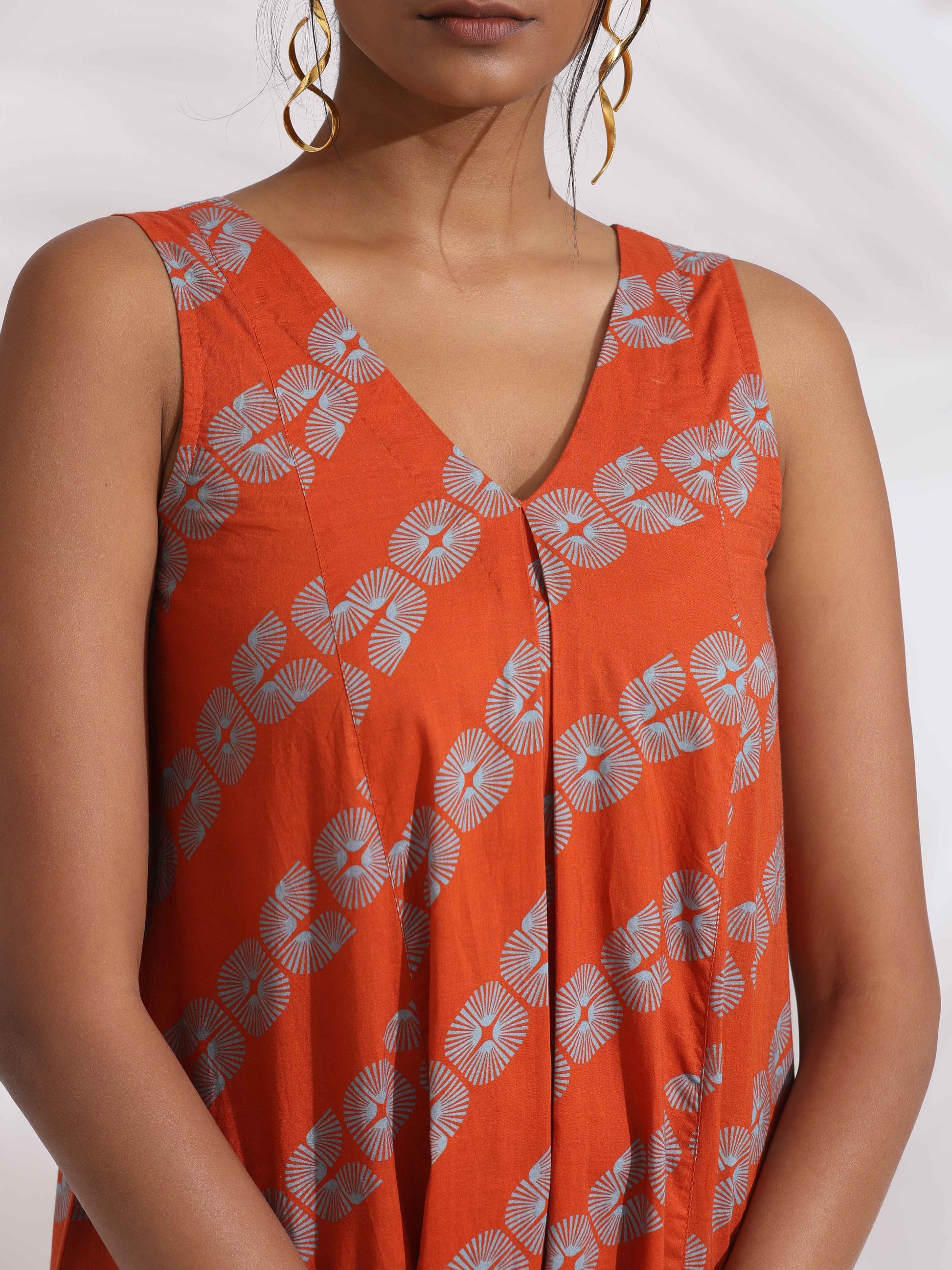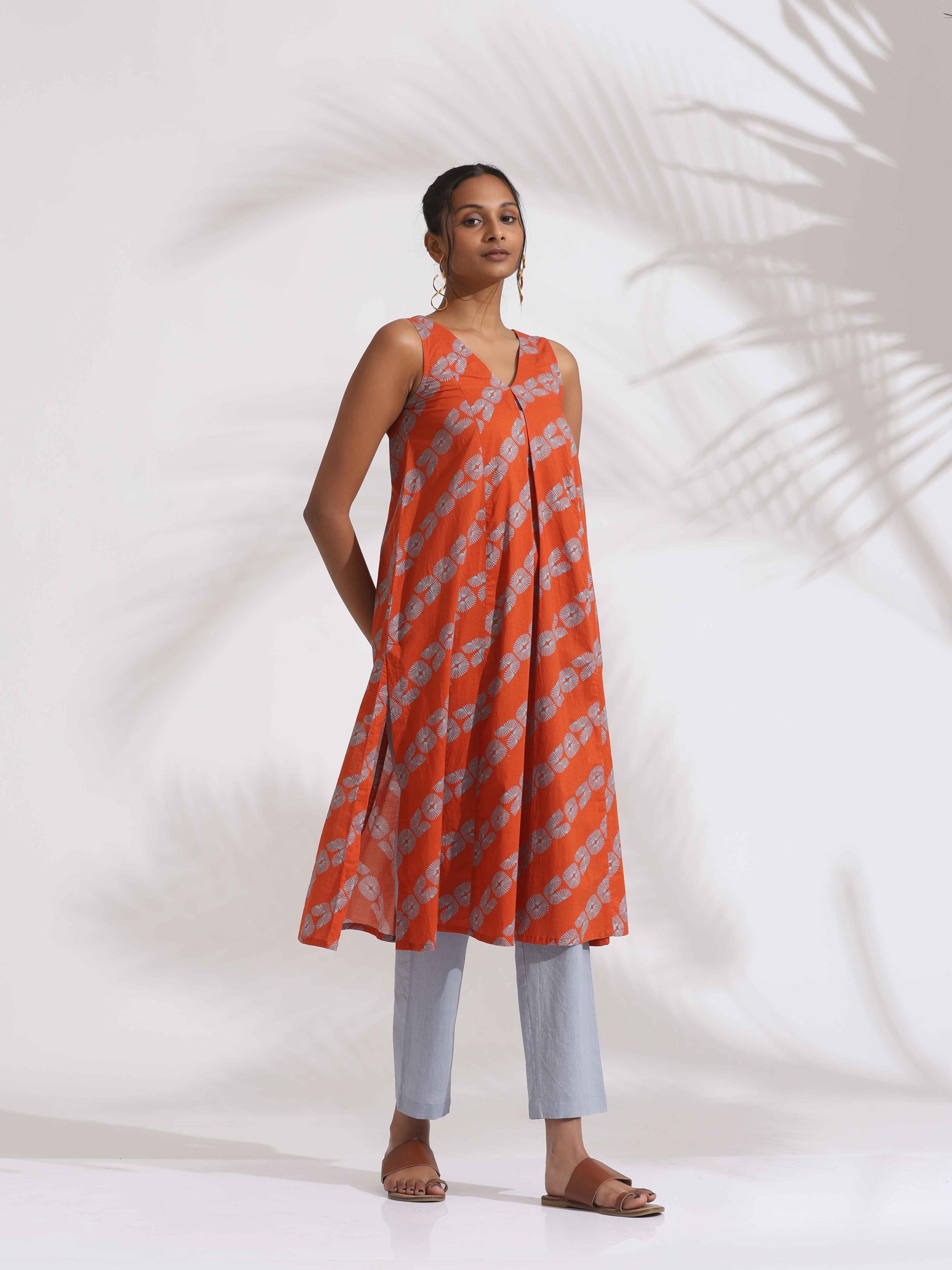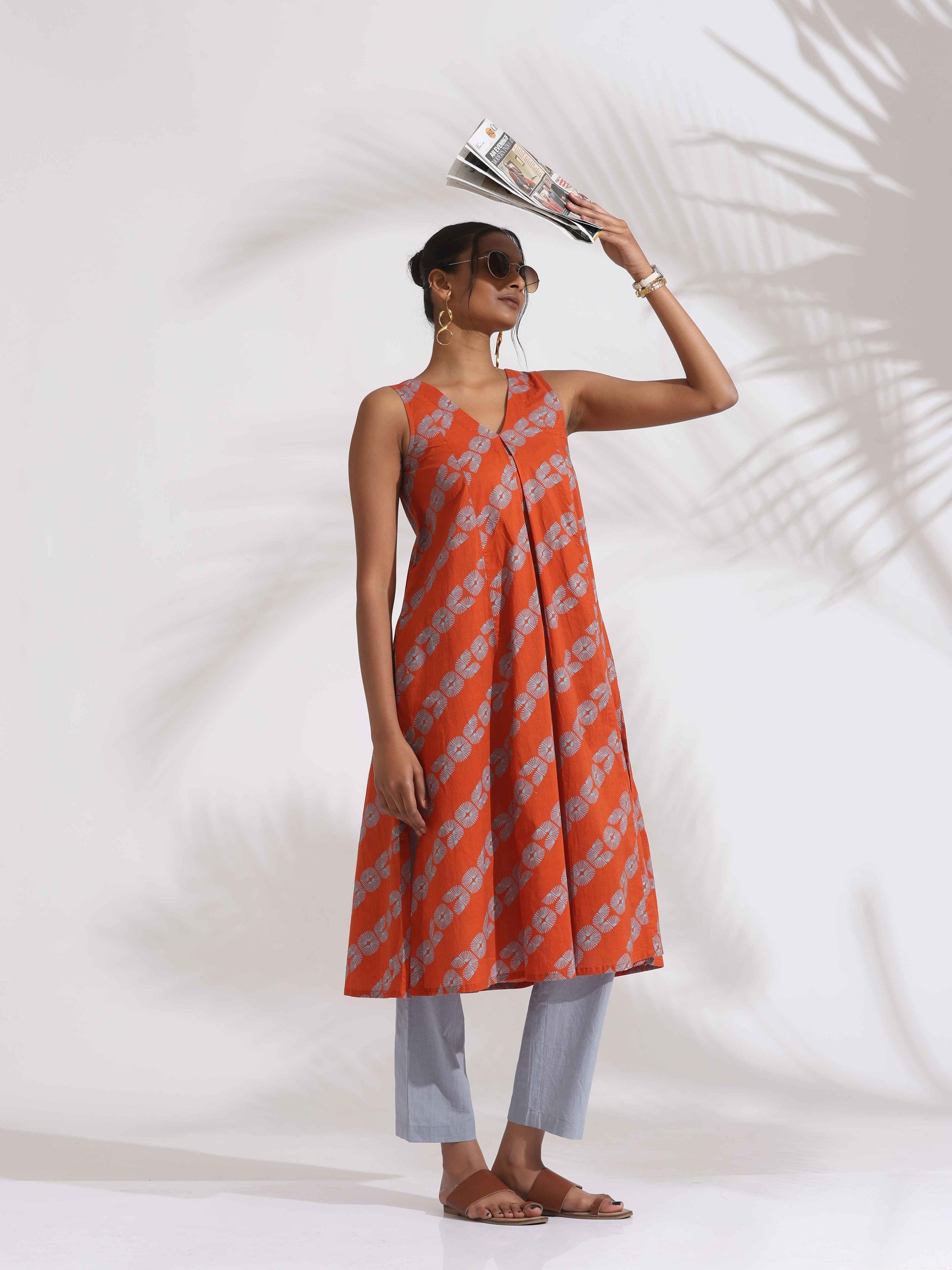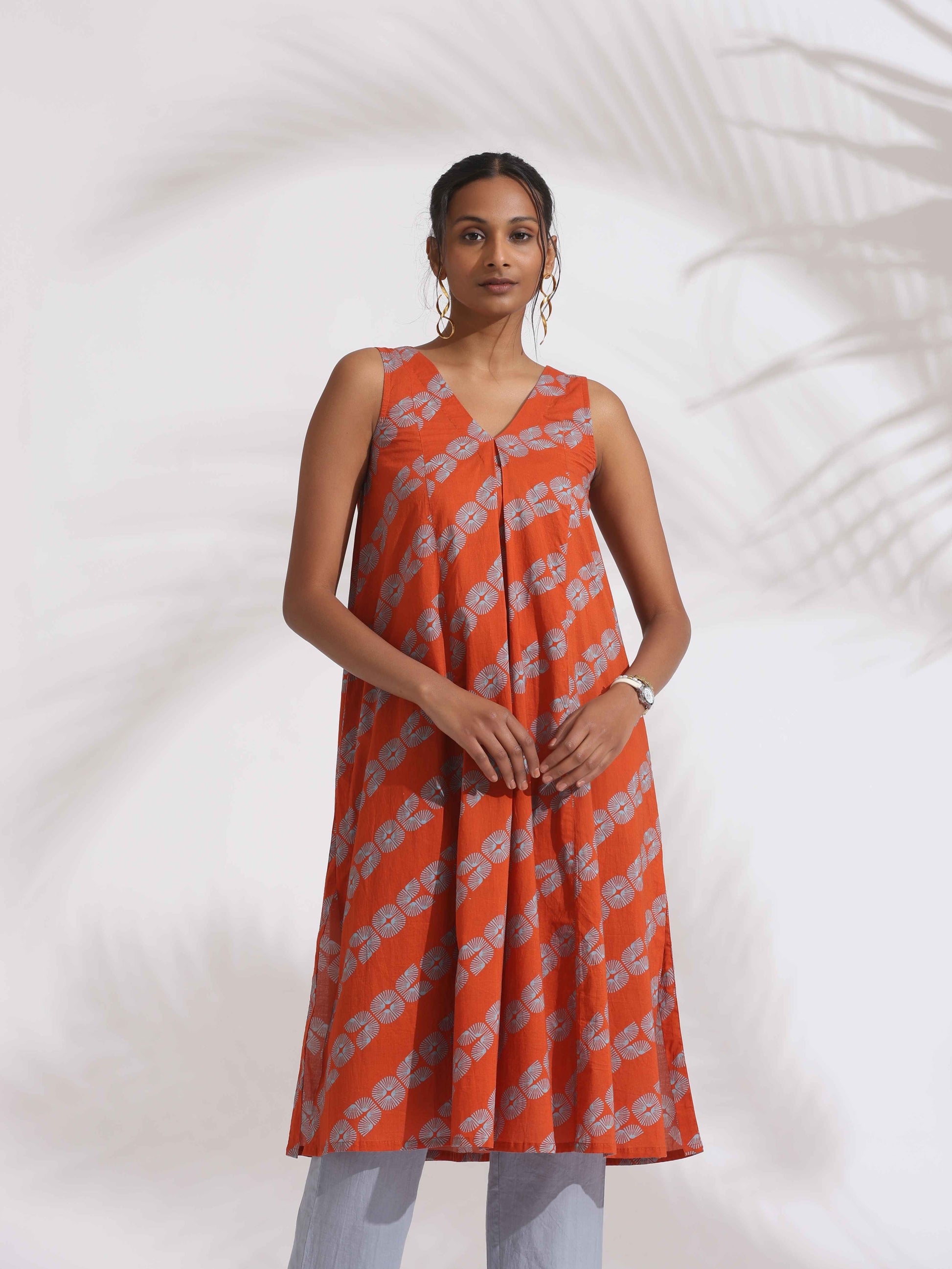 trueBrowns Orange Cotton Print Sleeveless Kurta Set