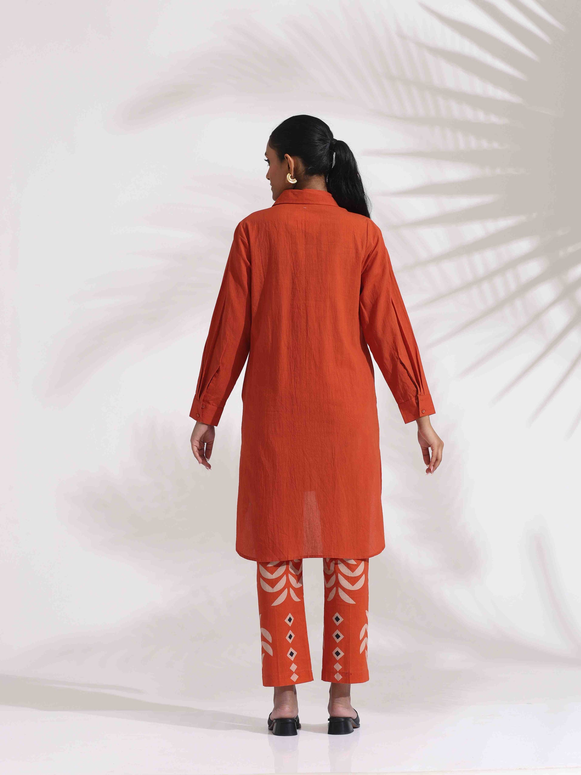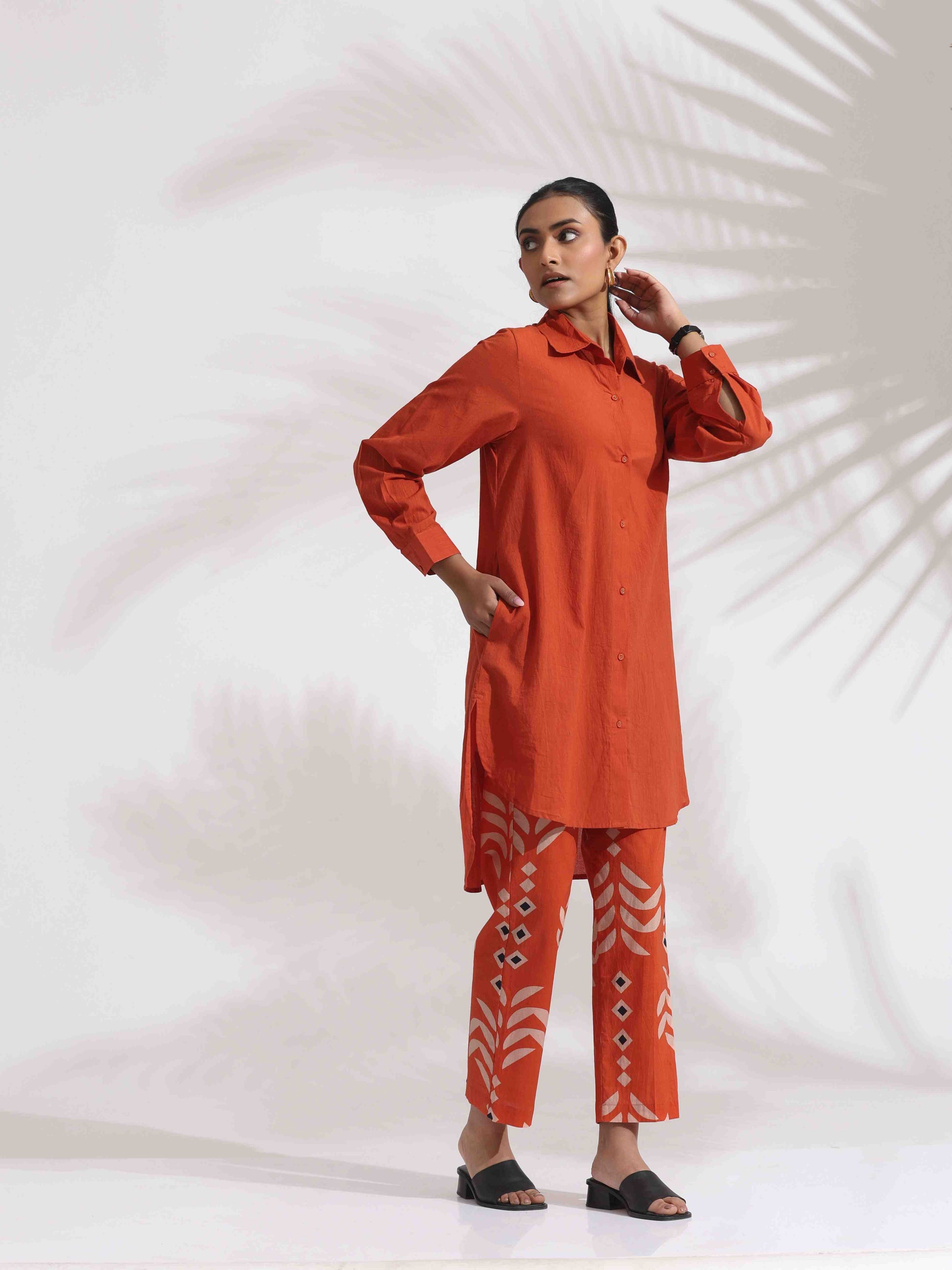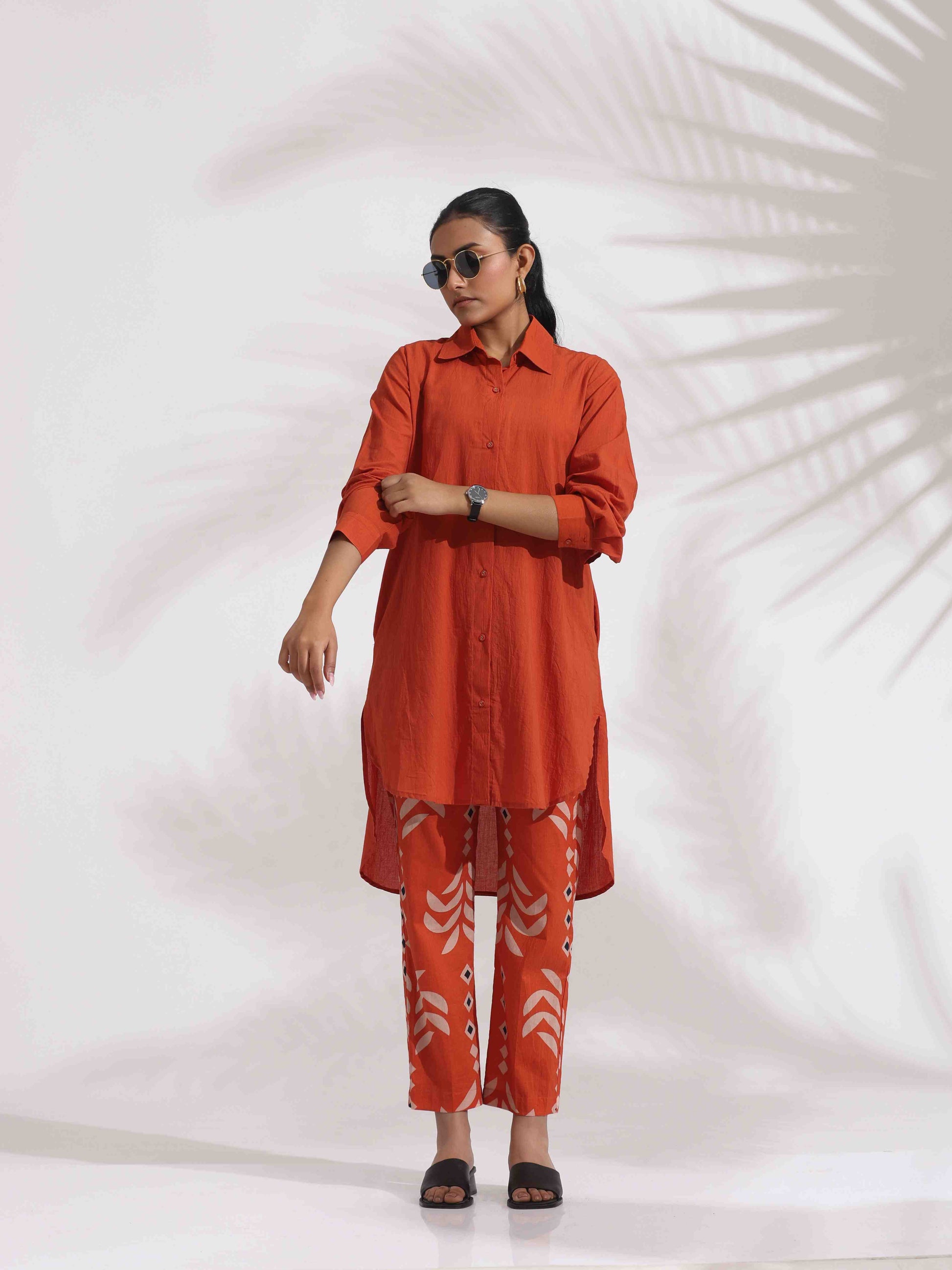 - Elevate your style and Embrace yourself with this stunning orange cotton solid kurta co-ord, complemented by vibrant orange print pants. This ensemble combines chic sophistication with unmatched comfort, making it the perfect choice for both casual and semi-formal occasions.