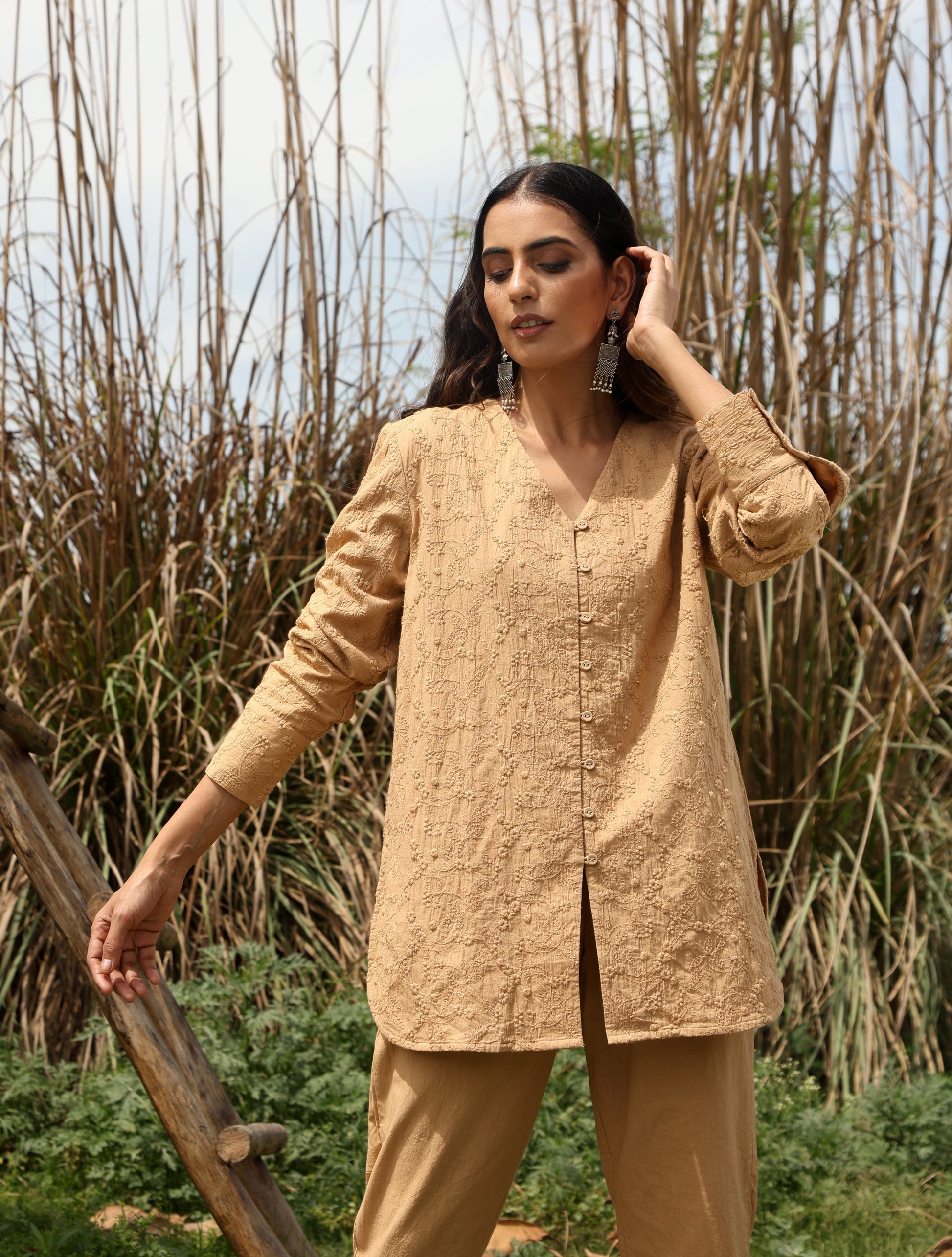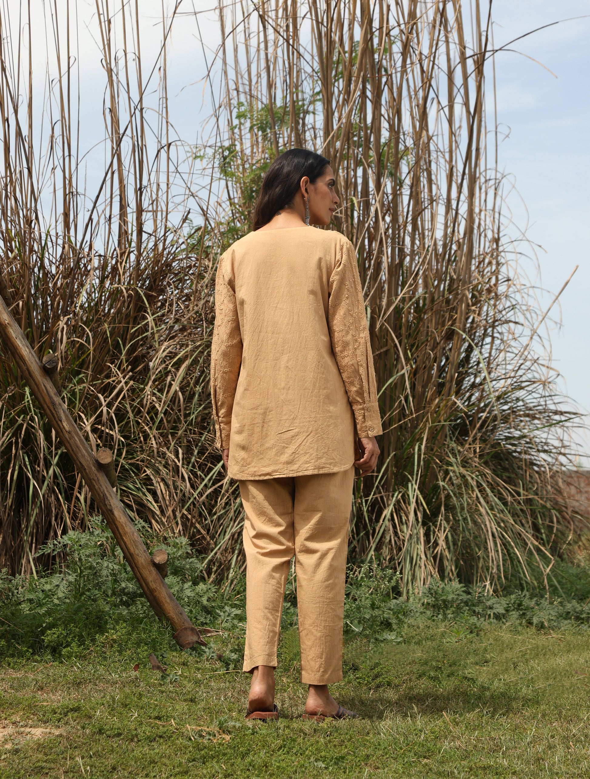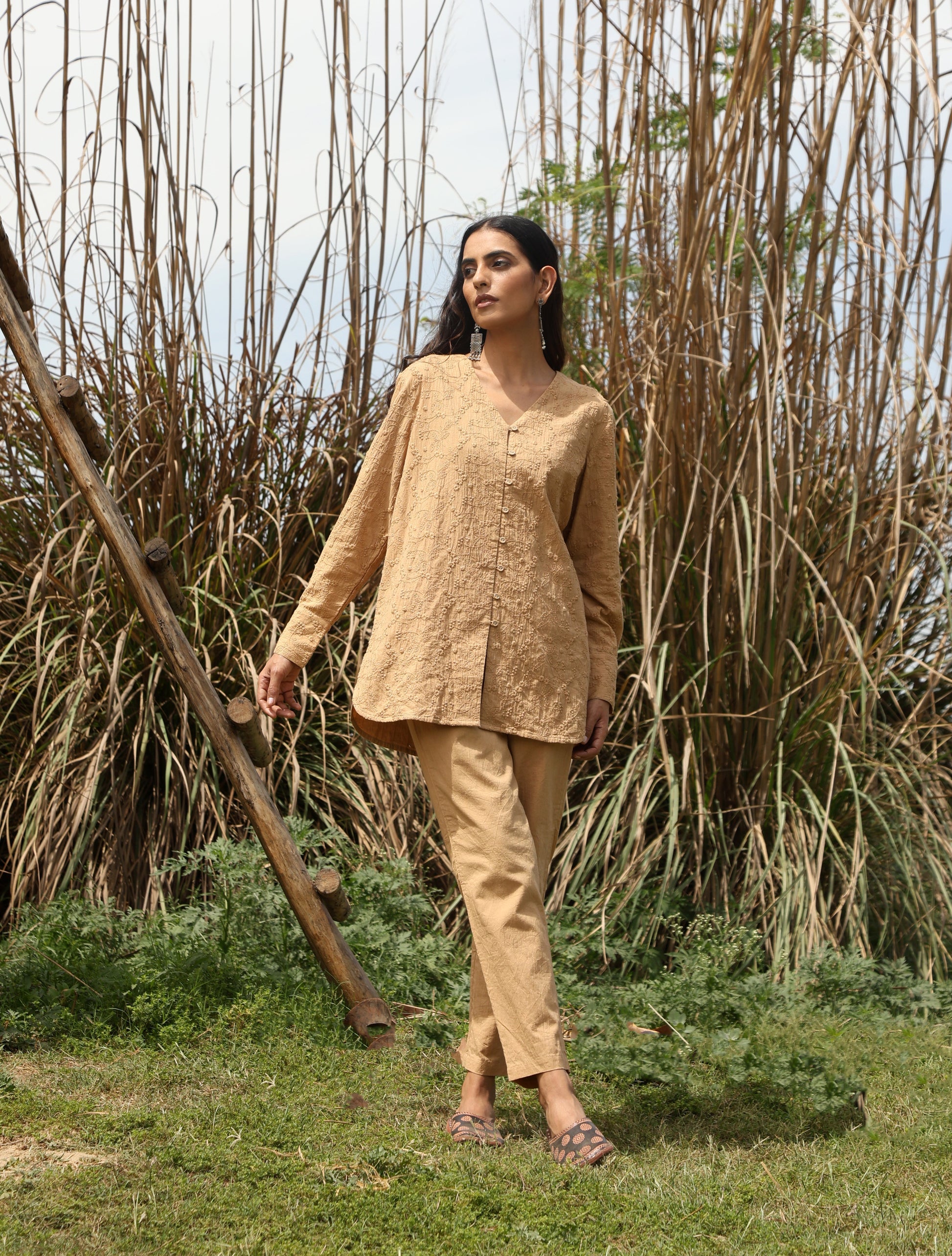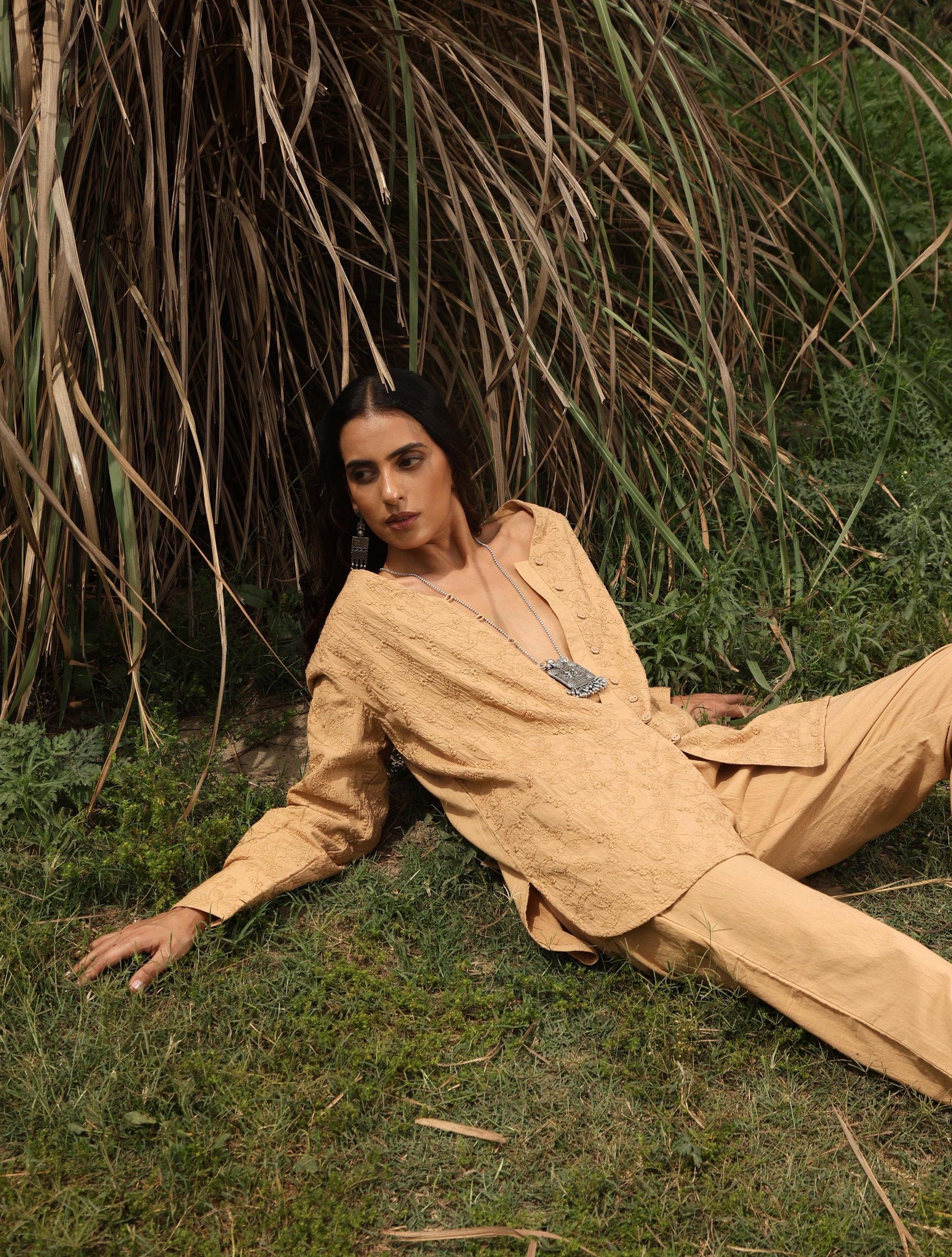 - Cotton embroidered co-ord set with V-neckline and cuff. Paired with elasticated waist pant.