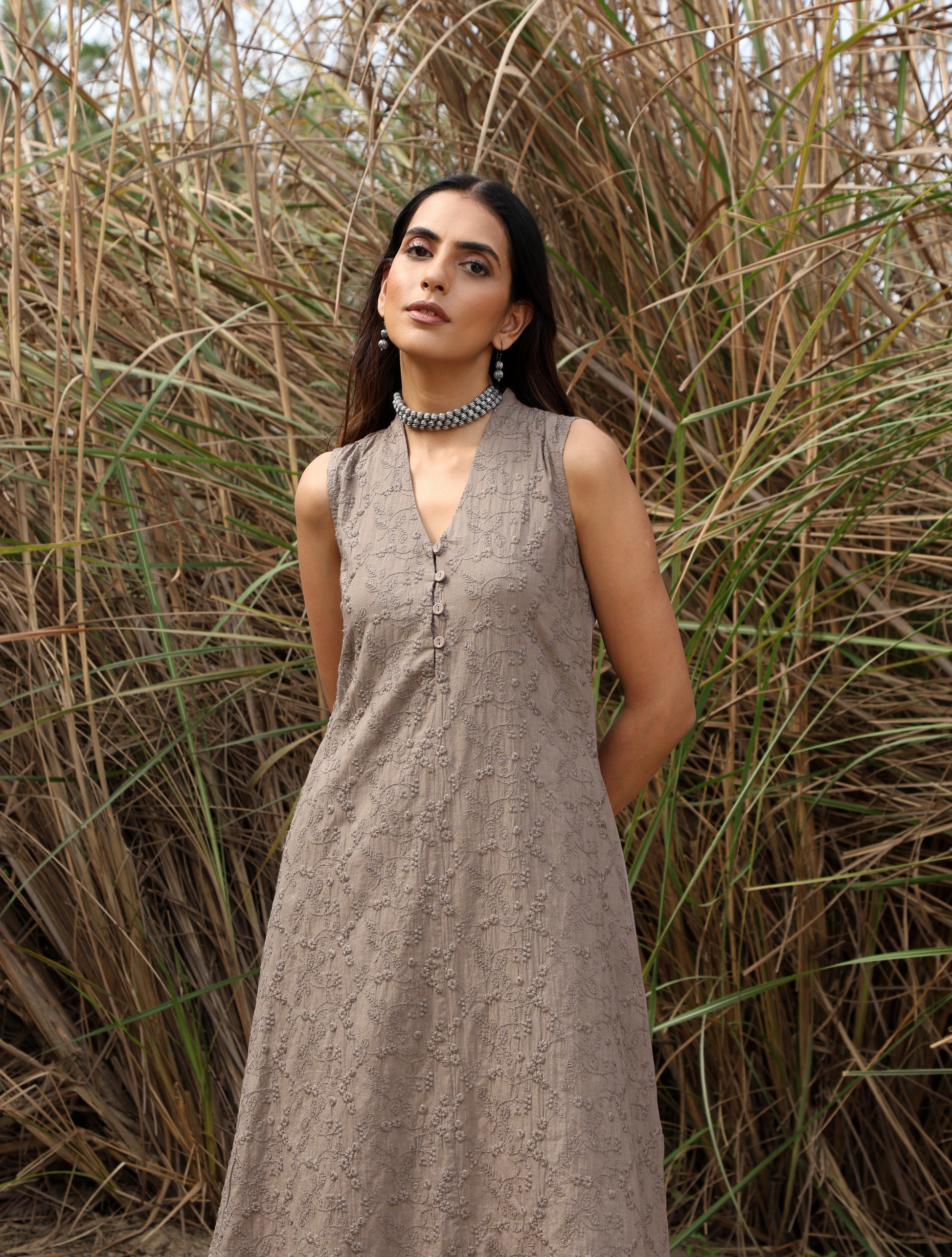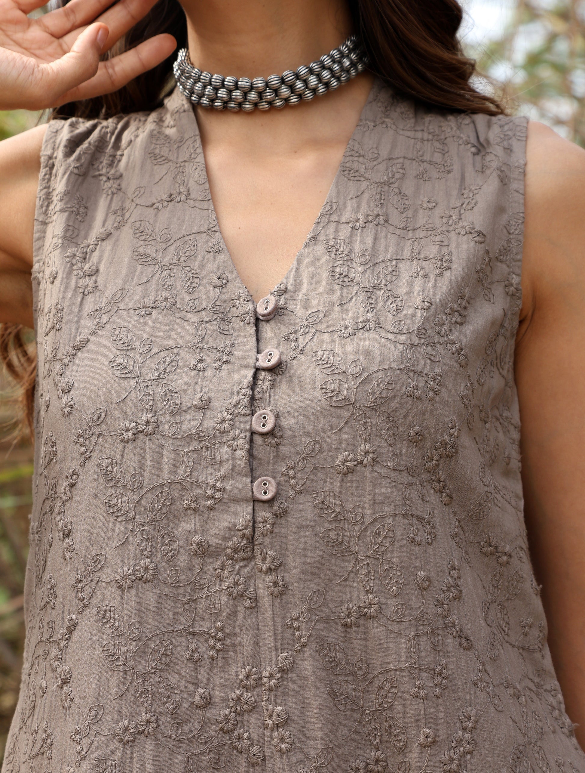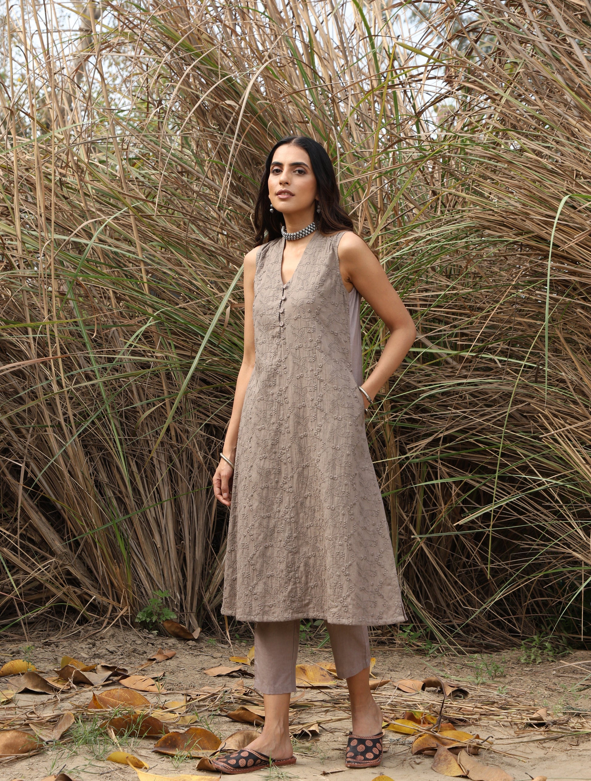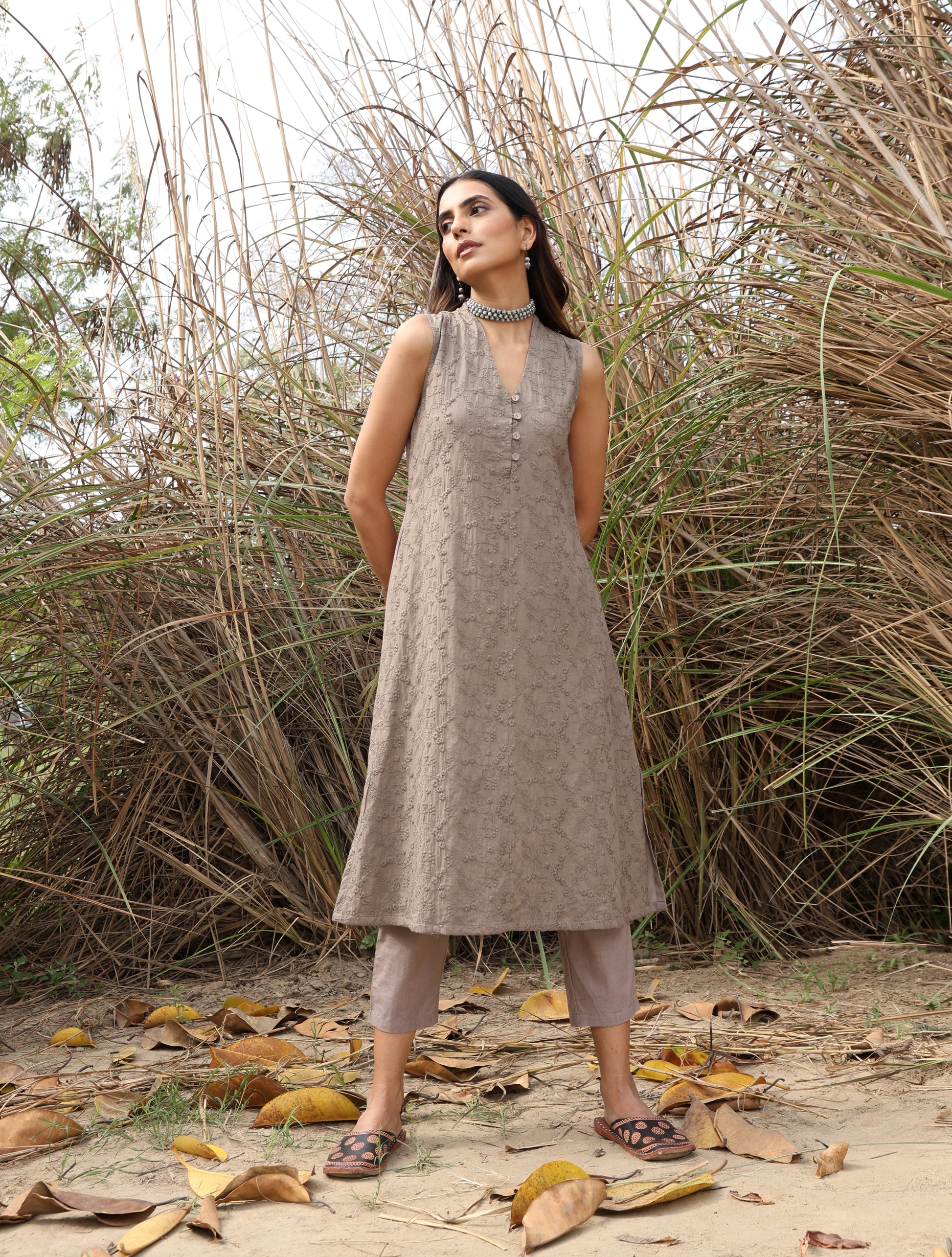 - Cotton Embroidered Sleeveless Kurta with V-neckline and front opening. Paired with solid elasticated waist pant.
