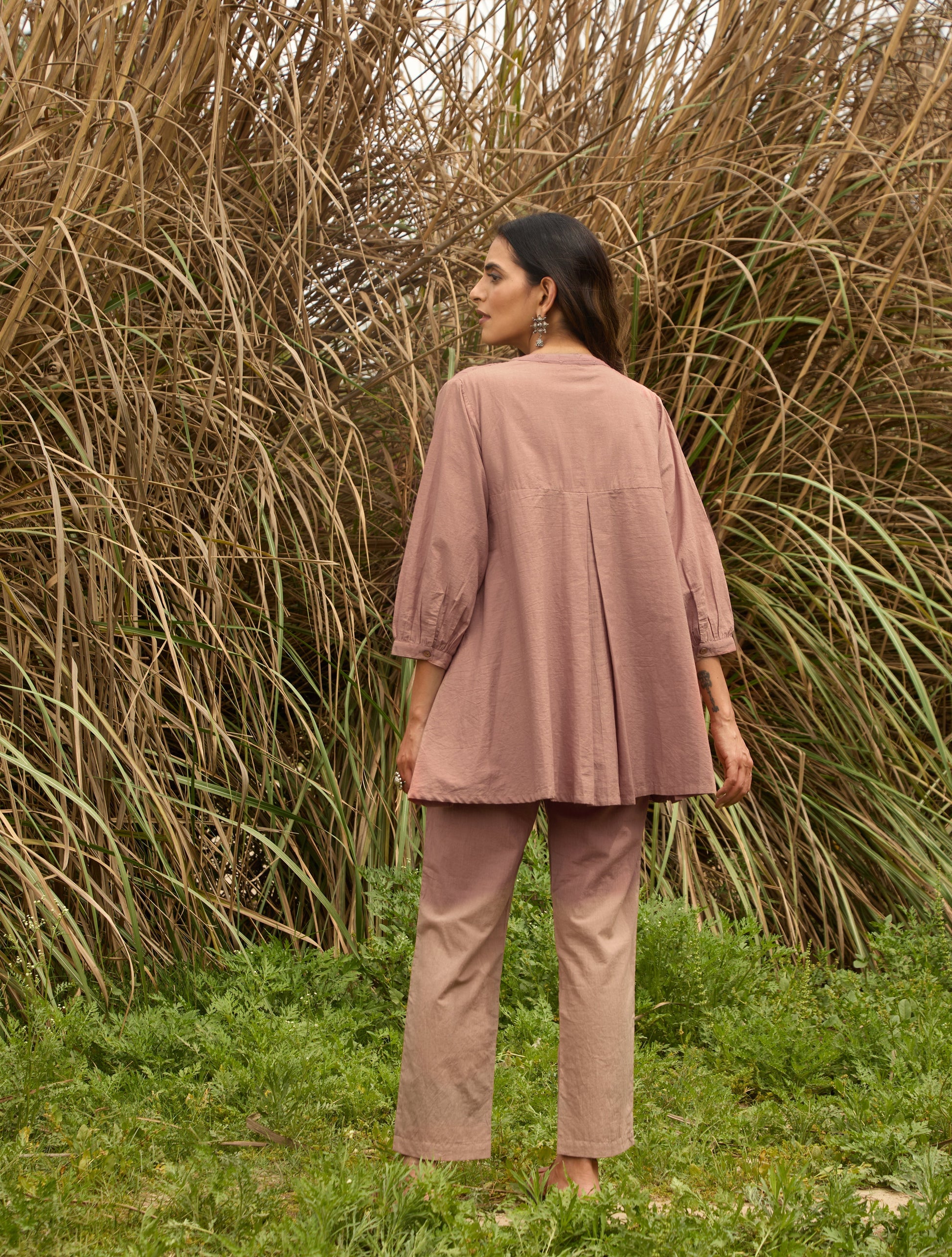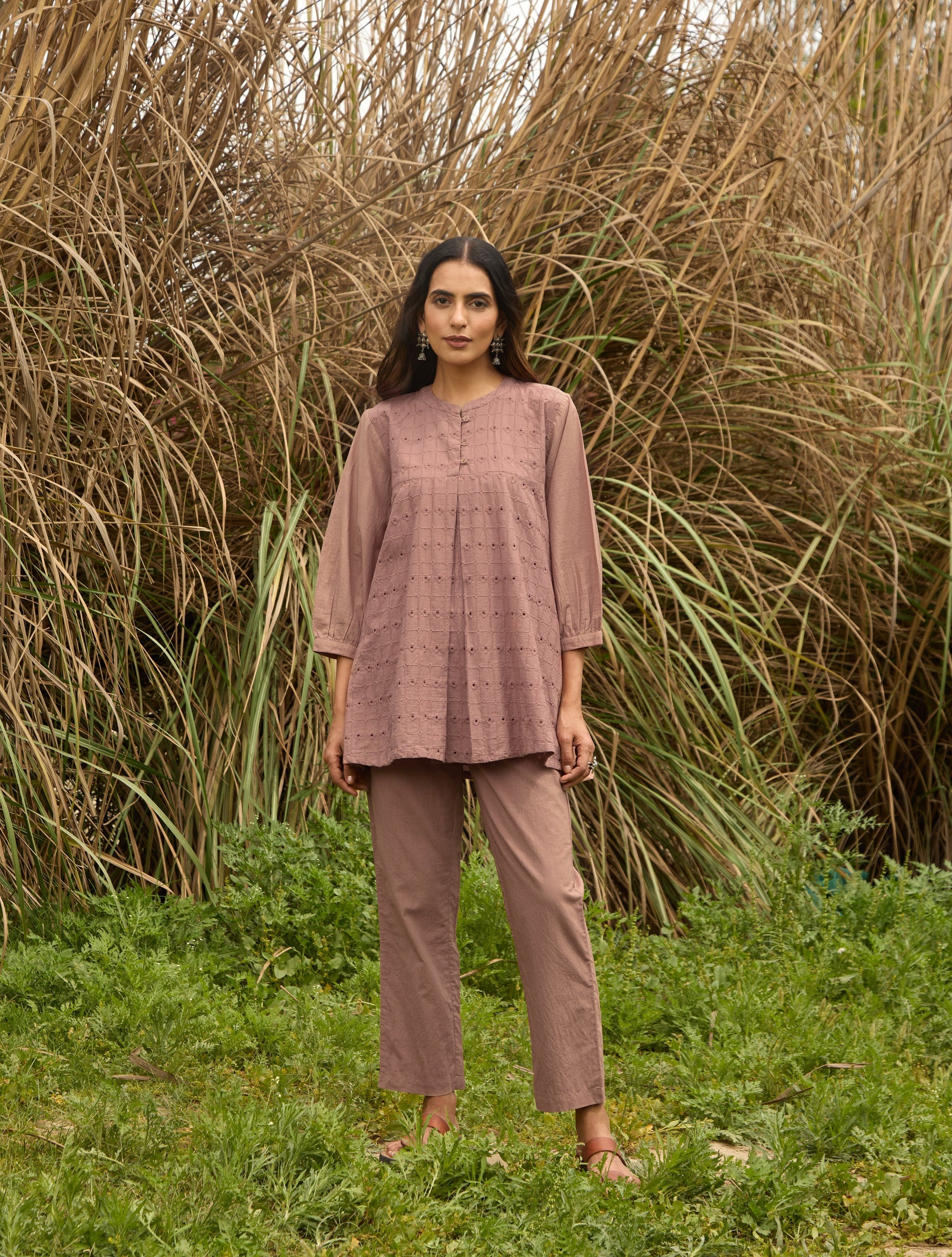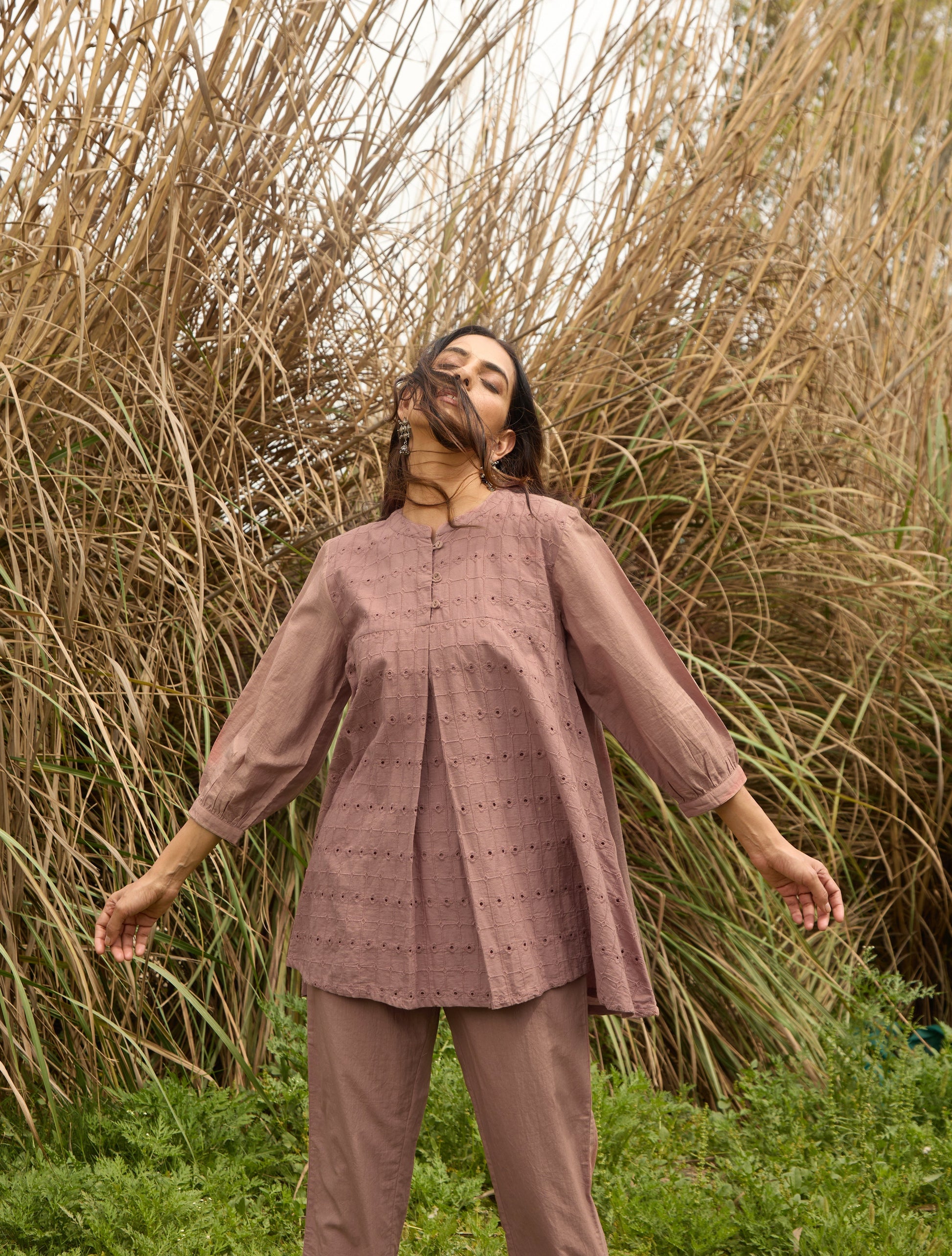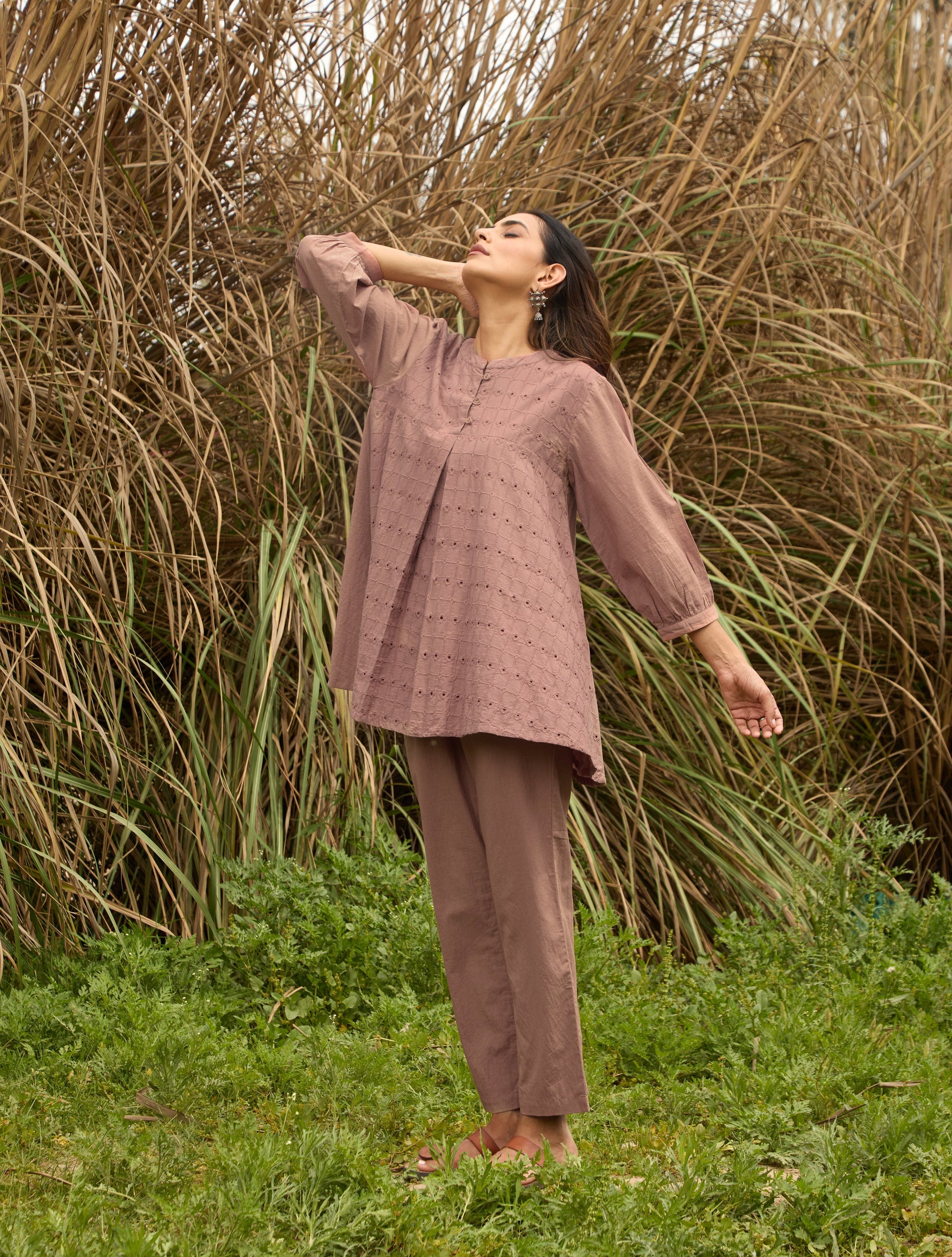 - Cotton cutwork embroidered co-ord set with front pleat yoke, gathered sleeve and cuff. Paired with elasticated waist pant.