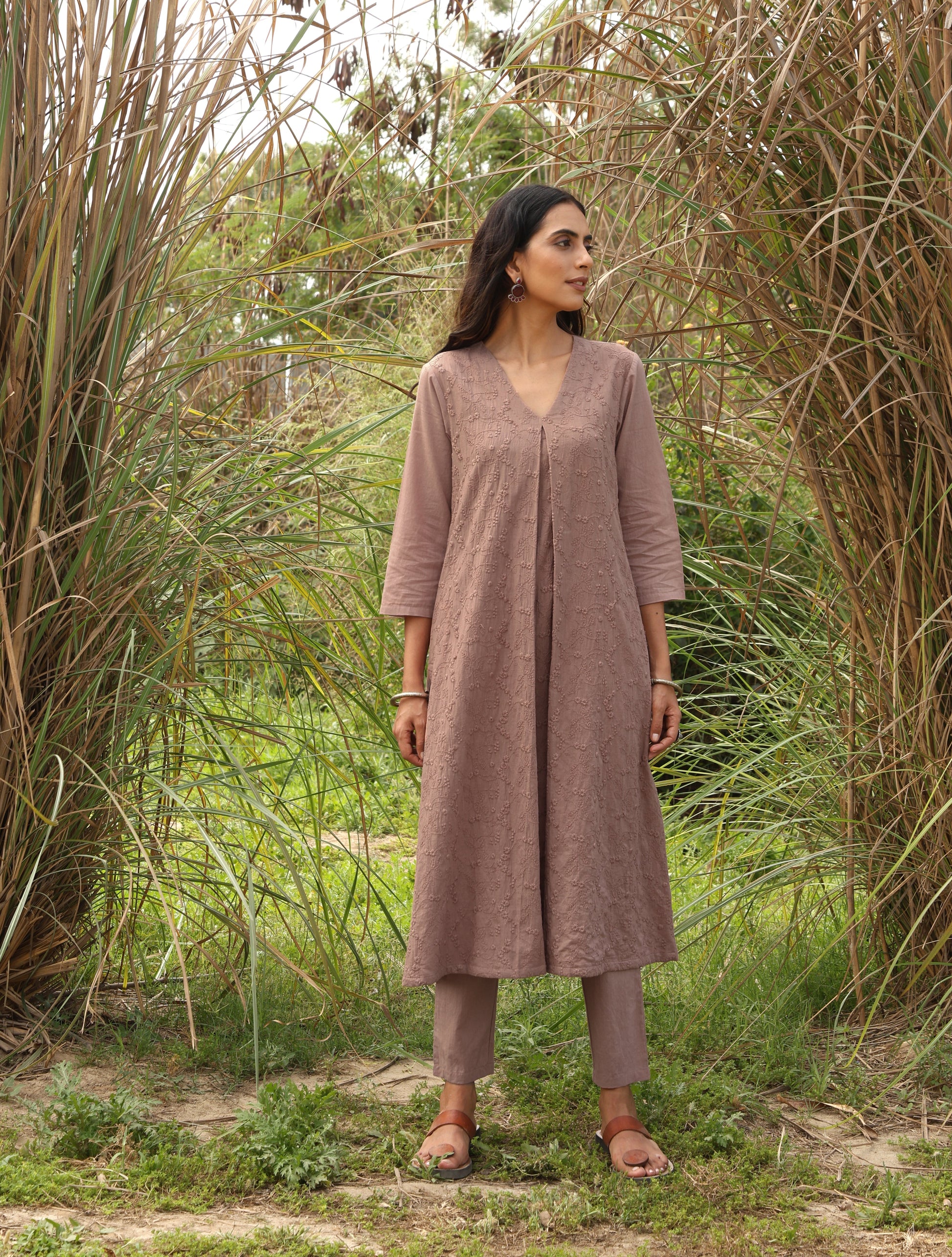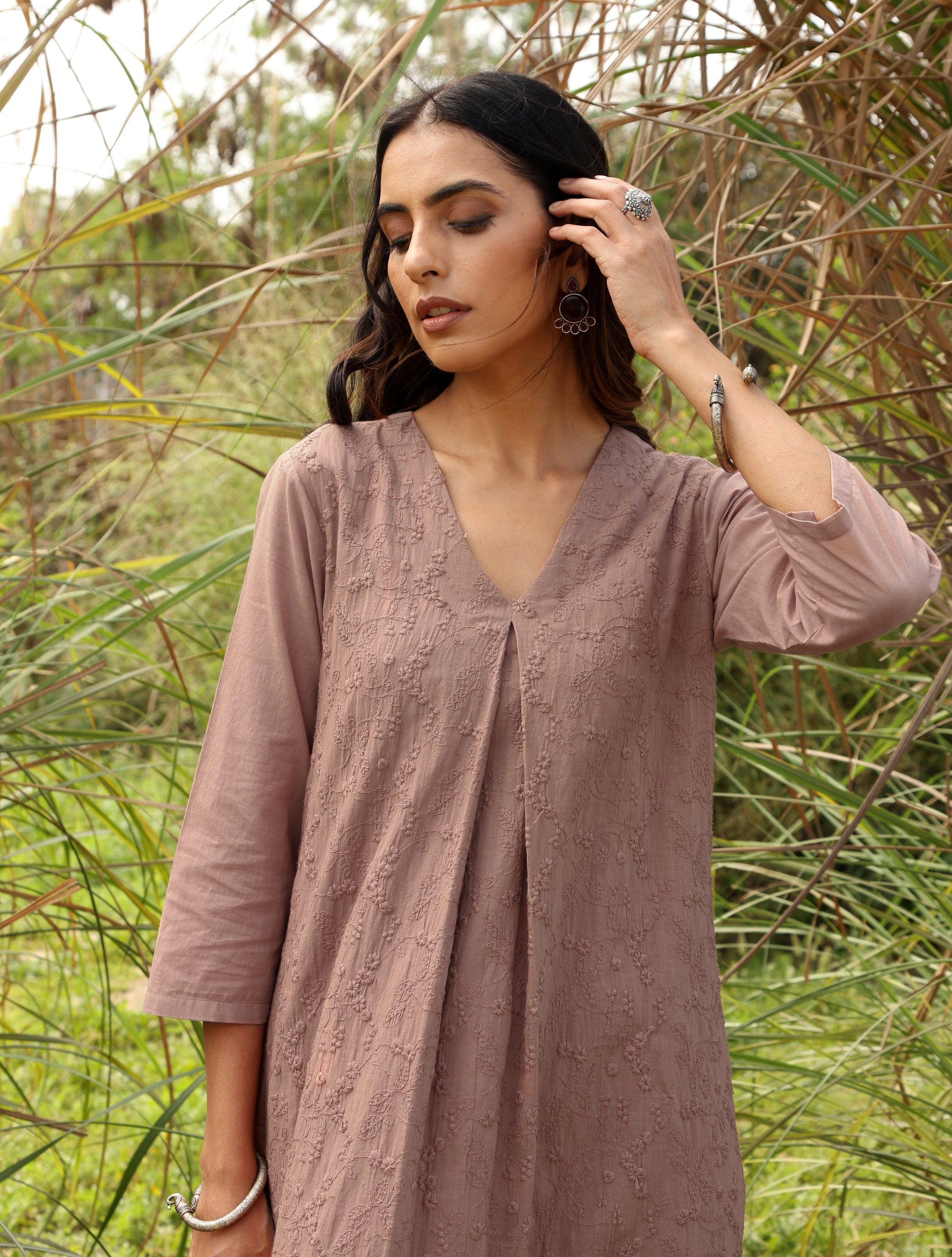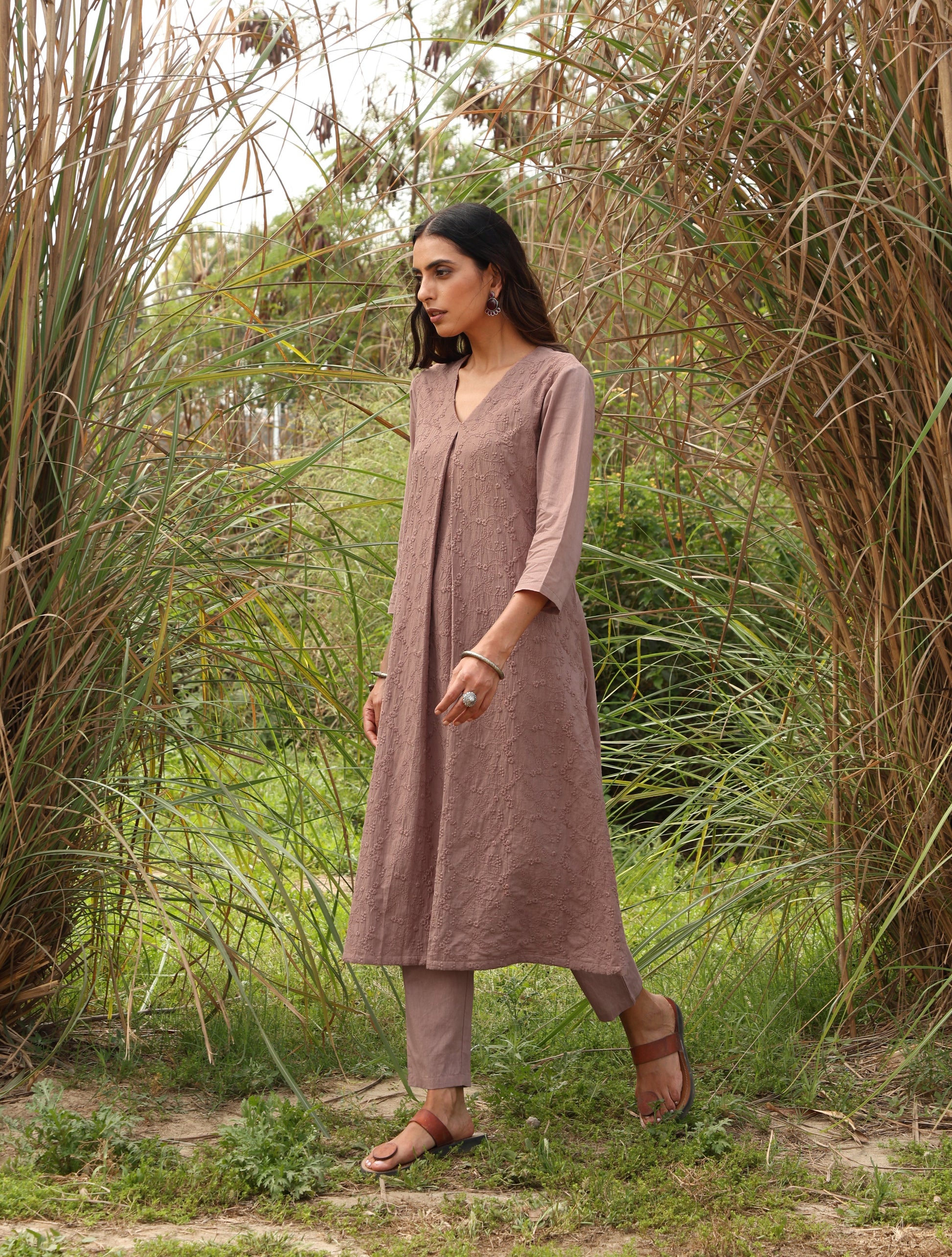 trueBrowns Pink Cotton Embroidered Kurta Set