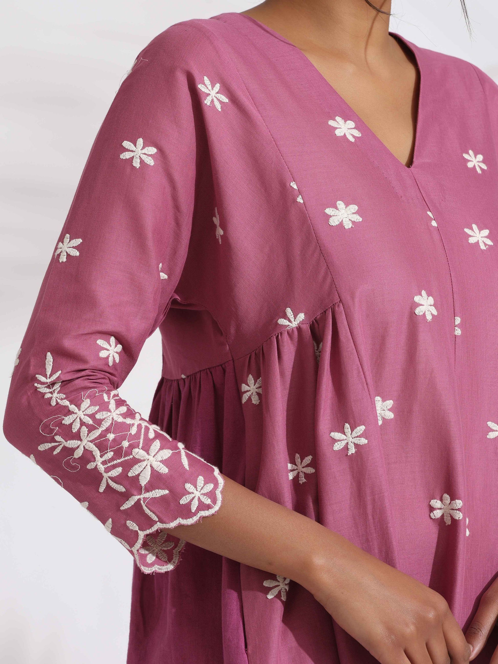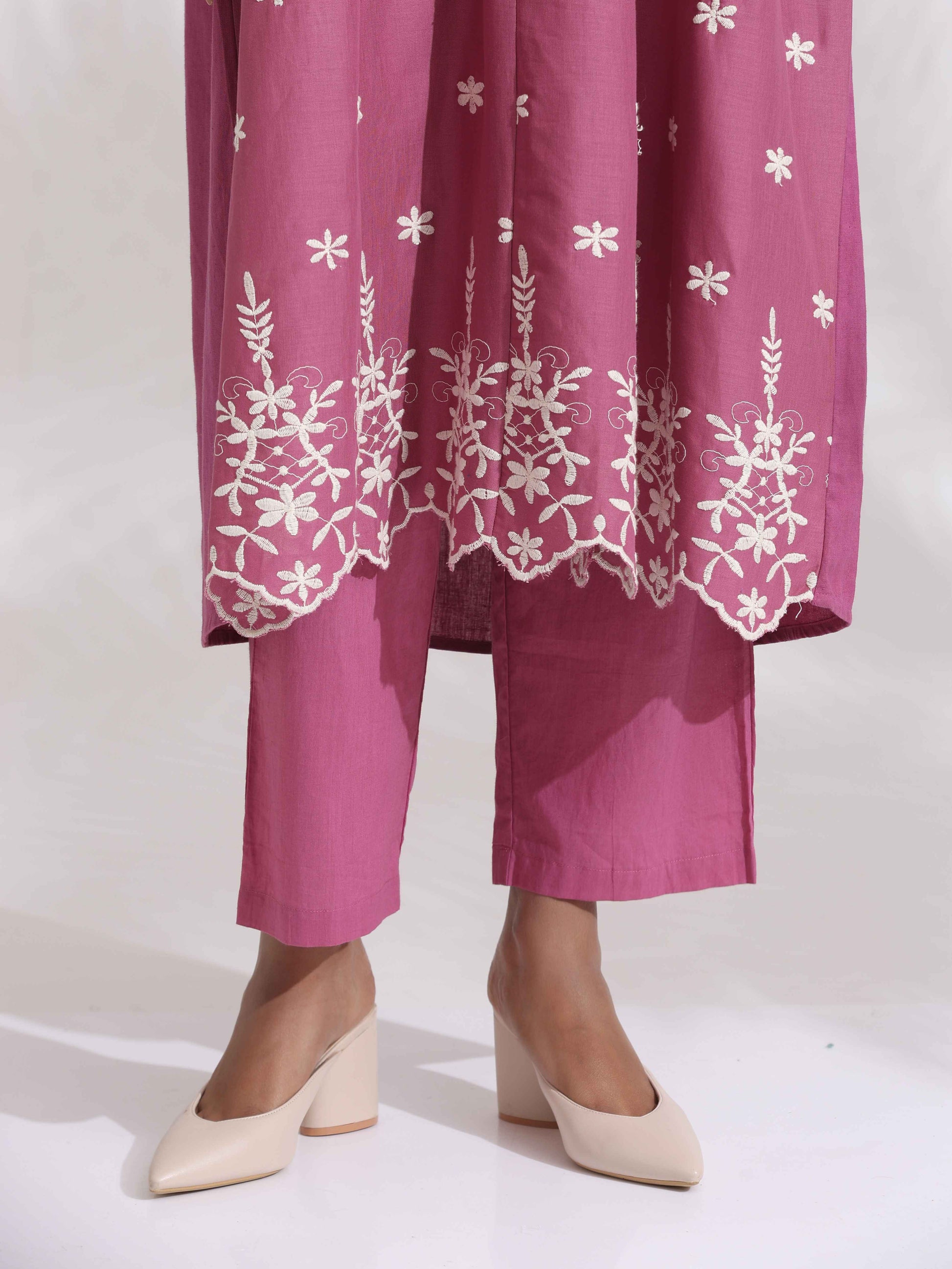 trueBrowns Pink Cotton Floral Embroidered Flared Kurta Set