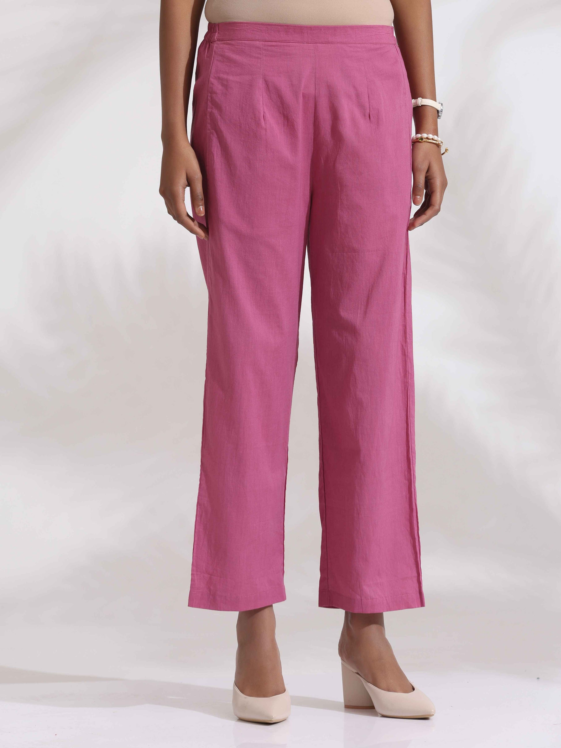 - Elevate your style with this pink cotton floral embroidered flared kurta complemented by solid back along with paneling and light gathers at sides for added flare, paired perfectly with solid cotton flex pants.