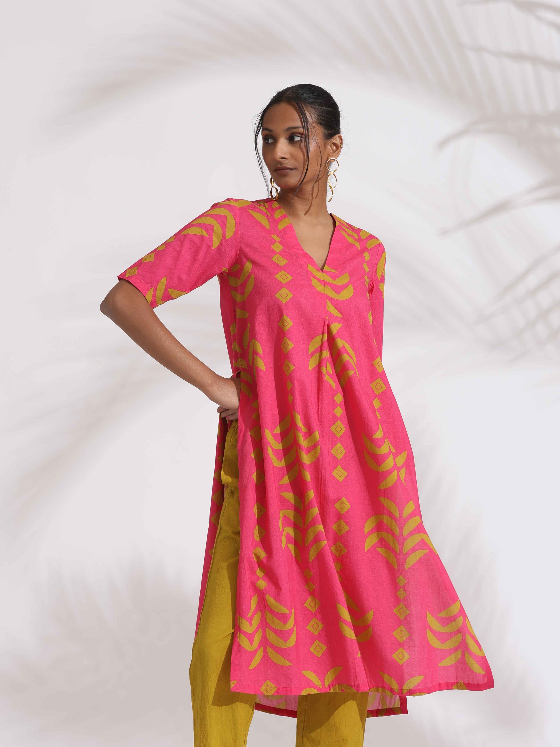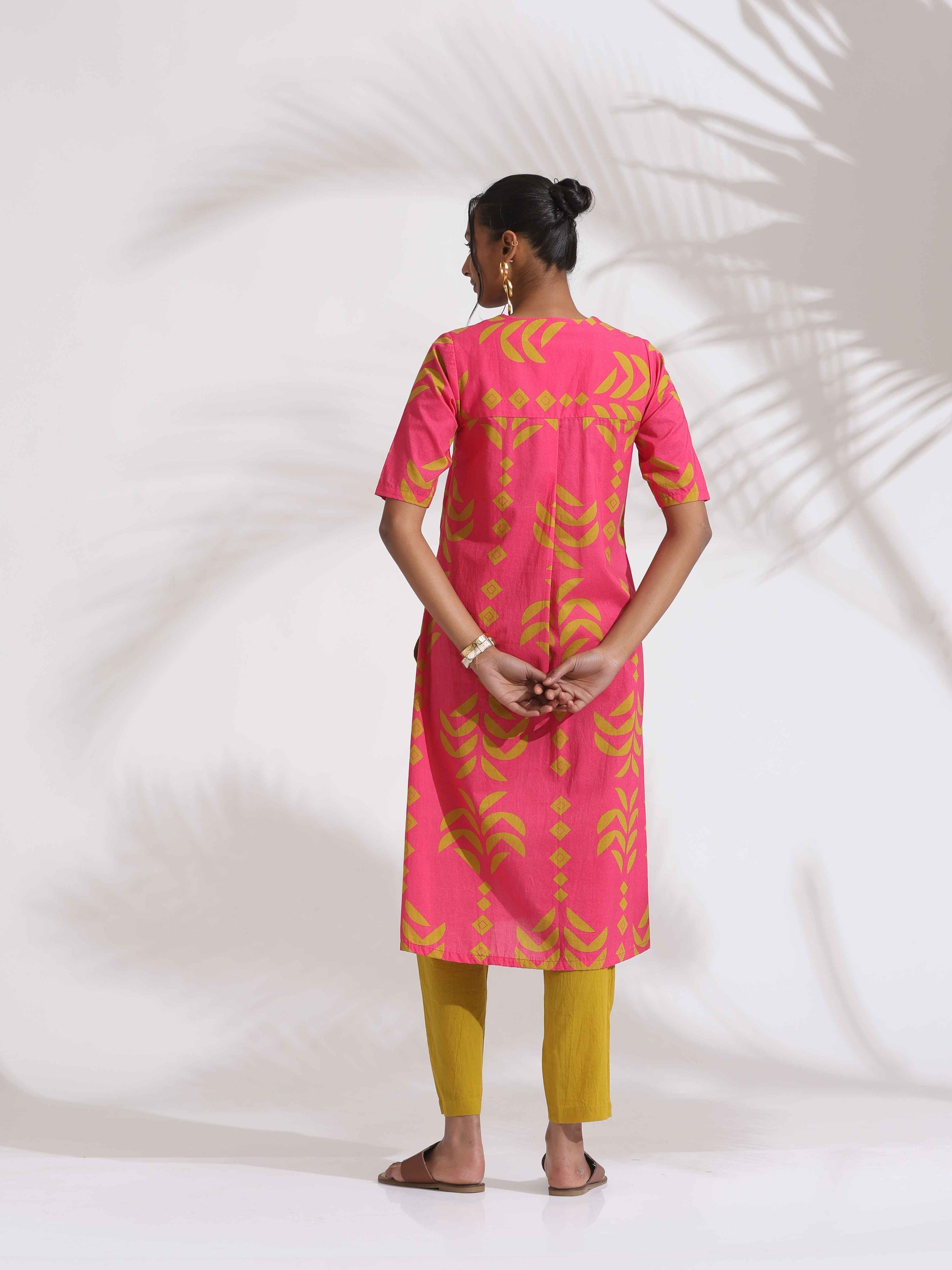 - Elevate your style game with this pink cotton printed A-line kurta paired with green cotton pants. This ensemble seamlessly blends comfort with elegance, making it a versatile choice for casual outings, festive occasions, or relaxed workdays
