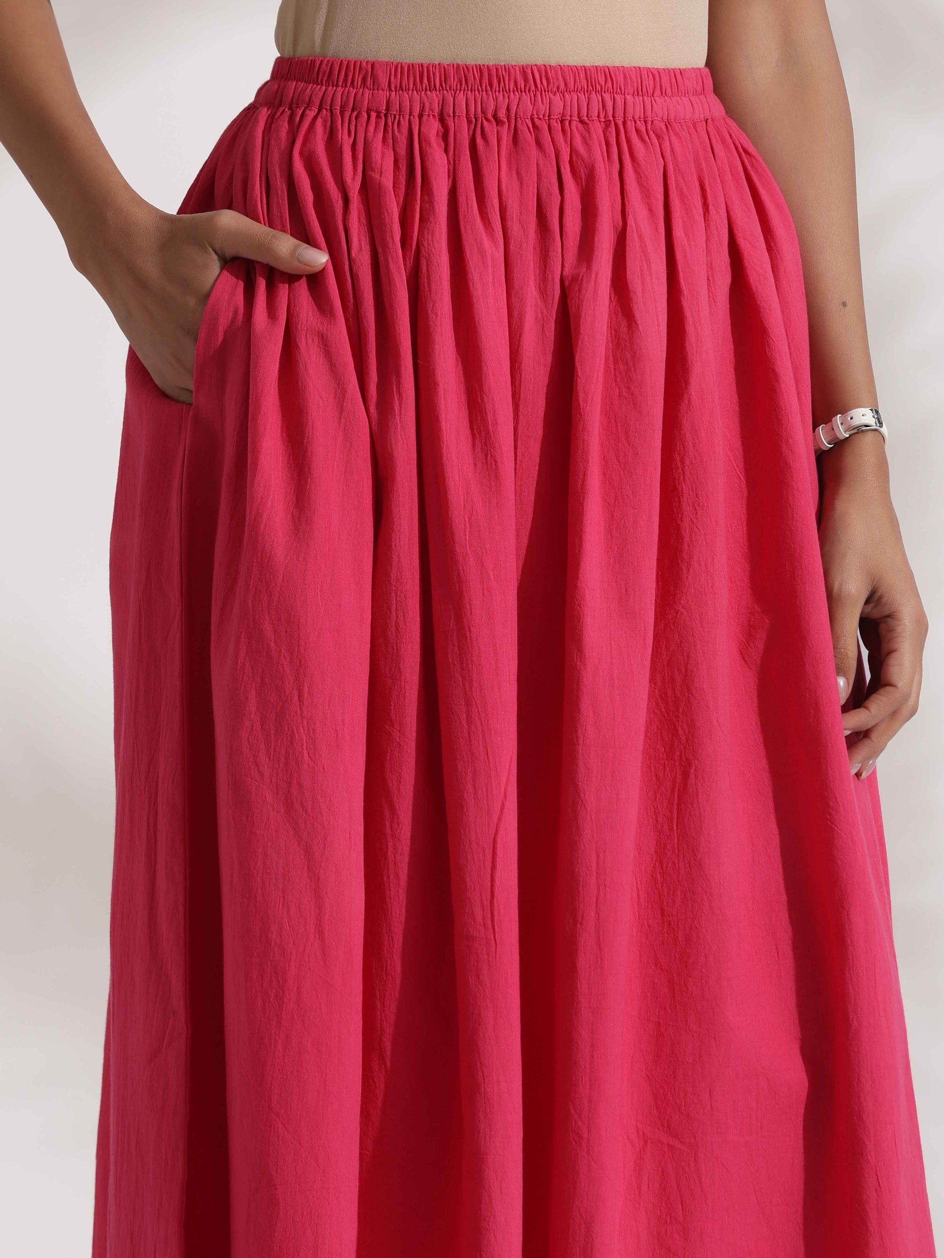 - Elevate your style with this pink cotton printed top with pink cotton flared skirt , it's an ideal blend of elegance and comfort.