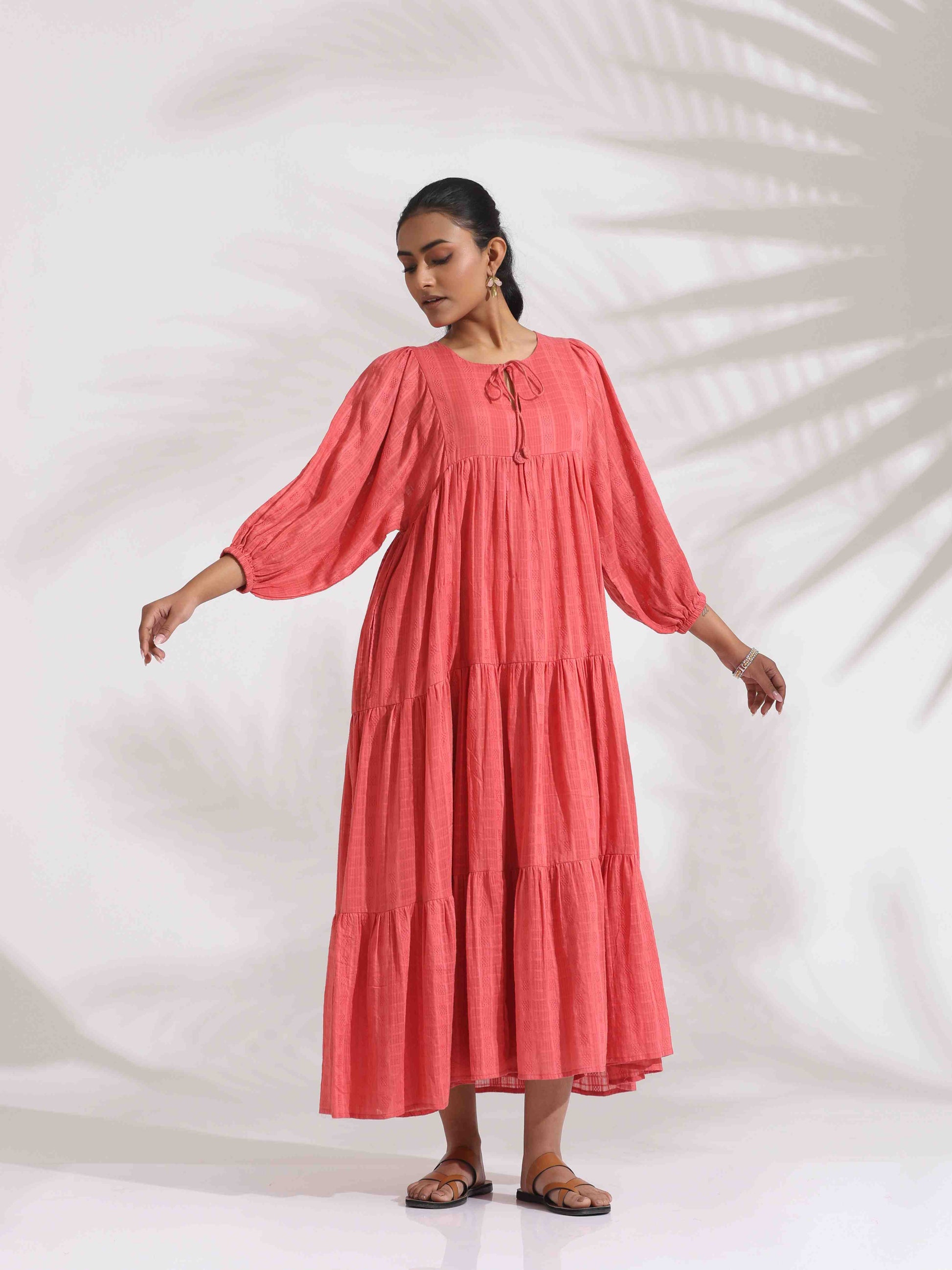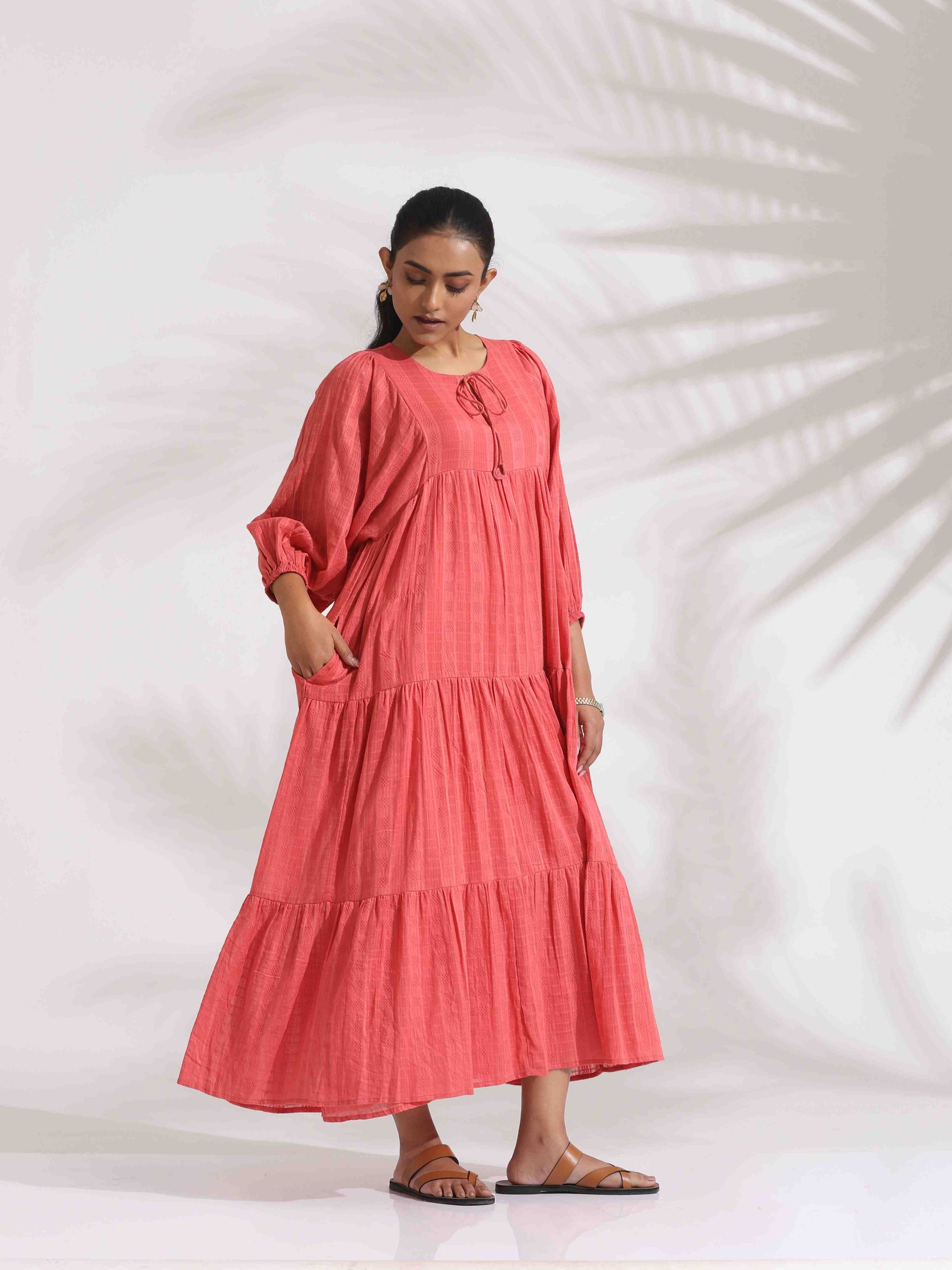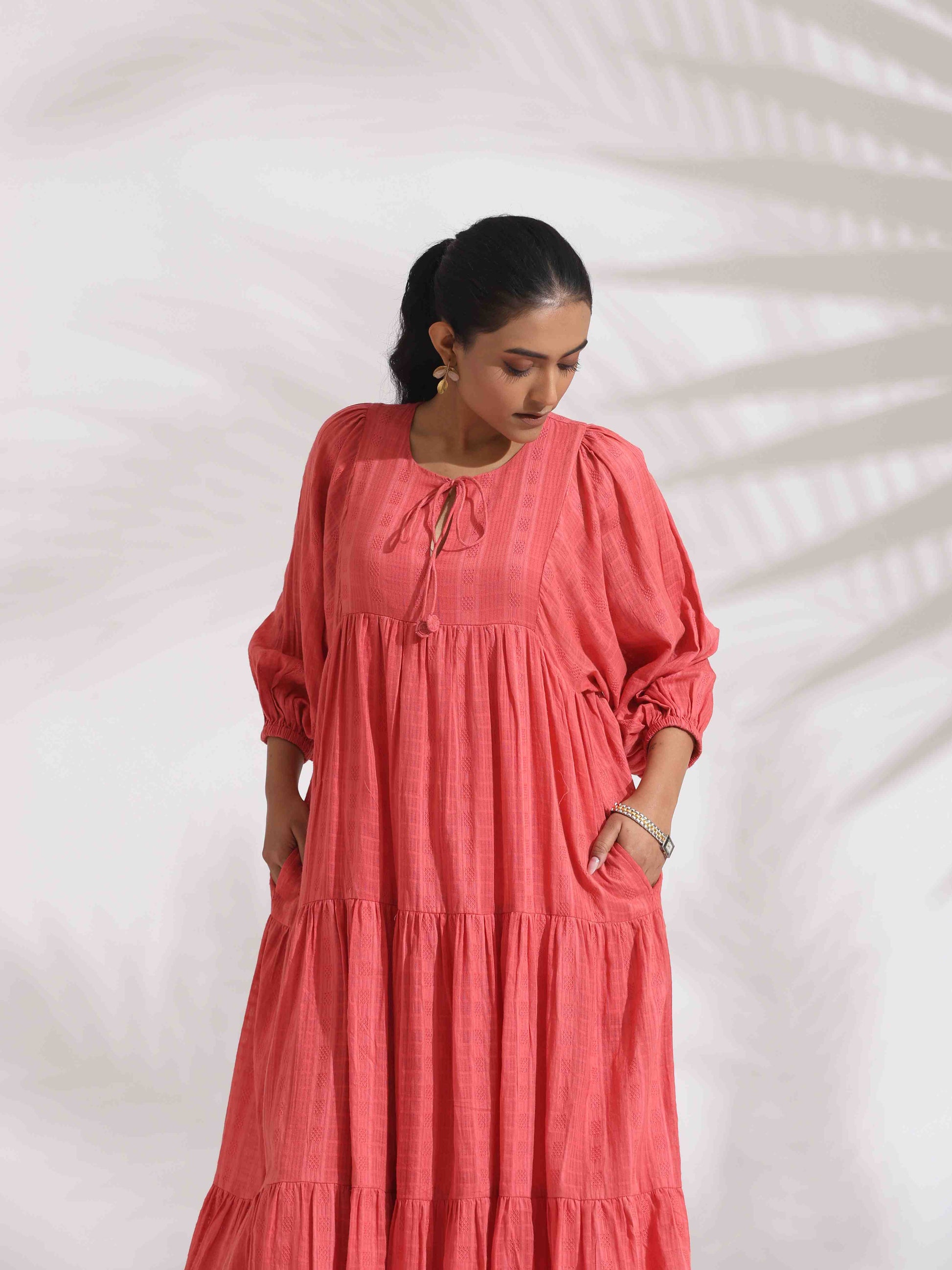 - Elevate your style with this pink cotton multi-tier dress, featuring kimono sleeves with elasticated opening.