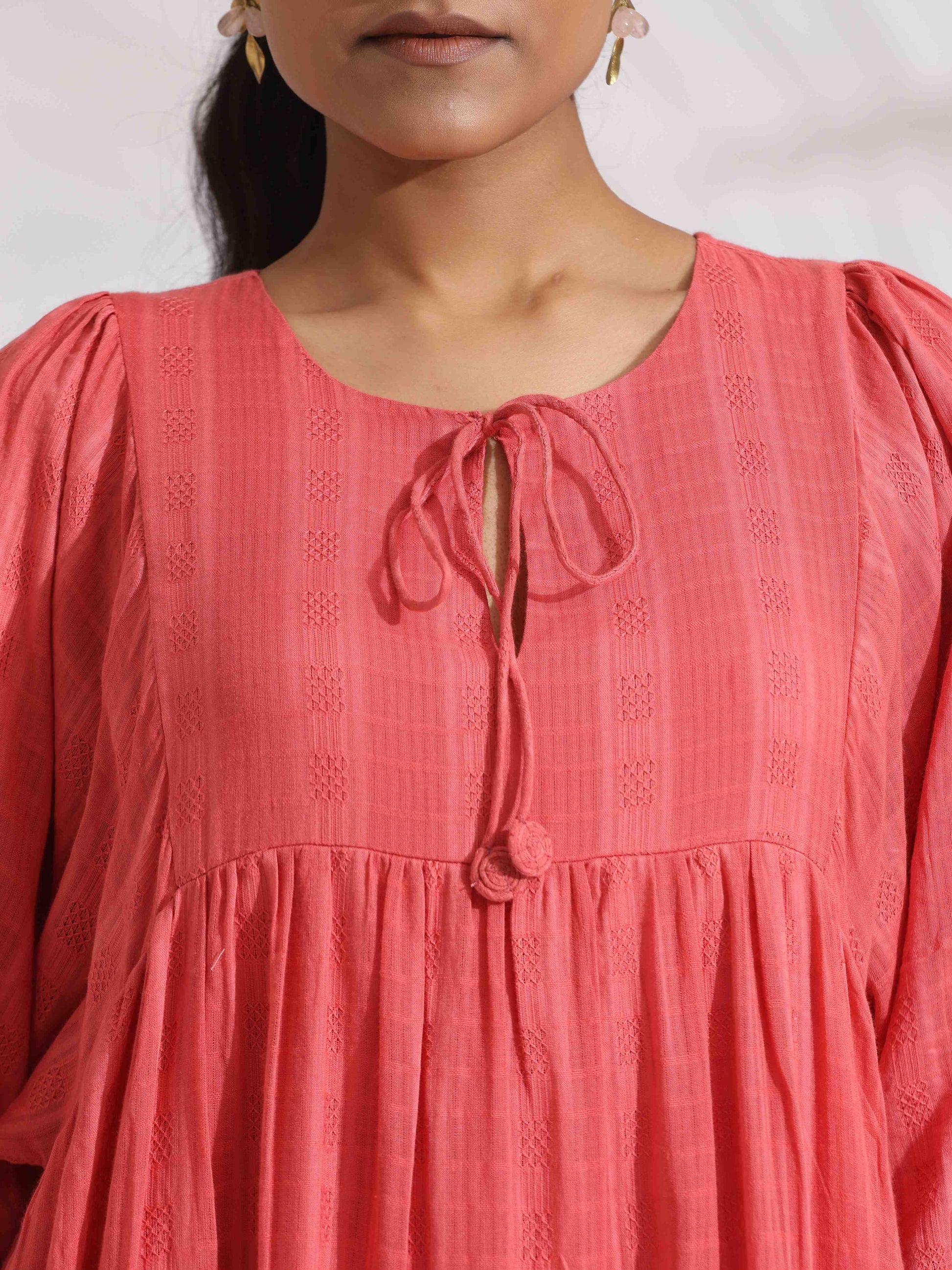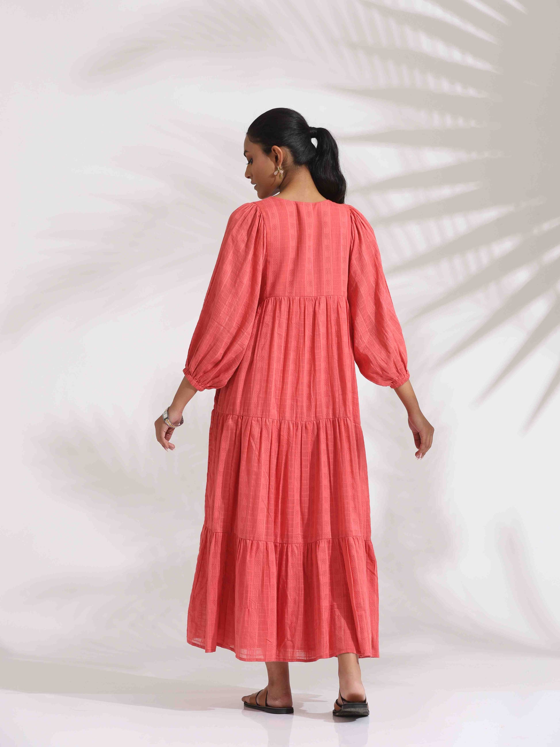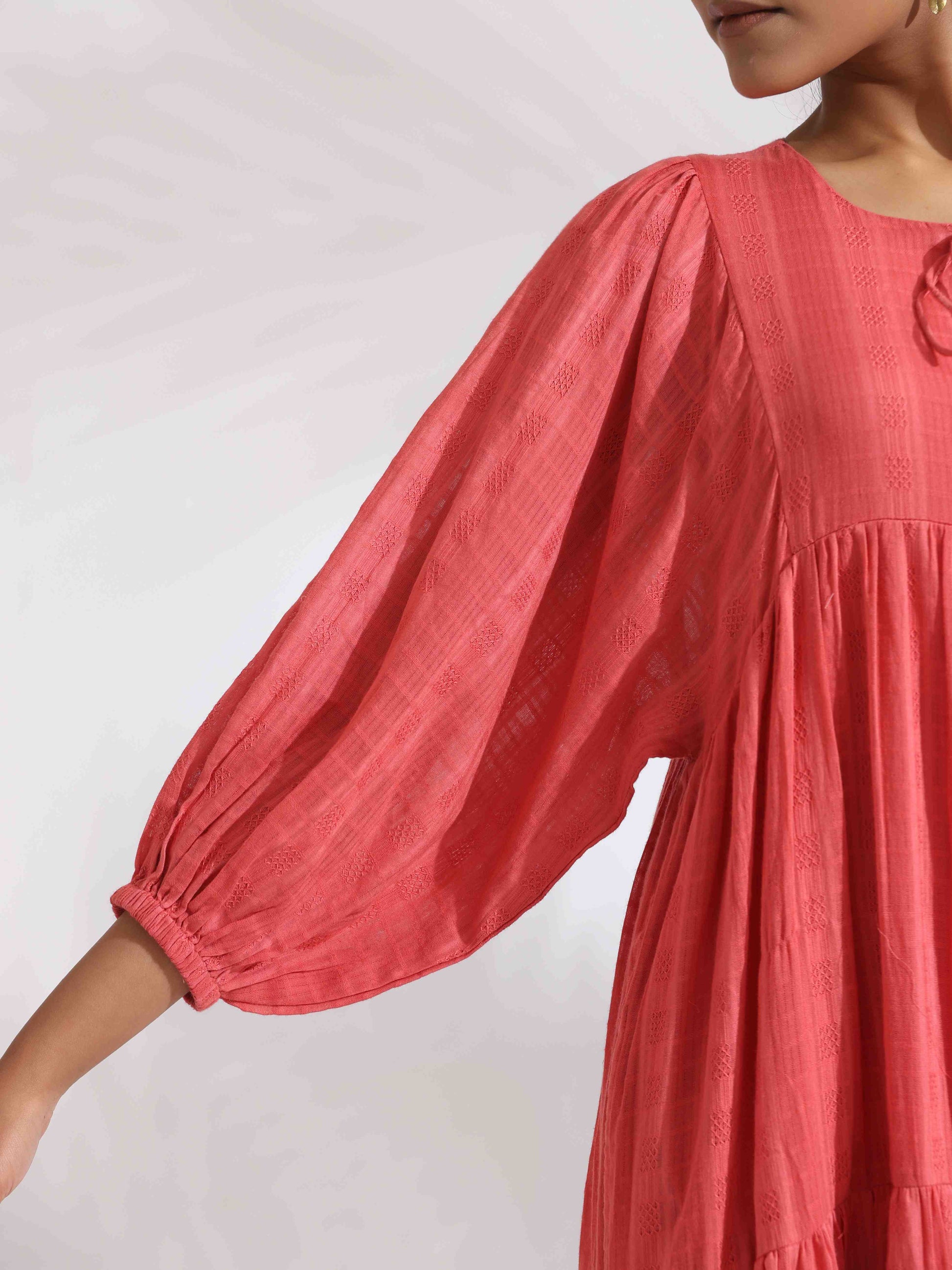 - Elevate your style with this pink cotton multi-tier dress, featuring kimono sleeves with elasticated opening.