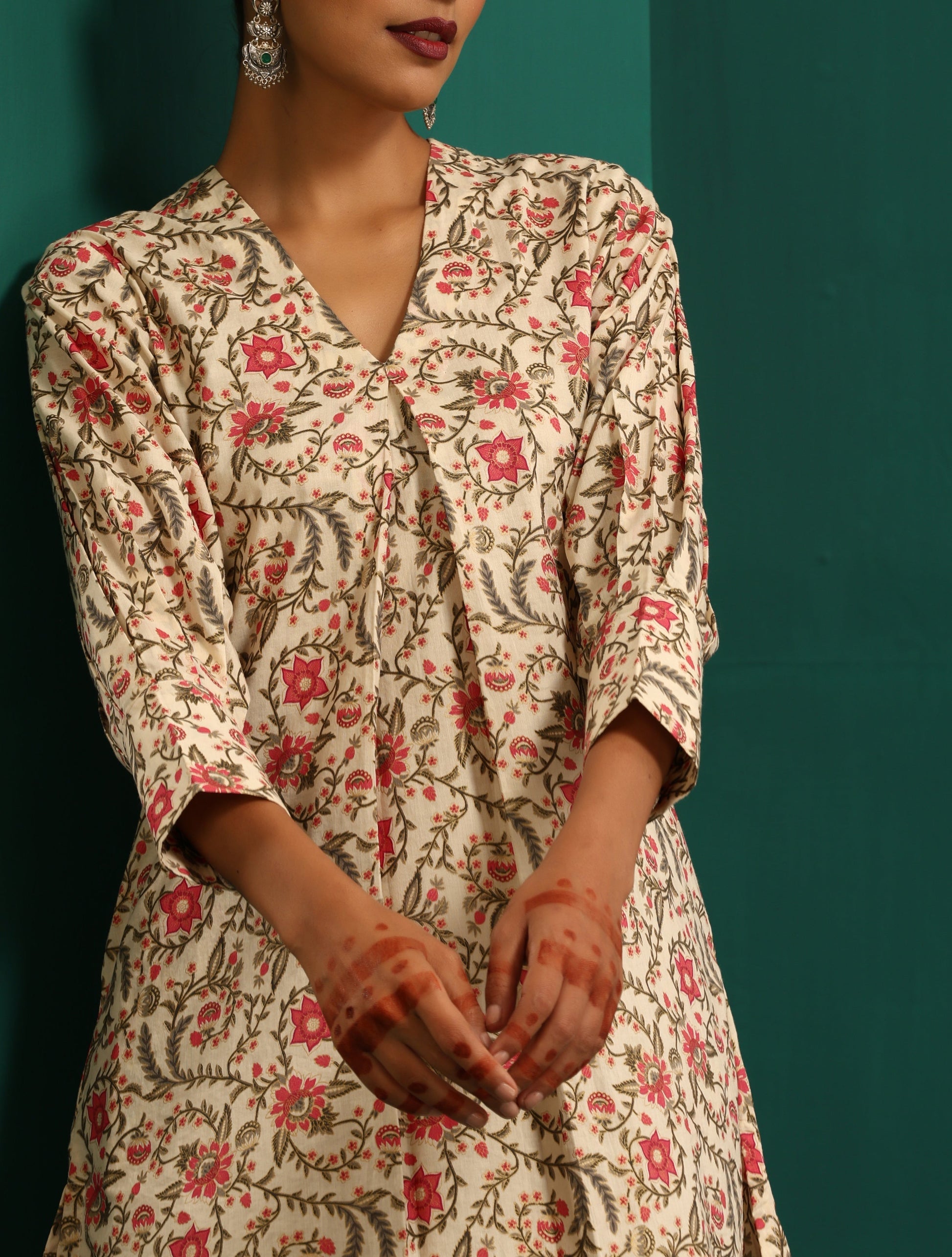 - Cotton Floral Printed Front Pleat Co-Ord Set With broad cuff on sleeves . Paired with elasticated waist pant.