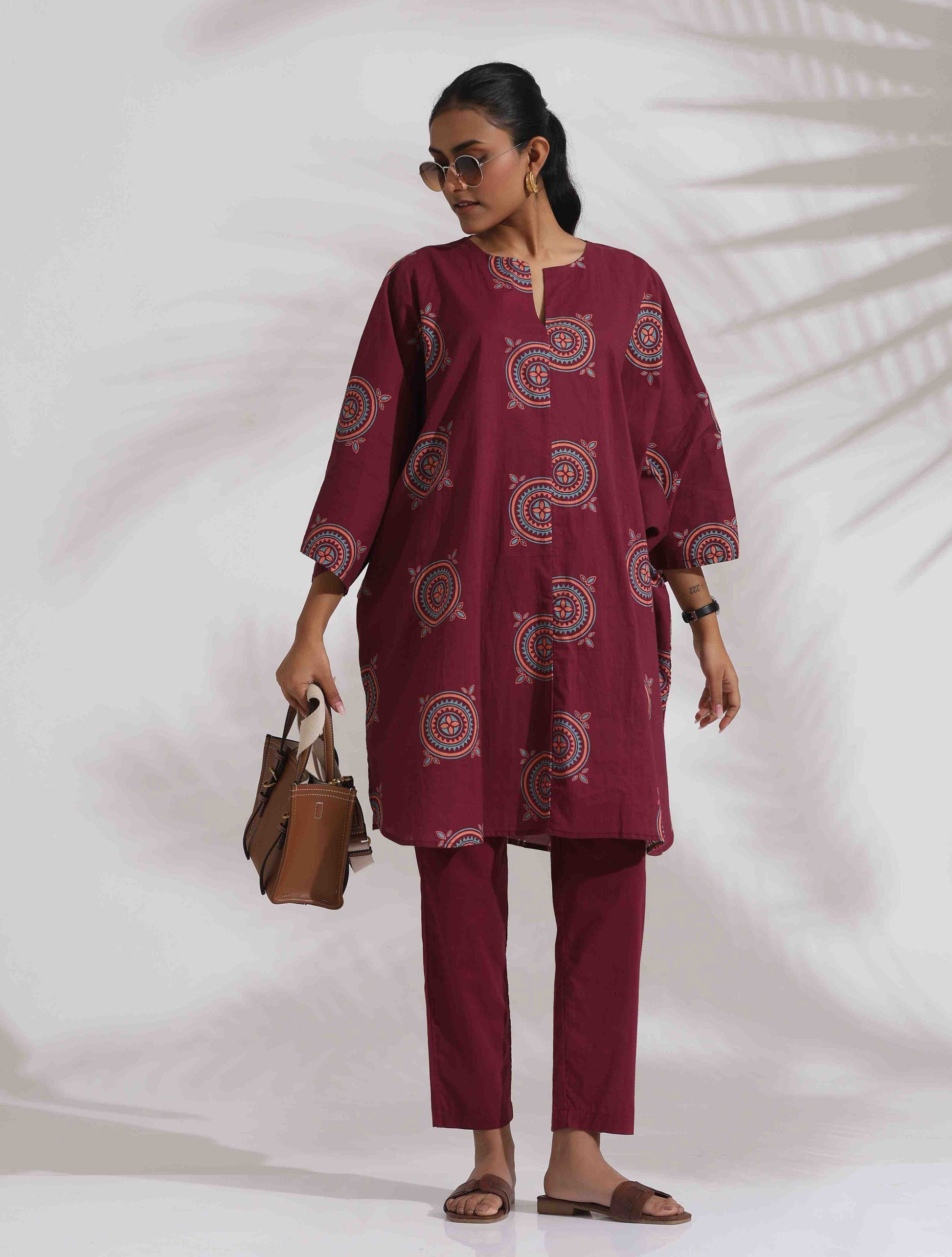- Elevate your style and Embrace this effortlessly chic look with this purple cotton print kurta co-ord set, where style meets comfort in perfect harmony. The soft, soothing shades of purple paired with the relaxed fit create an ensemble that's both sophisticated and cozy.