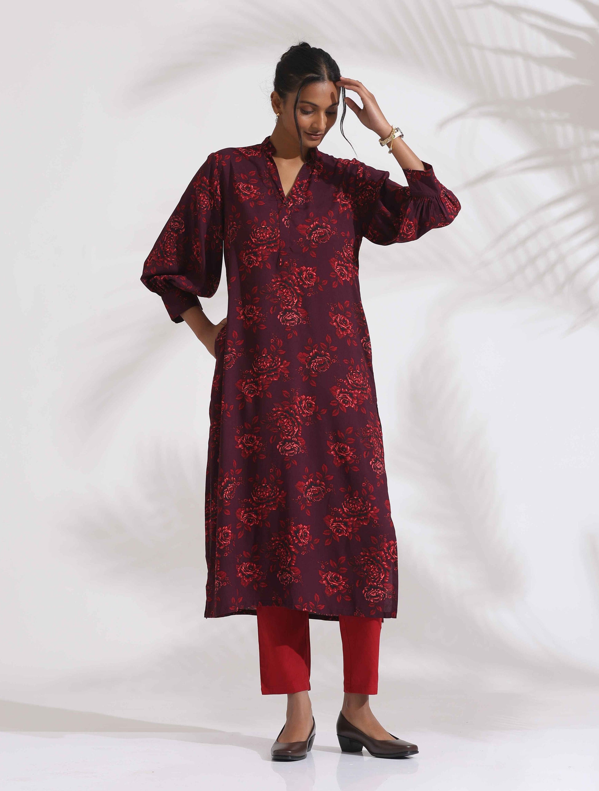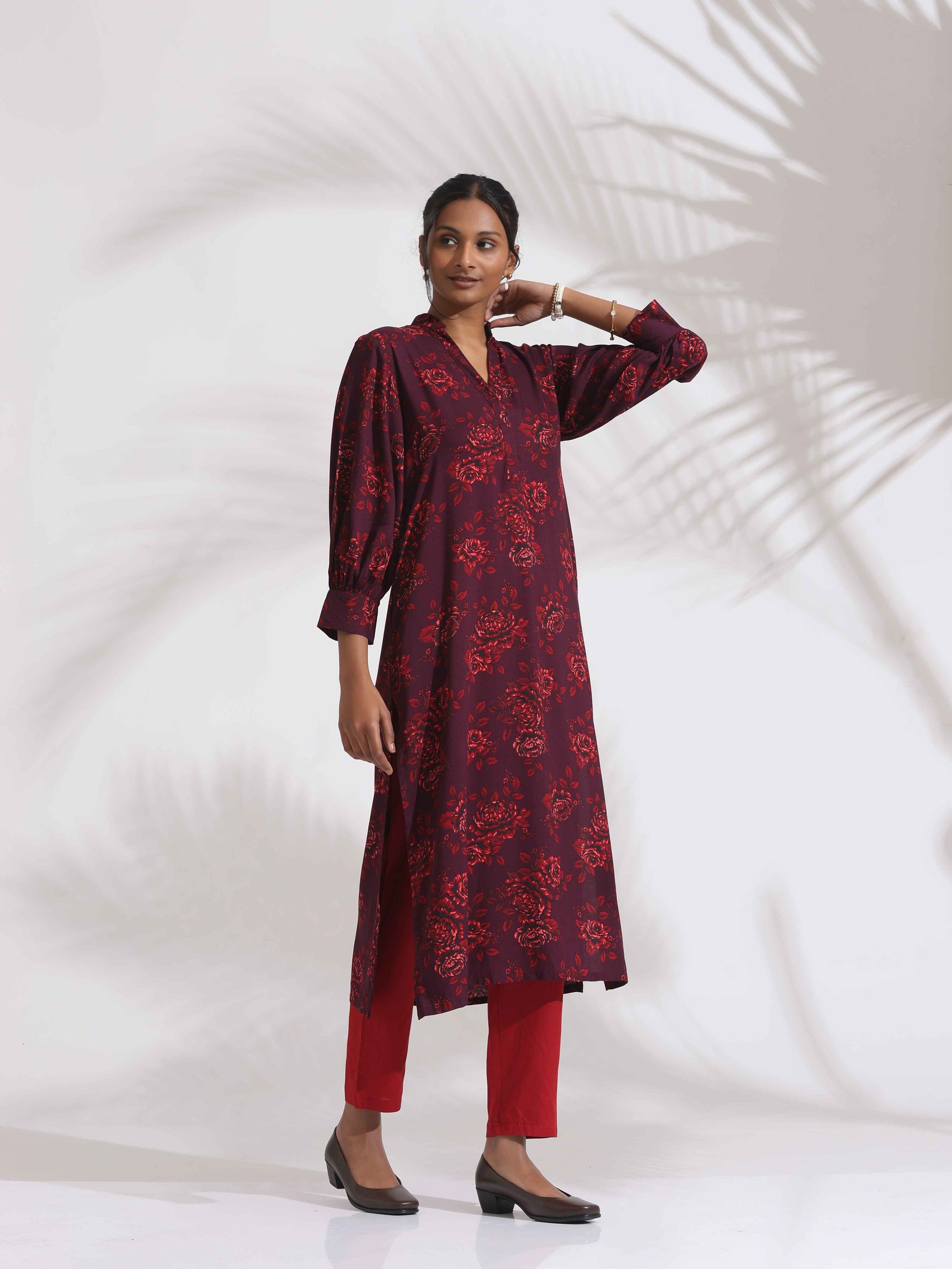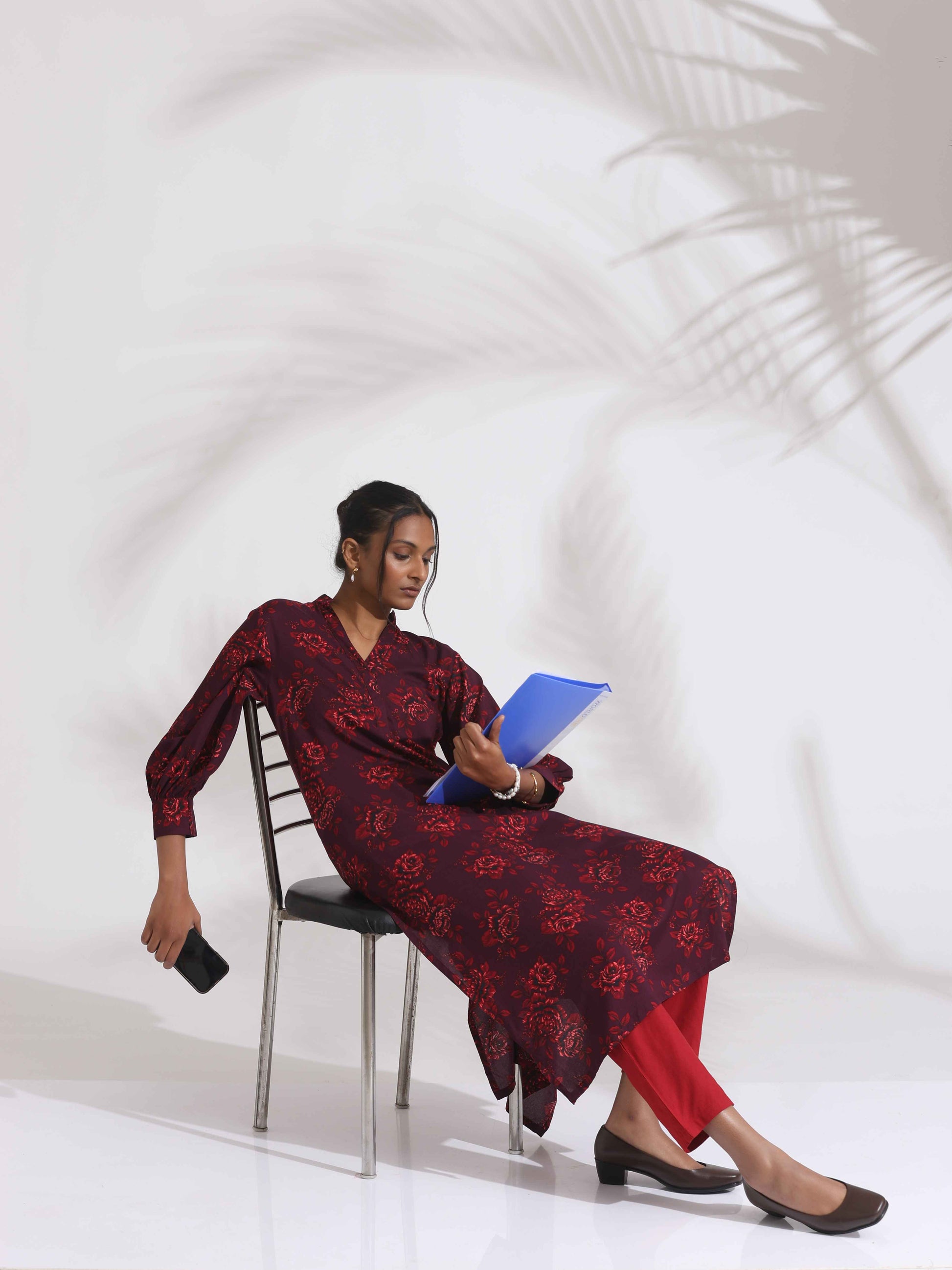 - Elevate your style with this floral printed kurta, paired with red pants, it's an ideal blend of elegance and comfort.