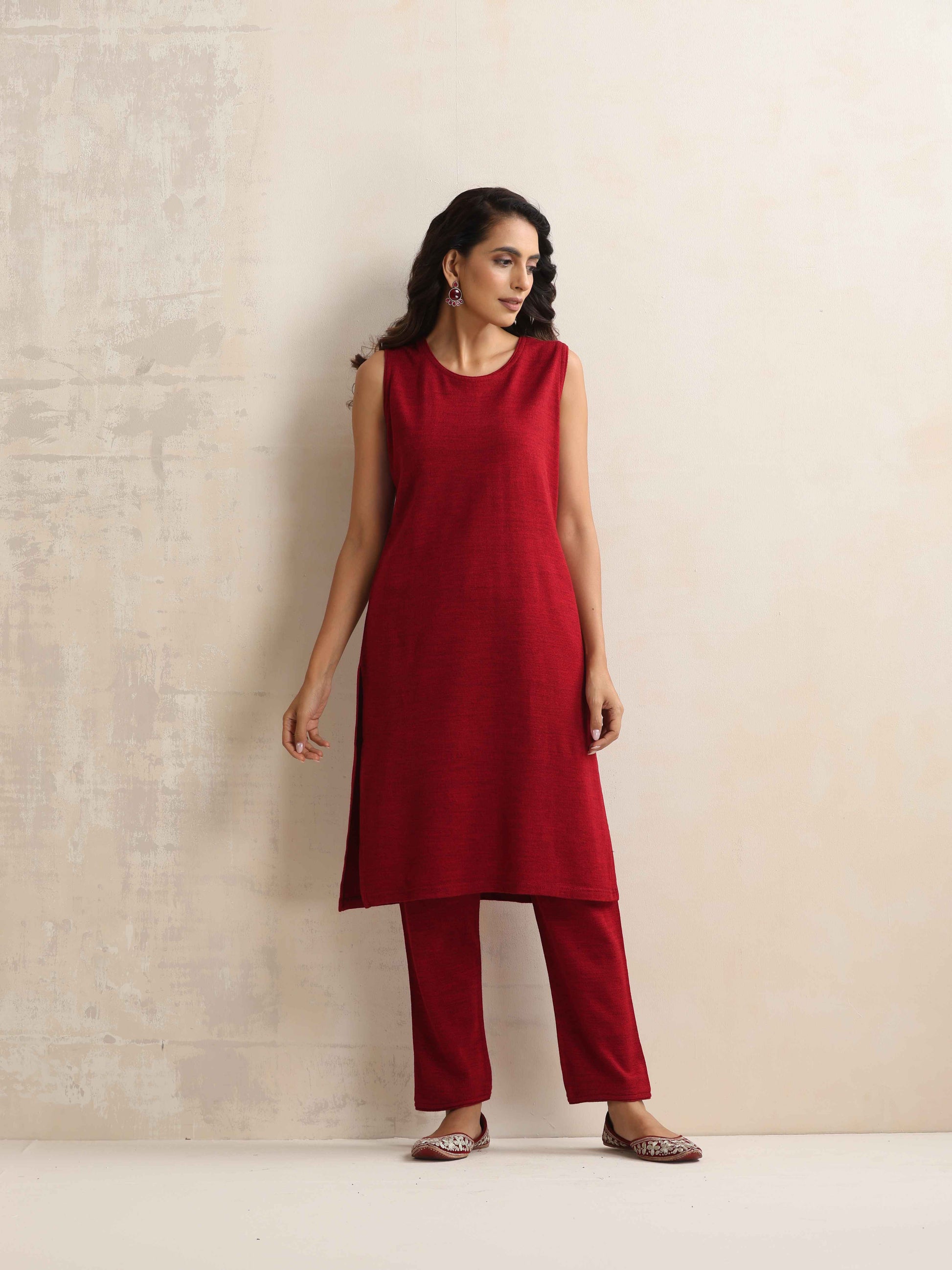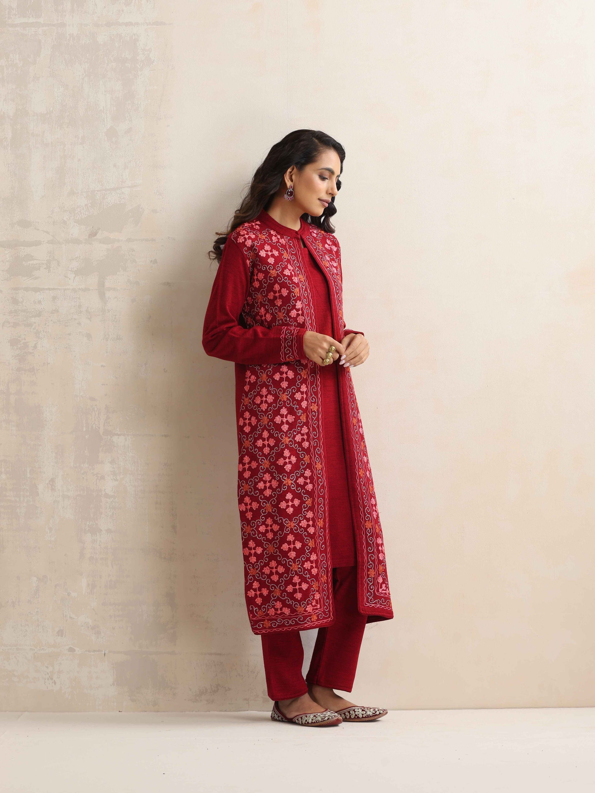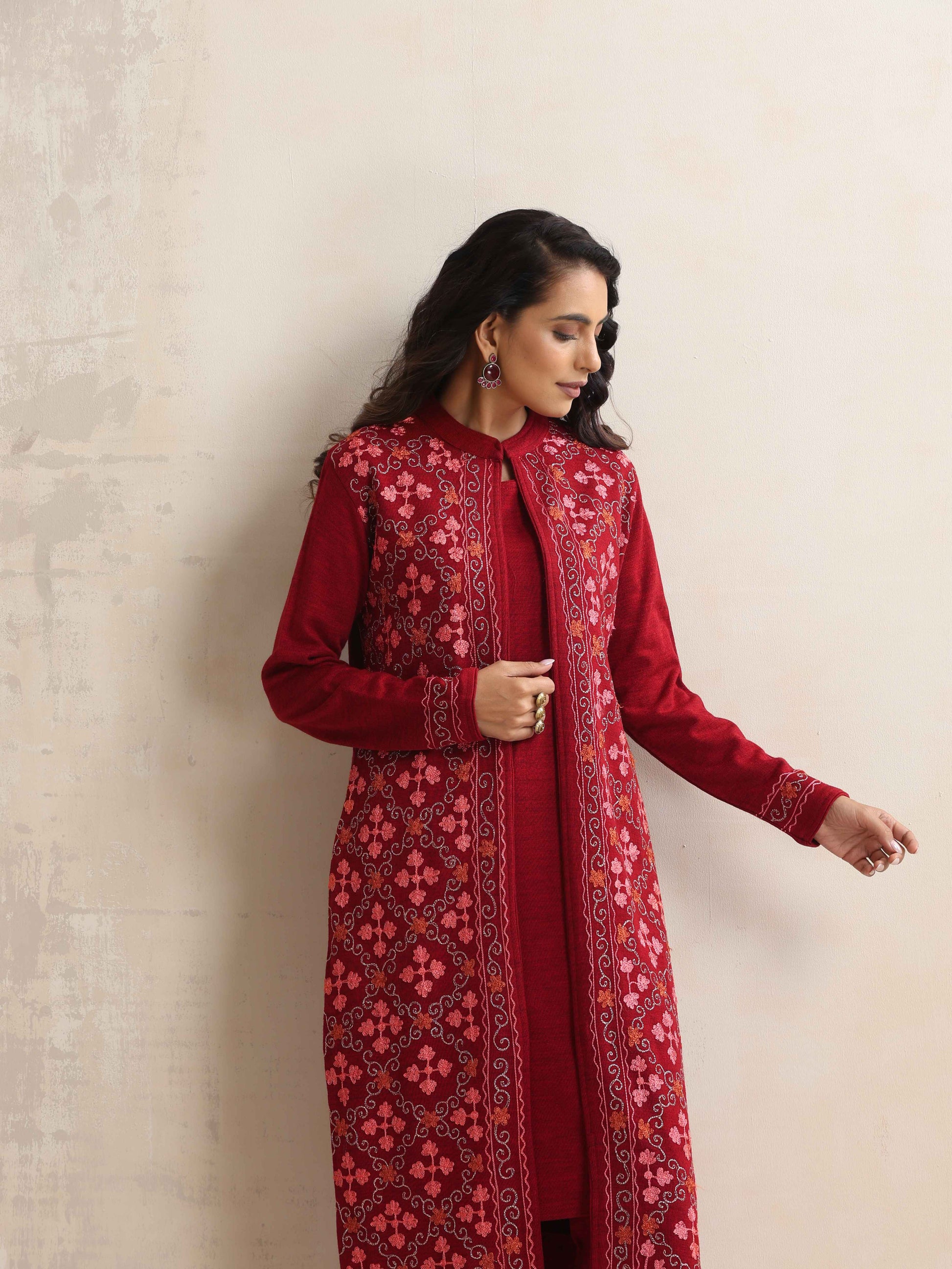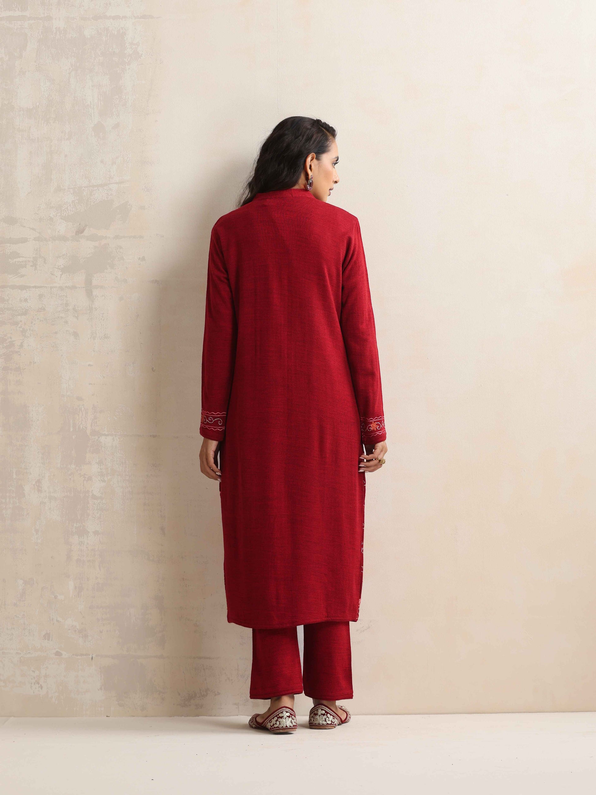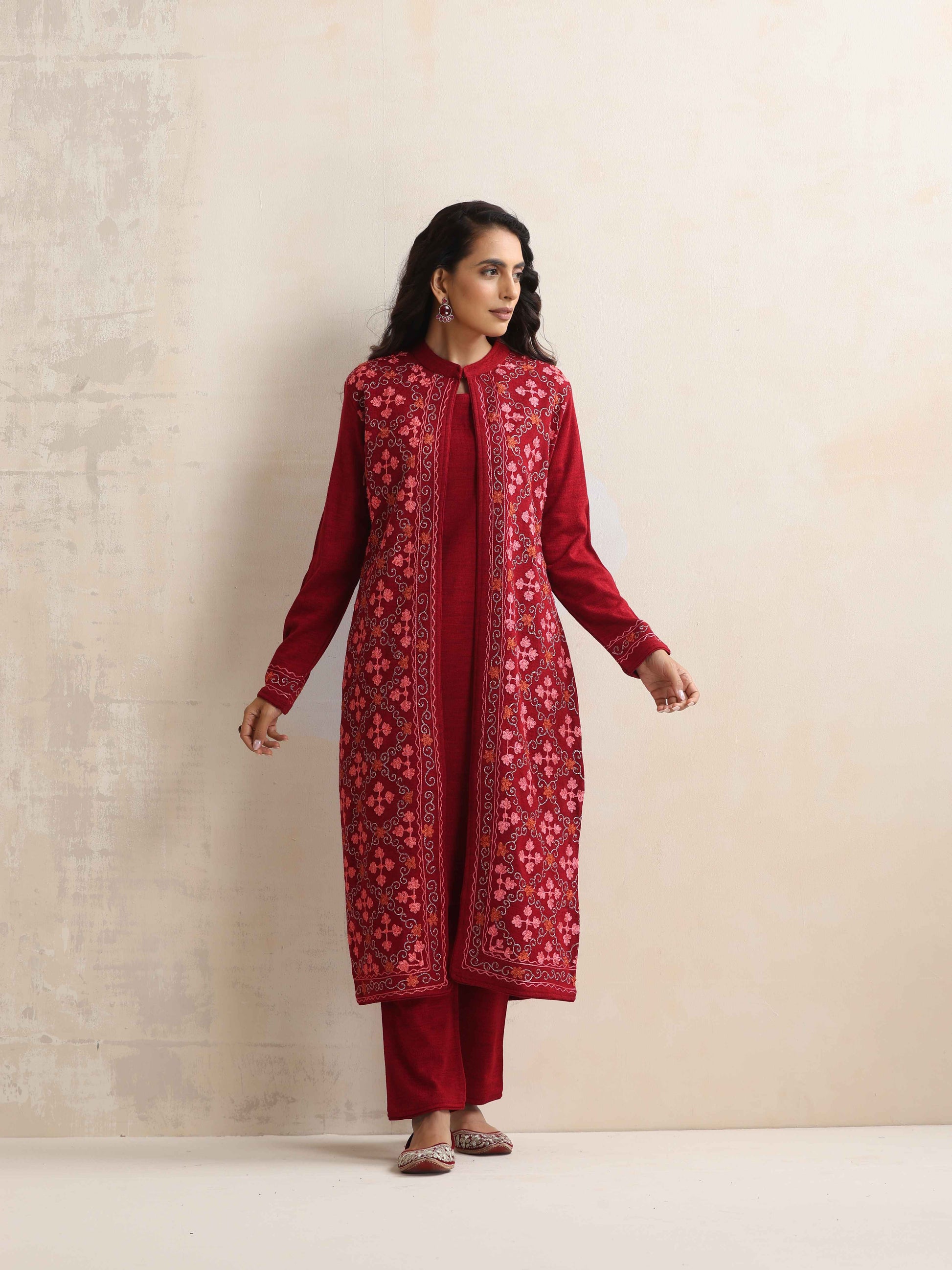 - Elevate your style with this maroon woollen jacket set, it's an ideal blend of elegance and comfort.