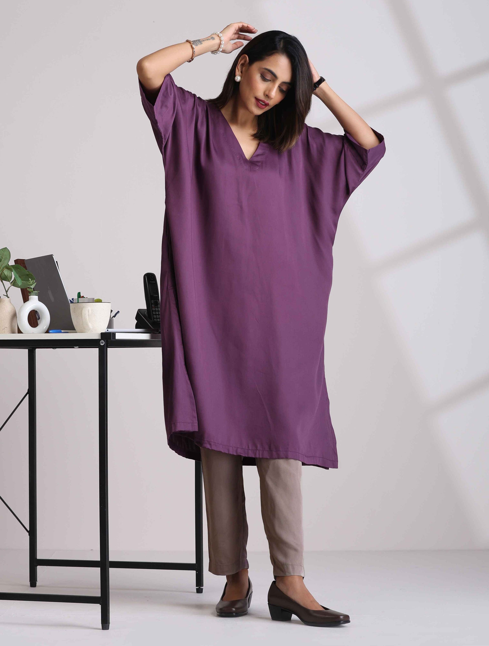 - Elevate your style with this purple modal kurta featuring kimono sleeves.