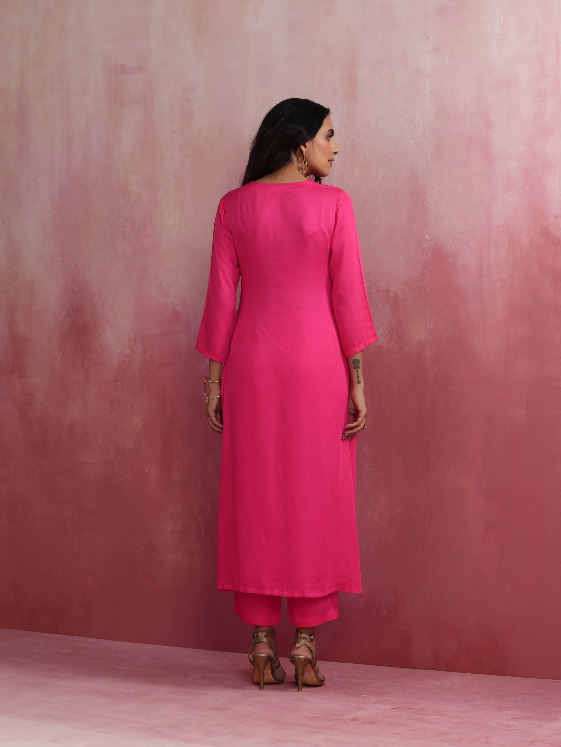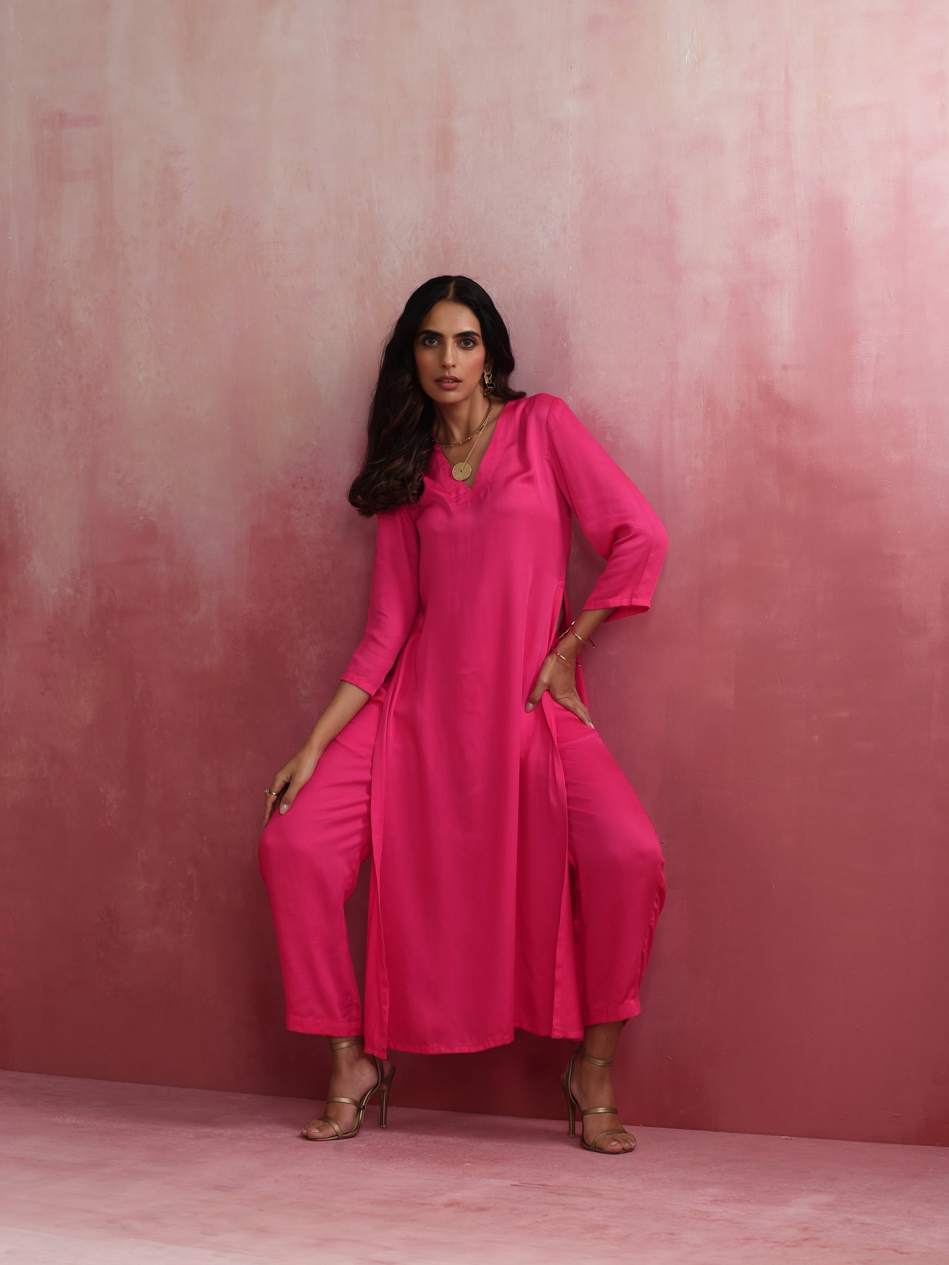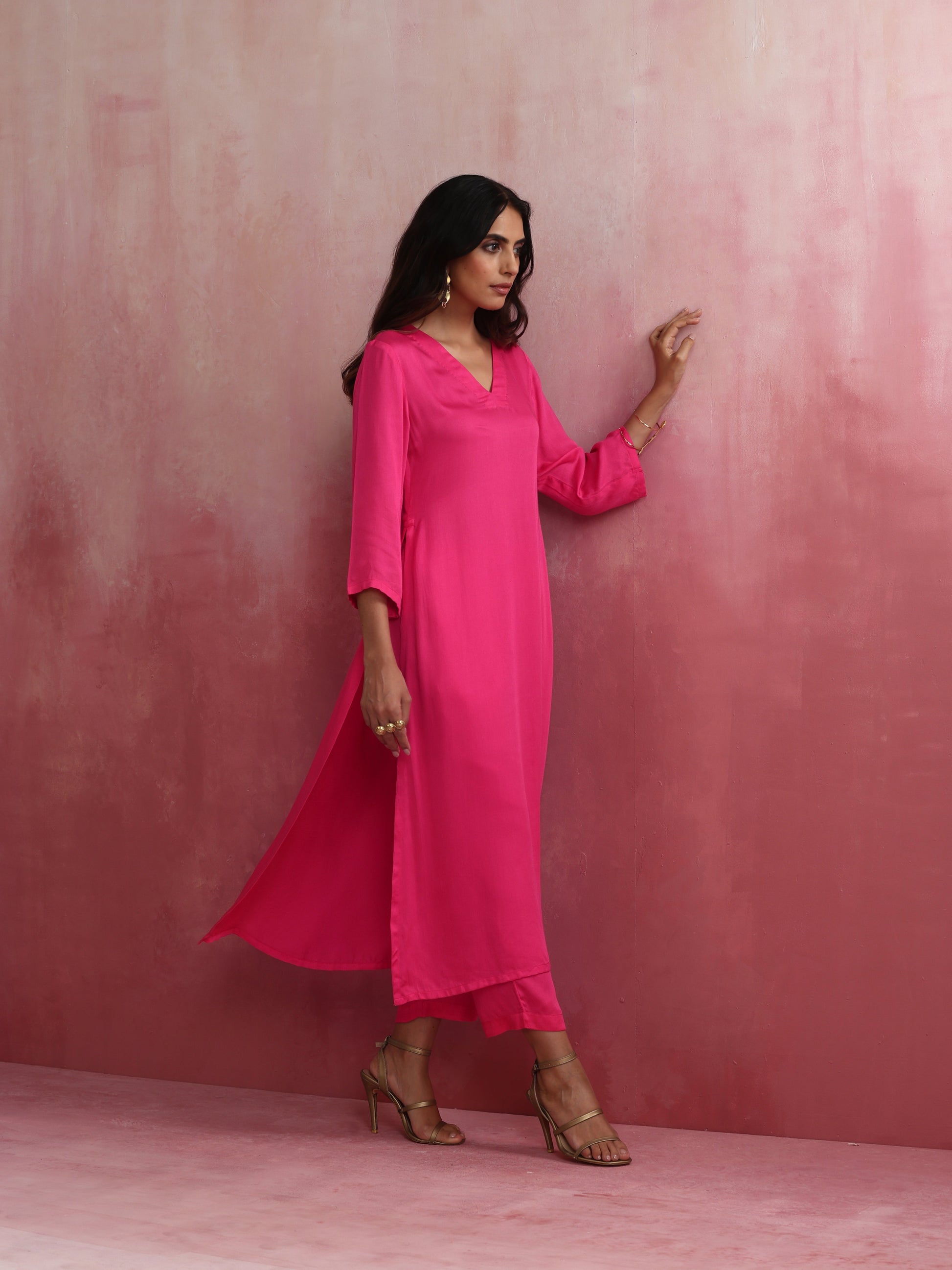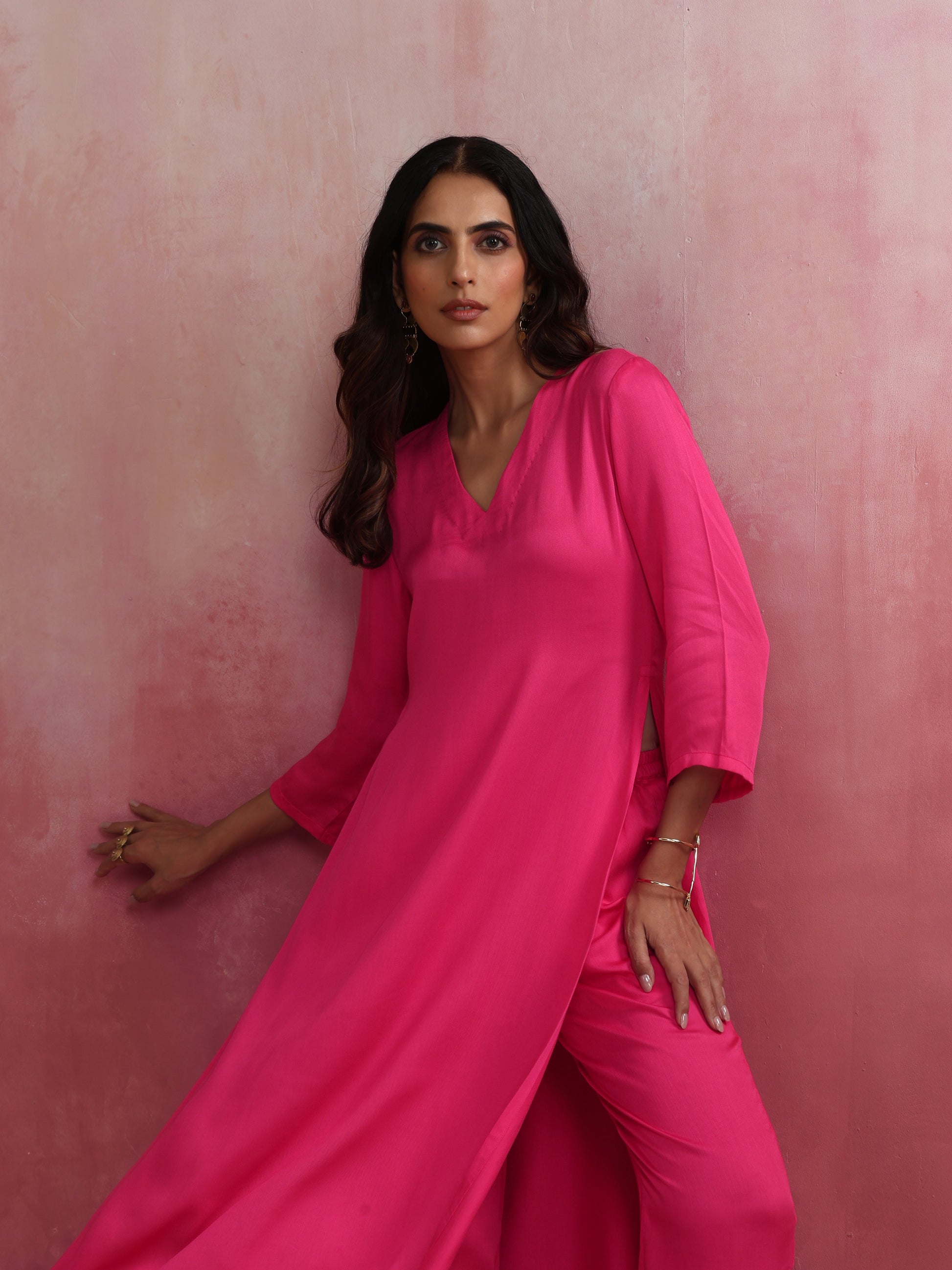 - Elevate your style with this pink modal kurta with high slit and V neckline.