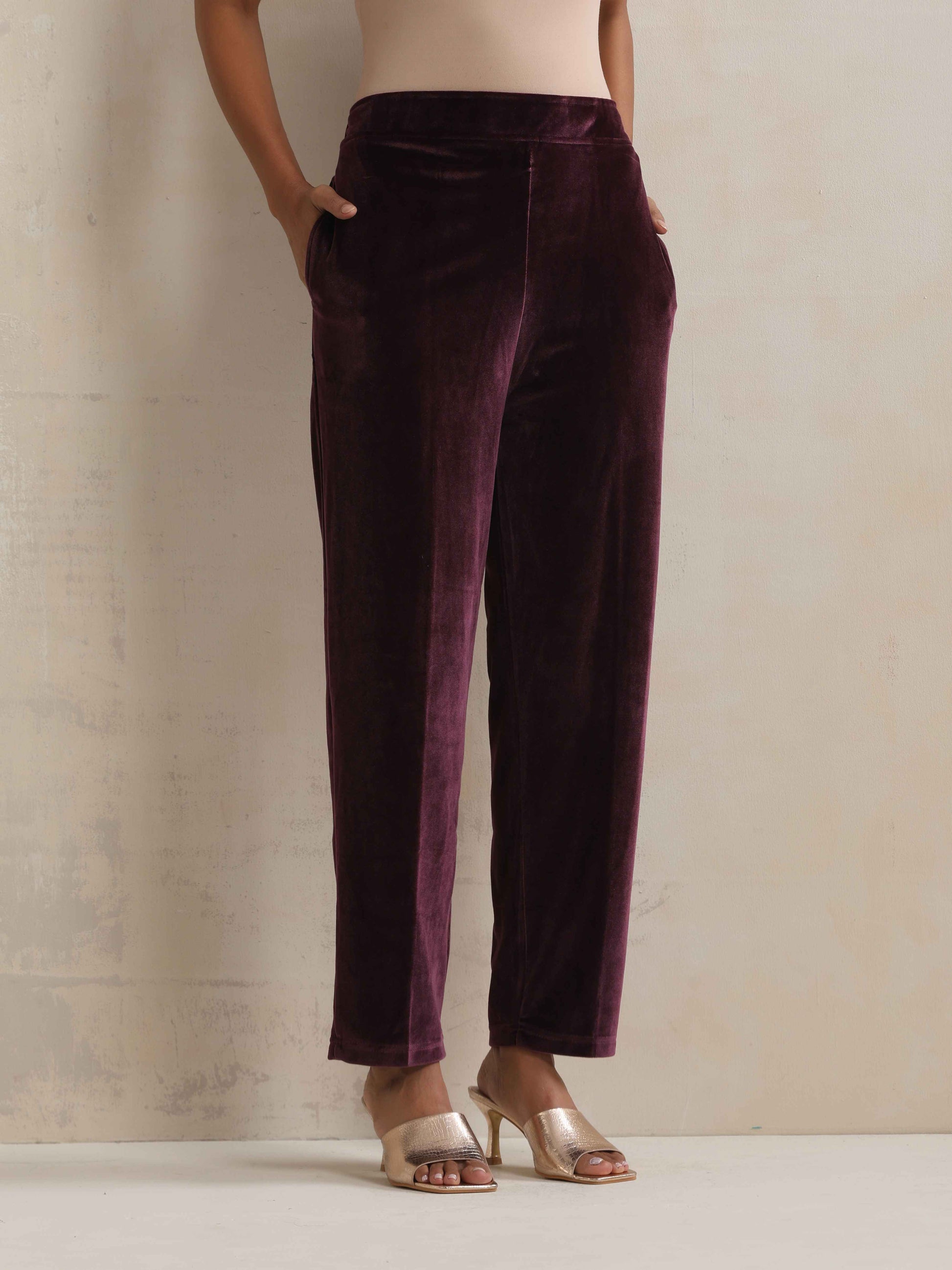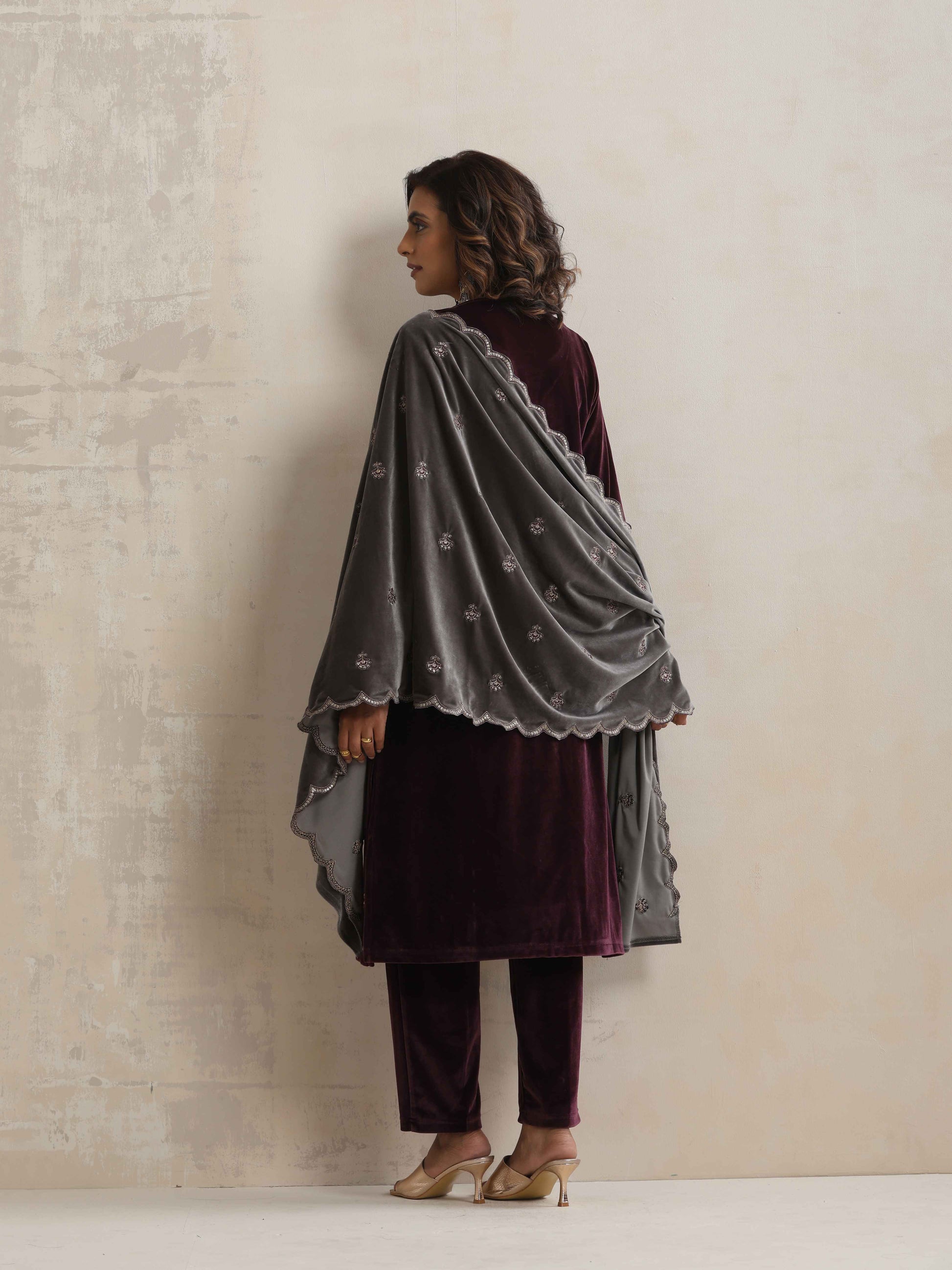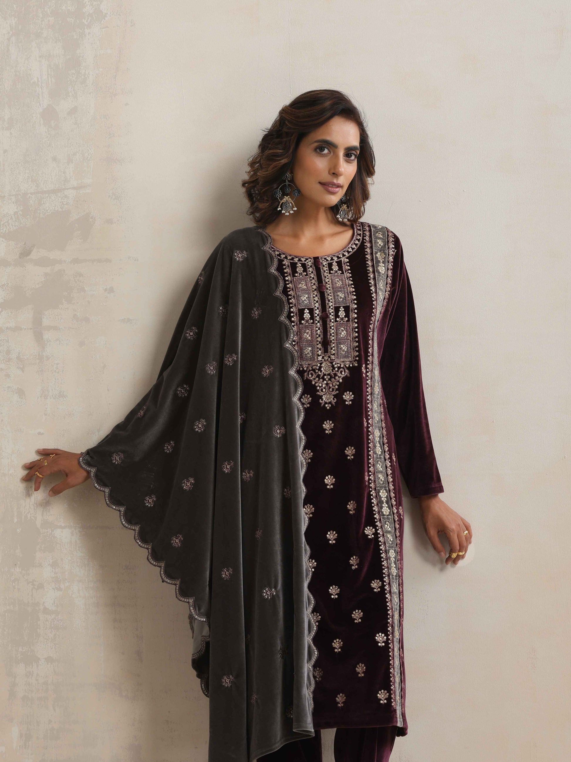 trueBrowns Purple Velvet Embroidered Kurta Pant Dupatta Set