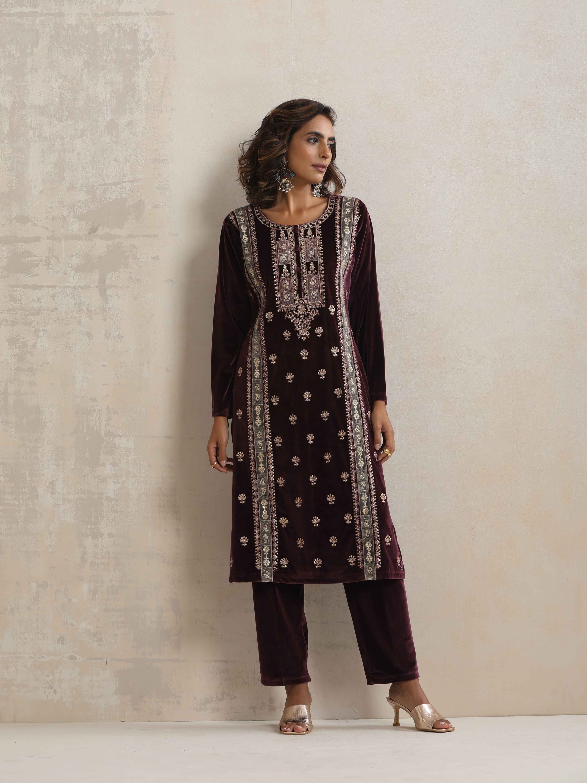 - Elevate your style with this purple velvet floral embroidered kurta pant dupatta set, it's an ideal blend of elegance and comfort.