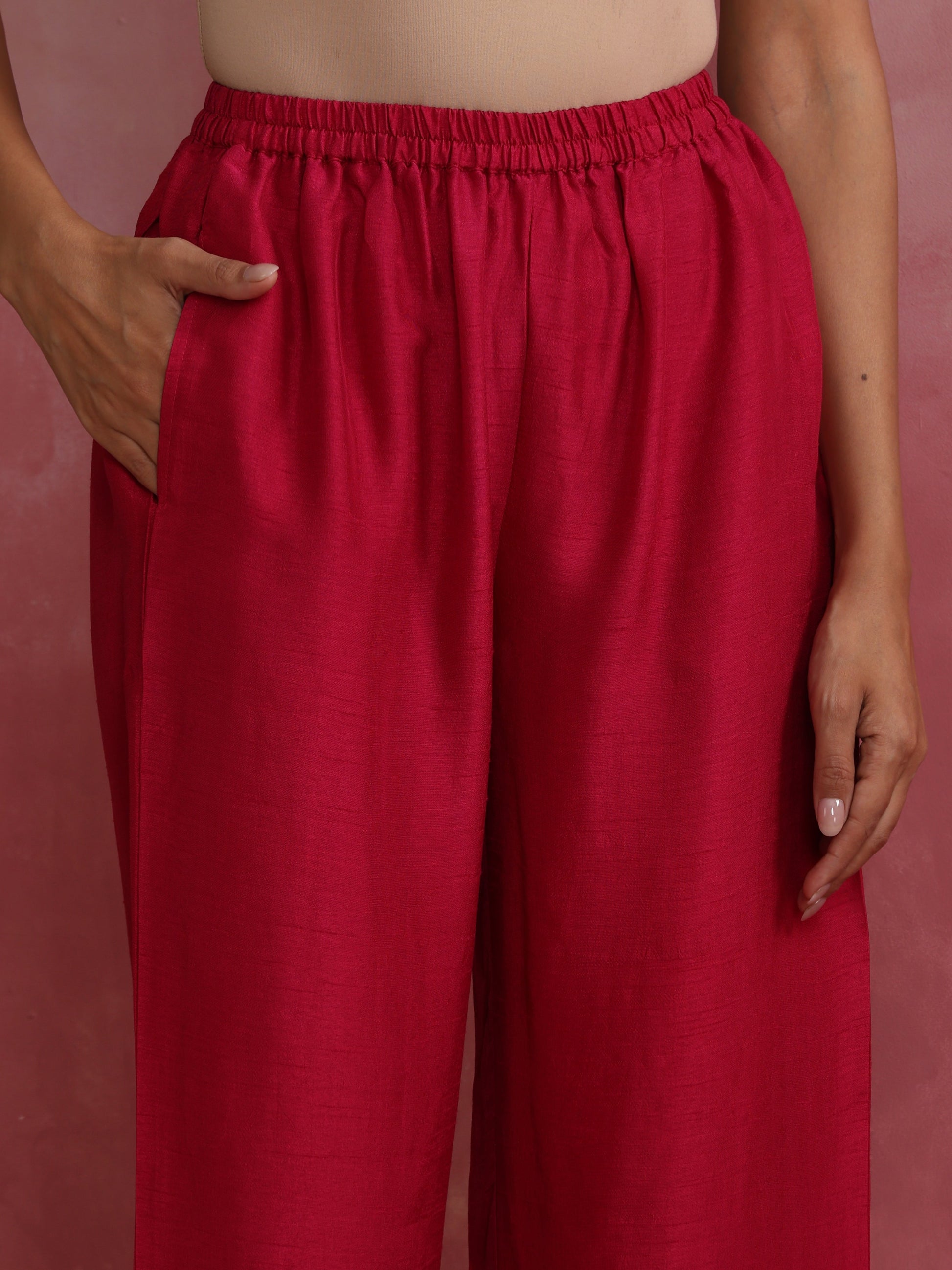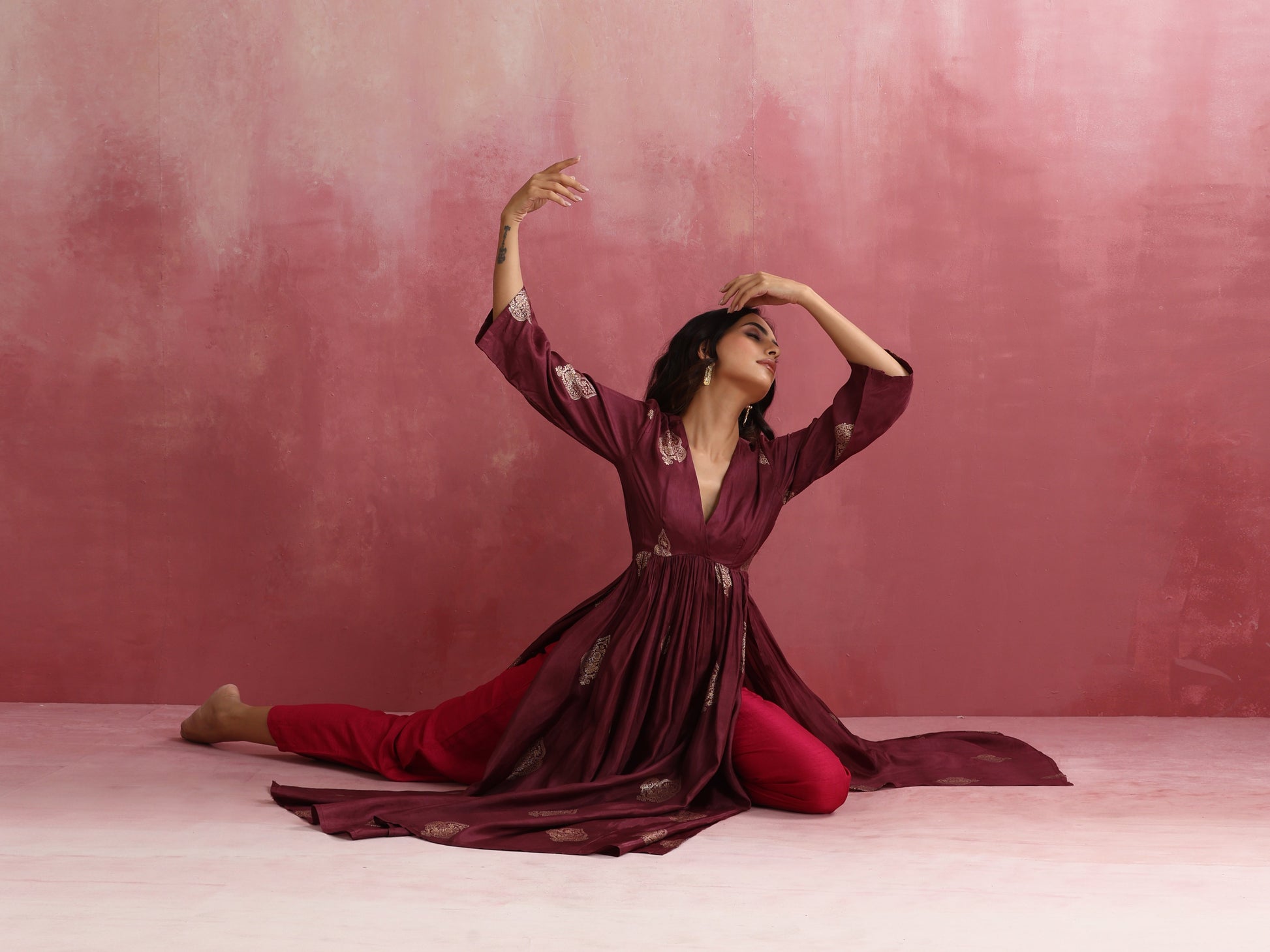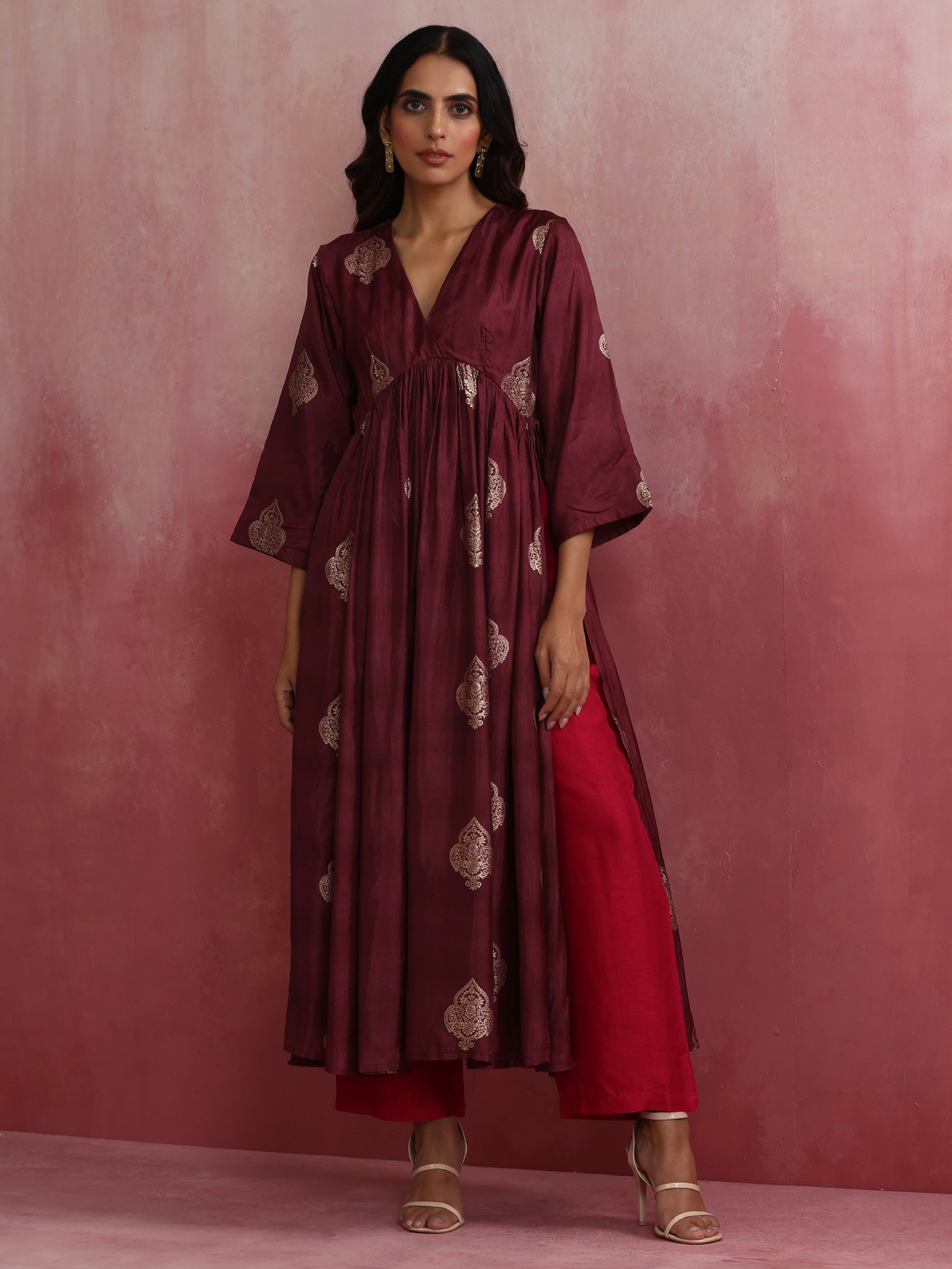 - Elevate your style with this purple viscose silk kurta with 3/4th sleeves.