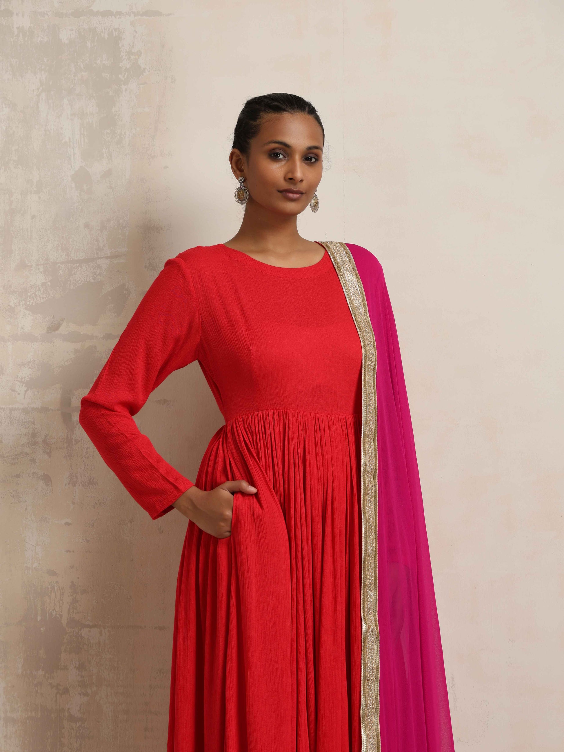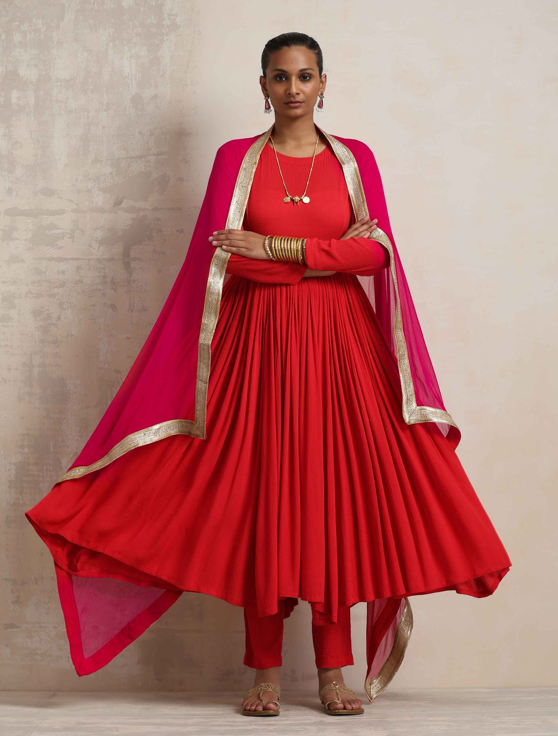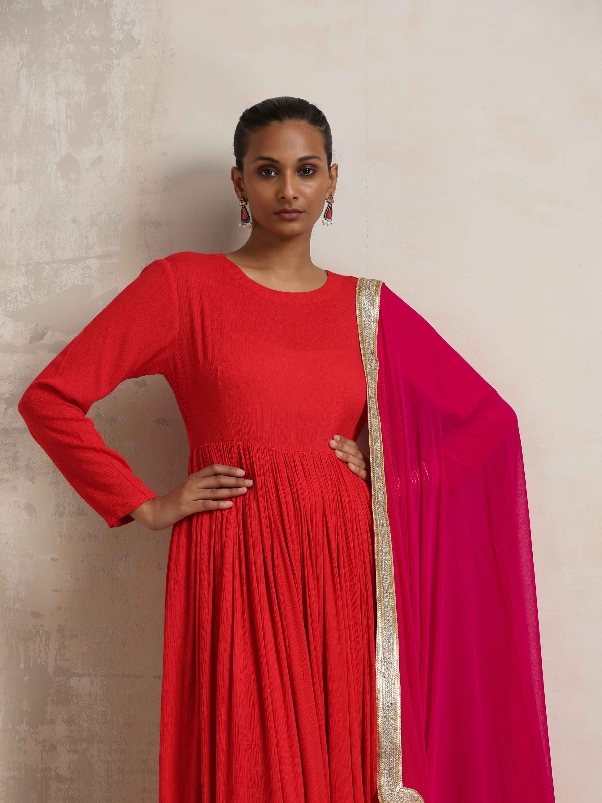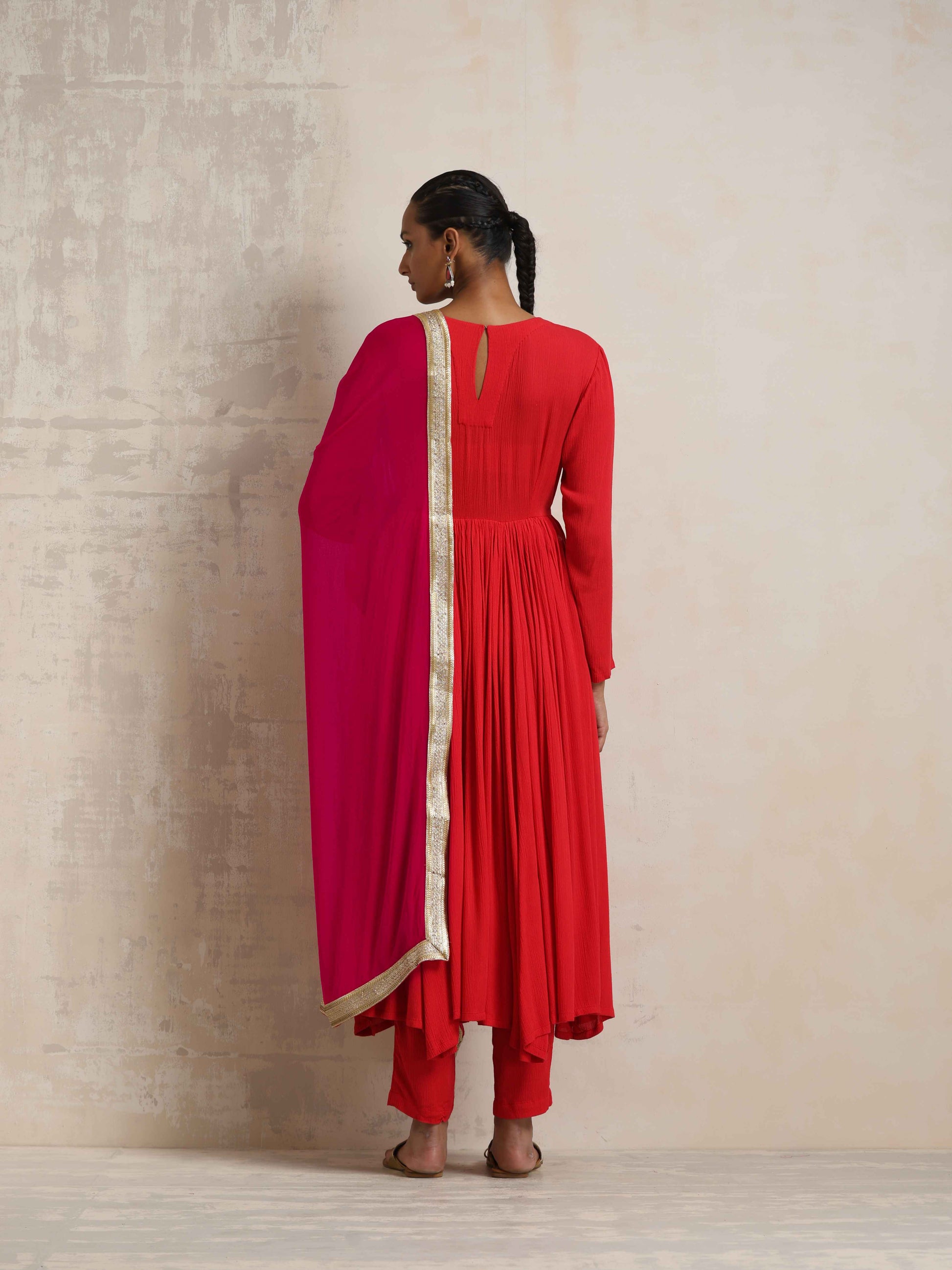 trueBrowns Red Crinkle Anarkali Kurta Pant Dupatta Set