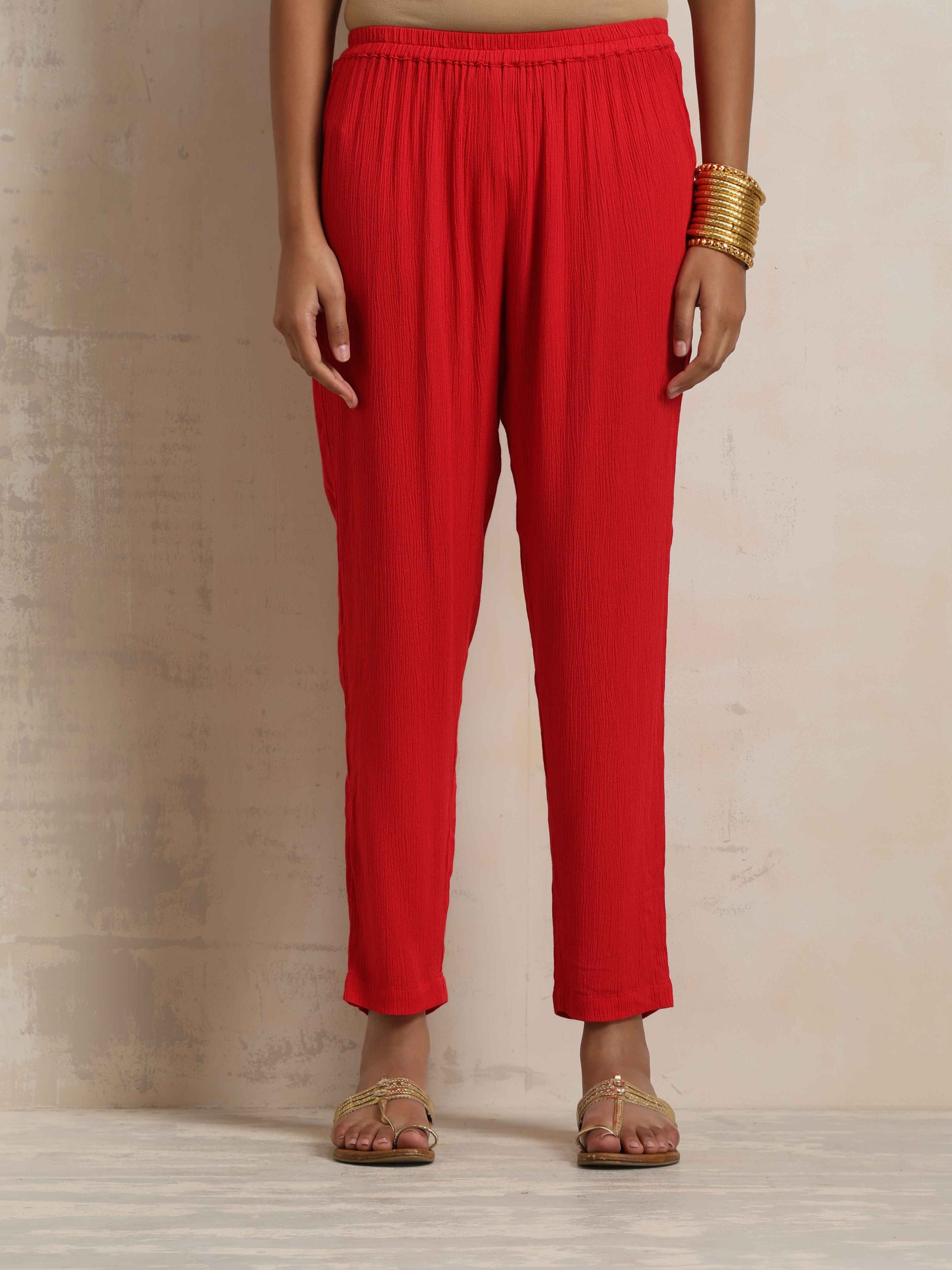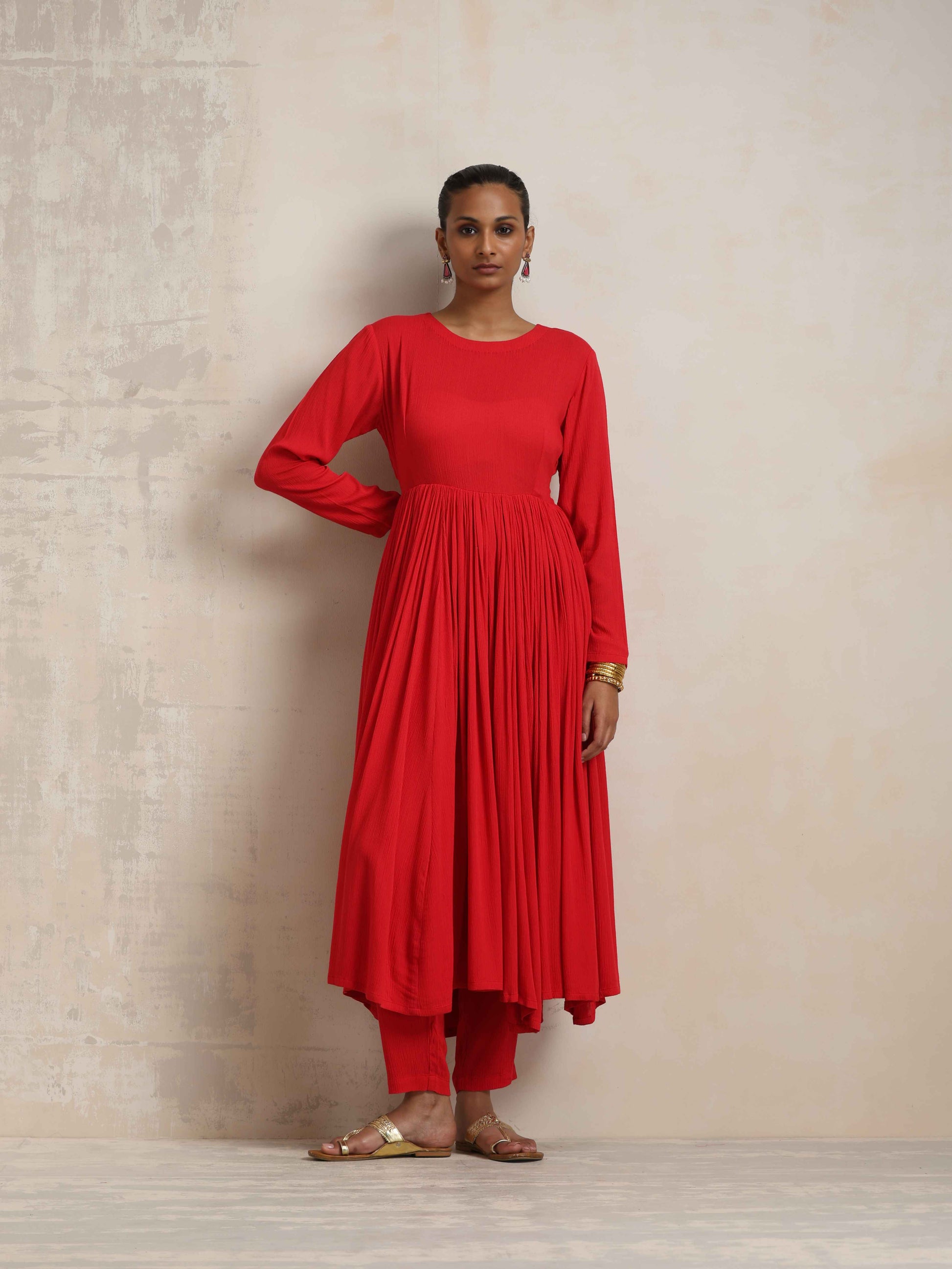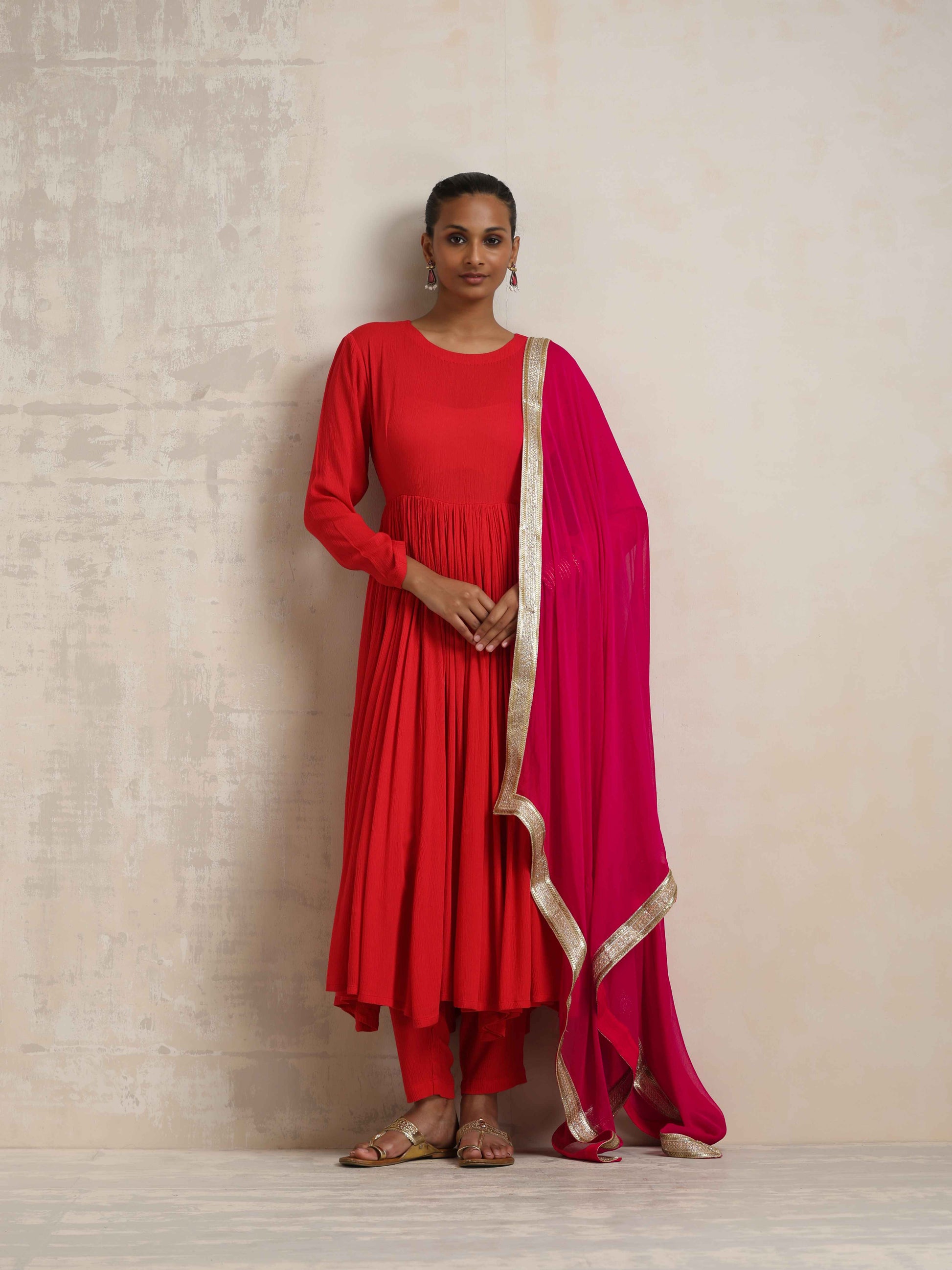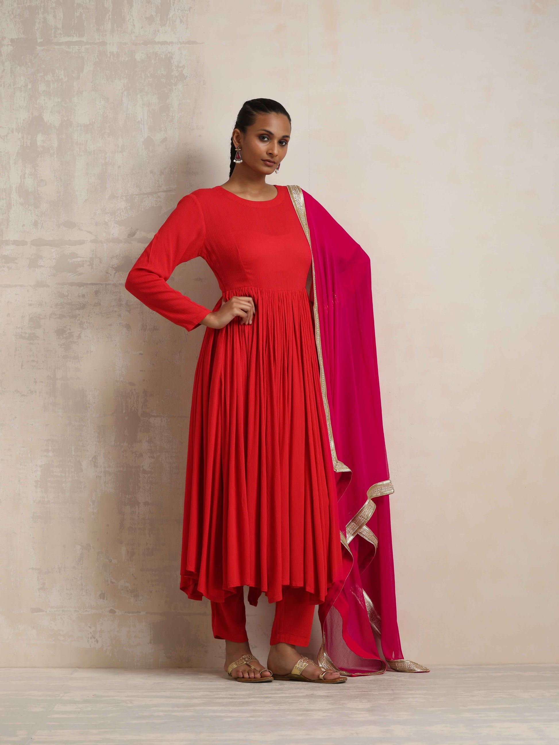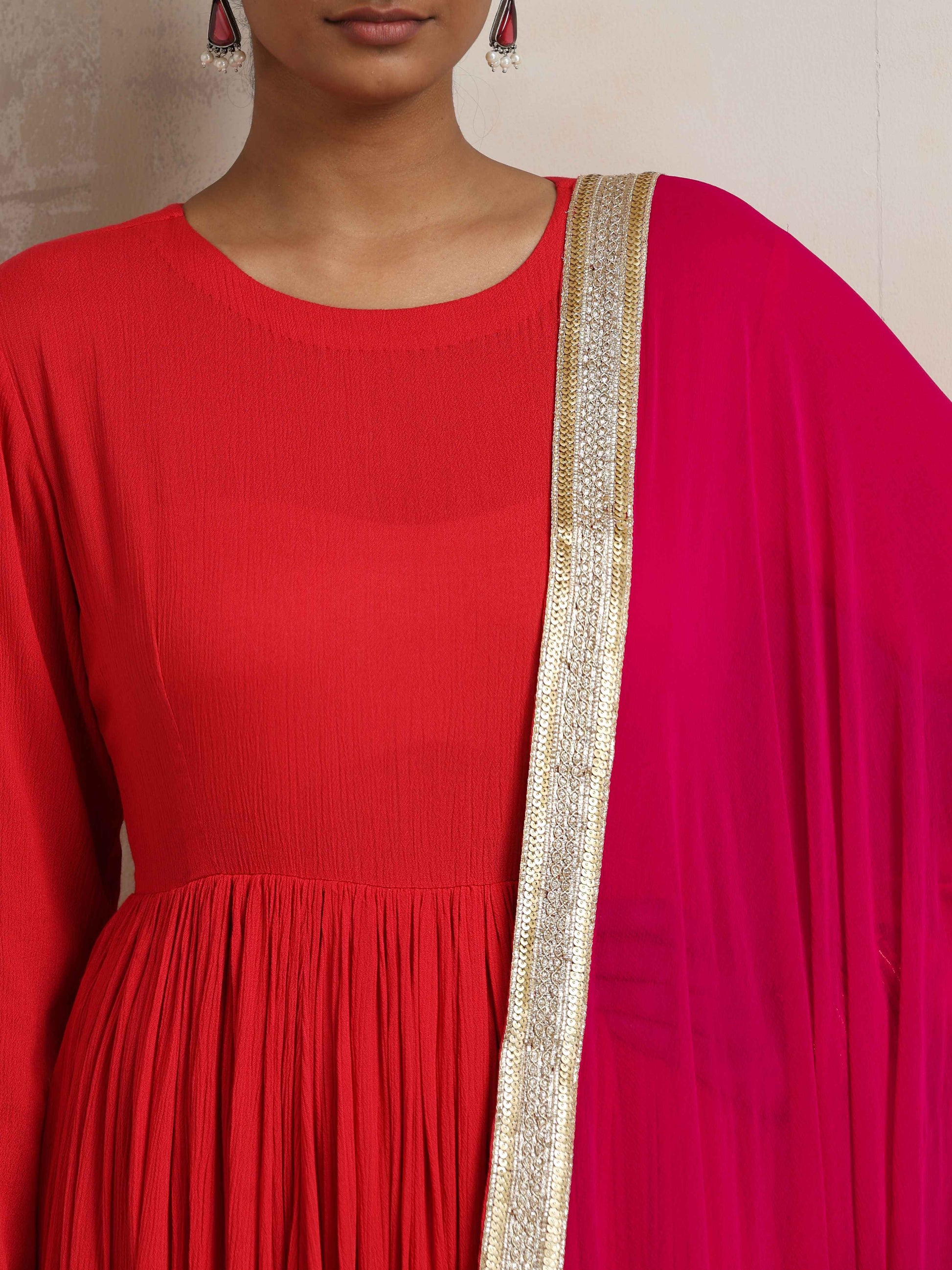 trueBrowns Red Crinkle Anarkali Kurta Pant Dupatta Set