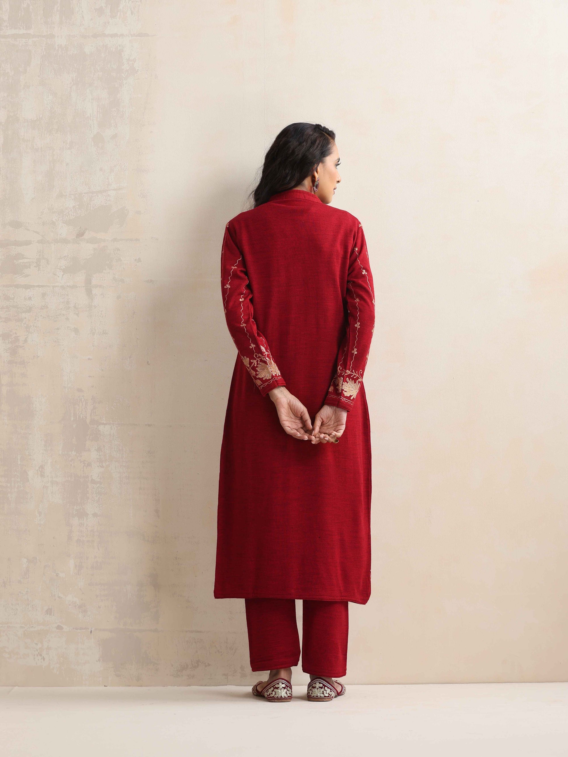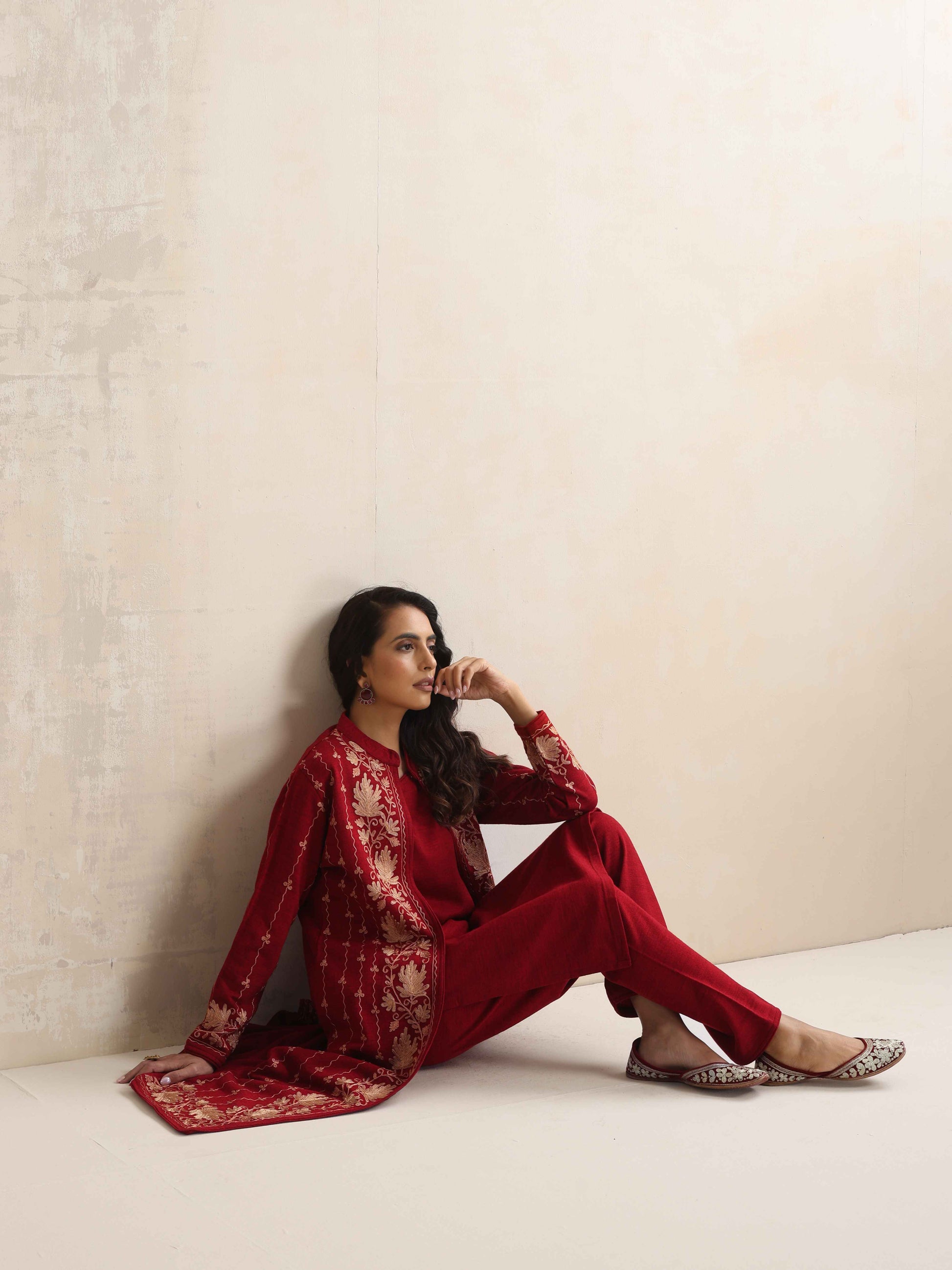 trueBrowns Red Kashmiri Woollen Jacket 3pc Set