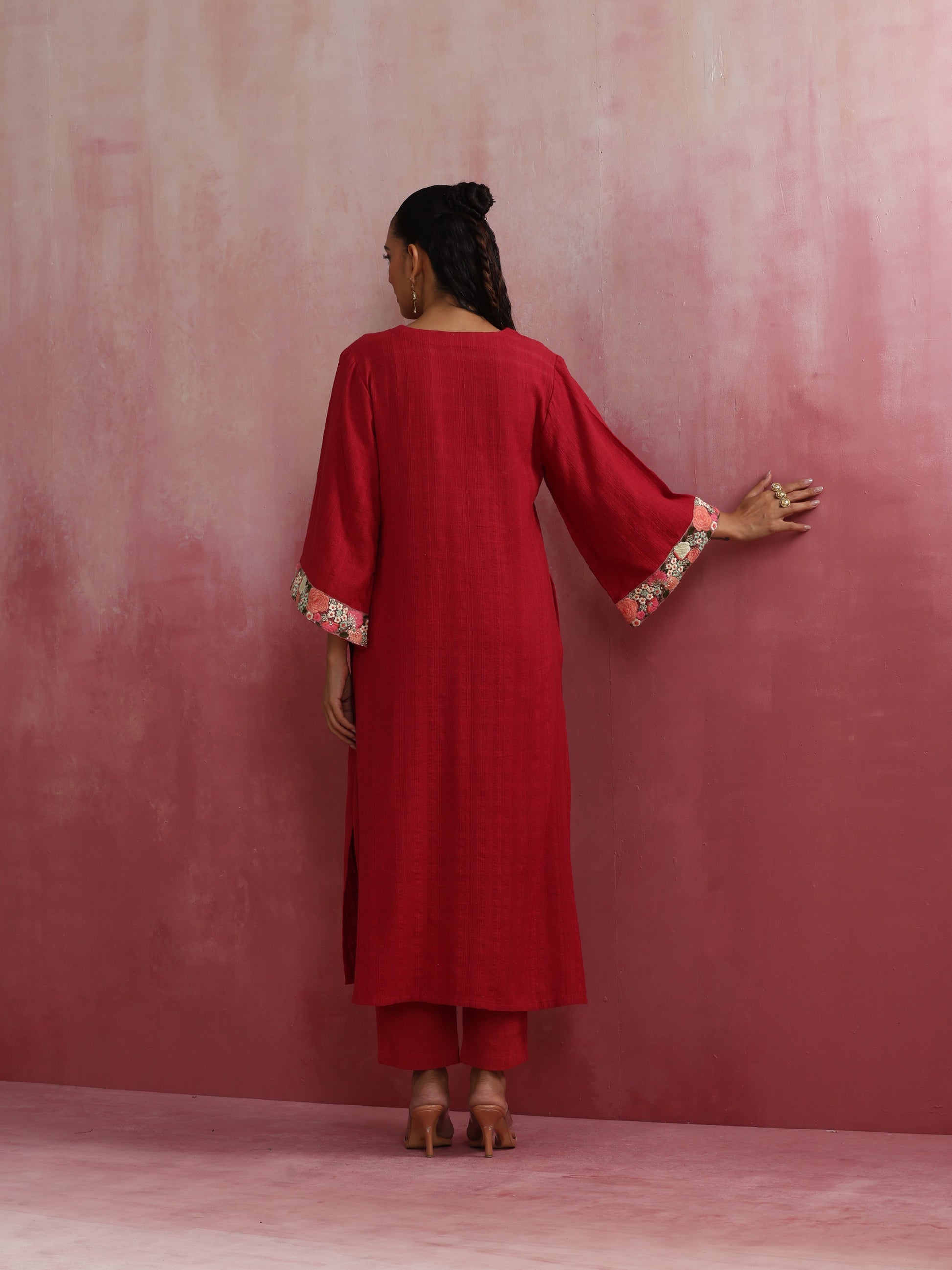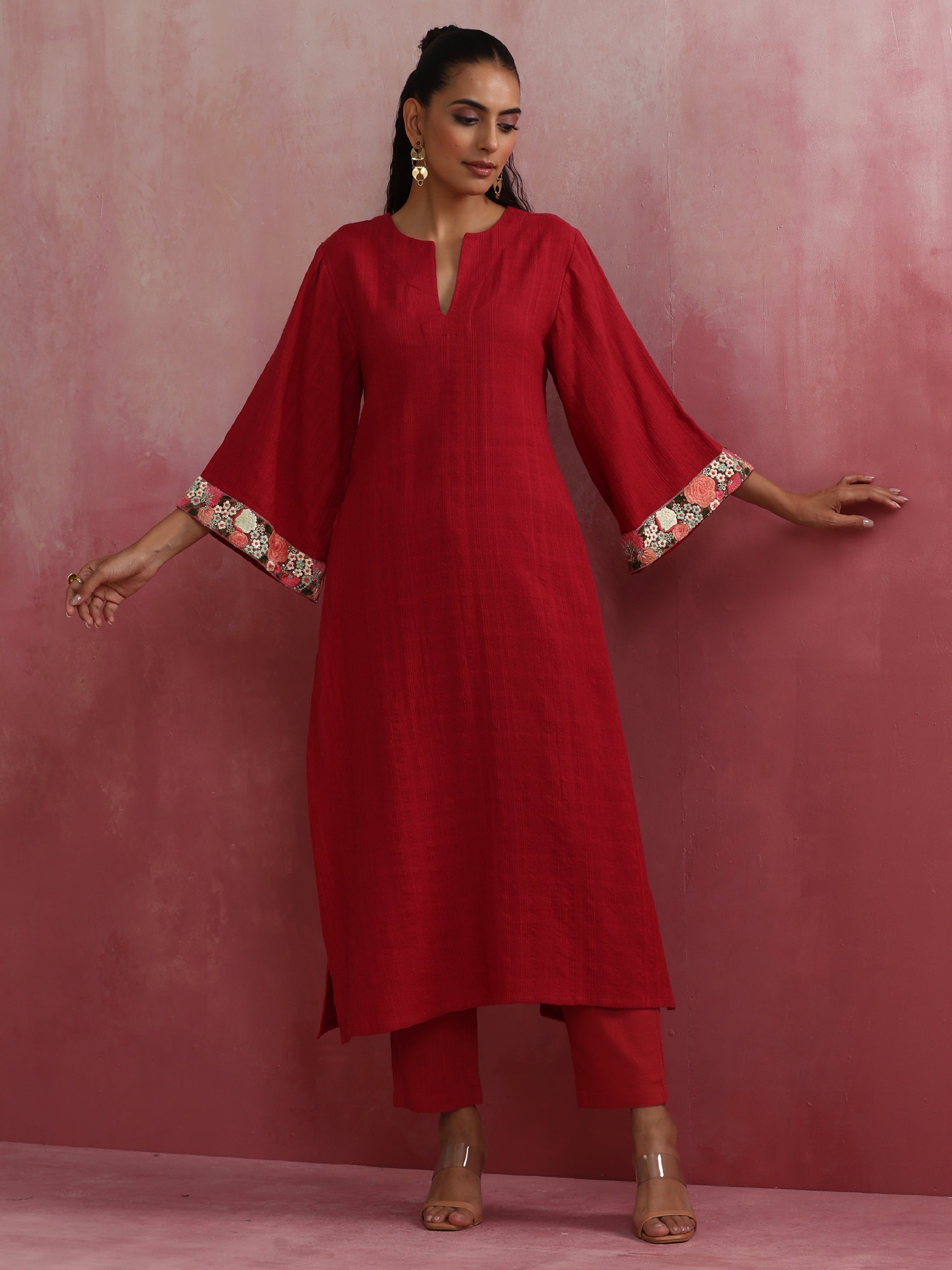 - Elevate your style with this red cotton dobby kurta with 3/4th sleeves.