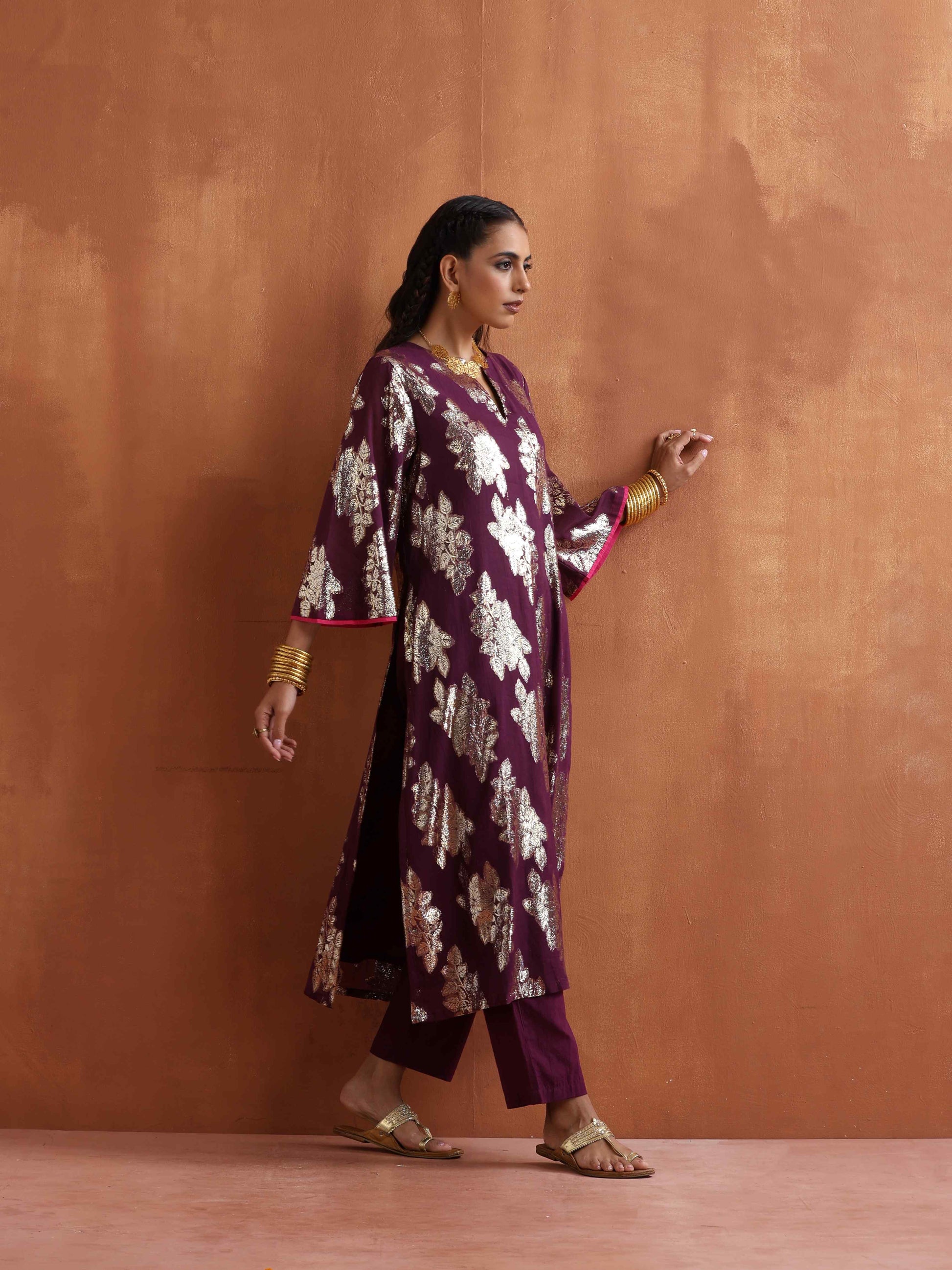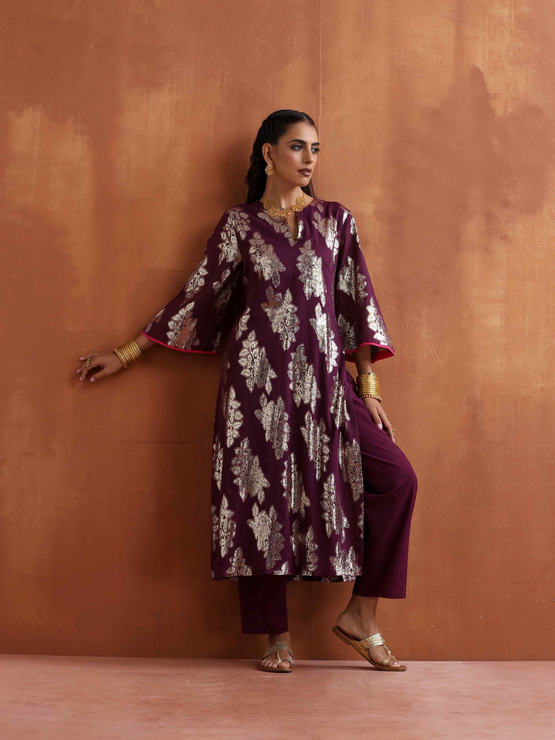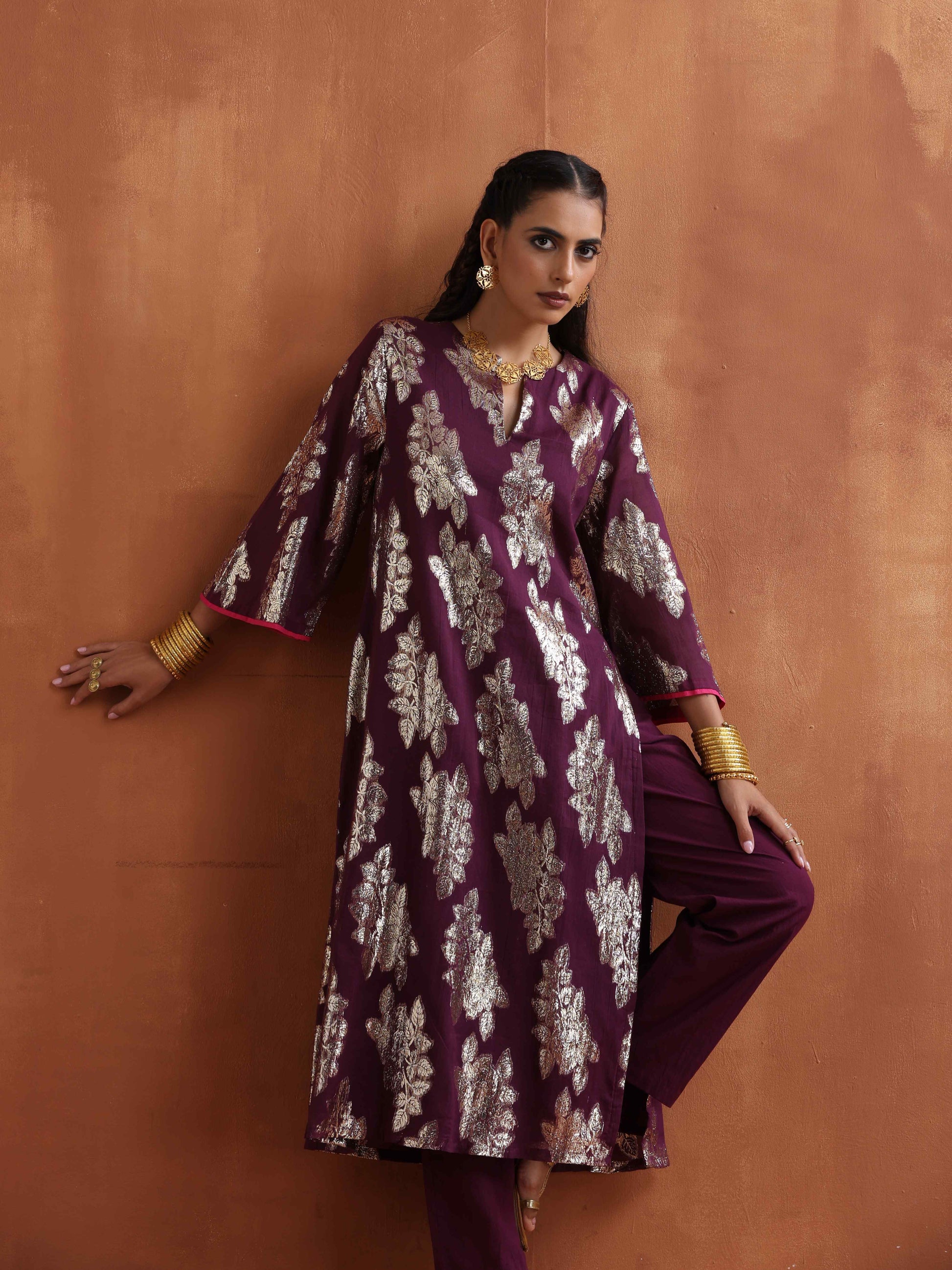 - Elevate your style with this purple metallic straight kurta paired with purple pant, it's an ideal blend of elegance and comfort.